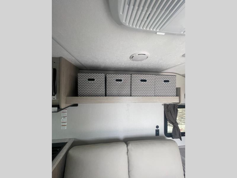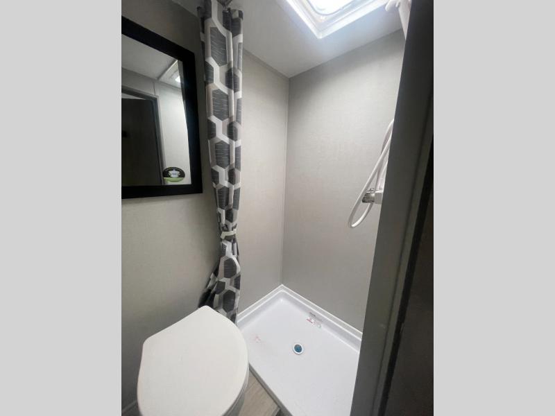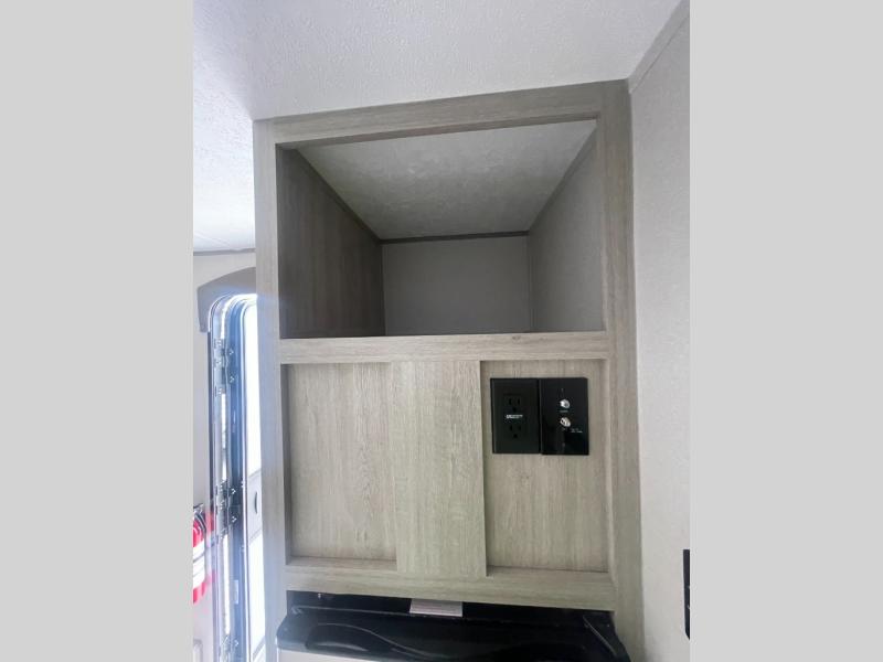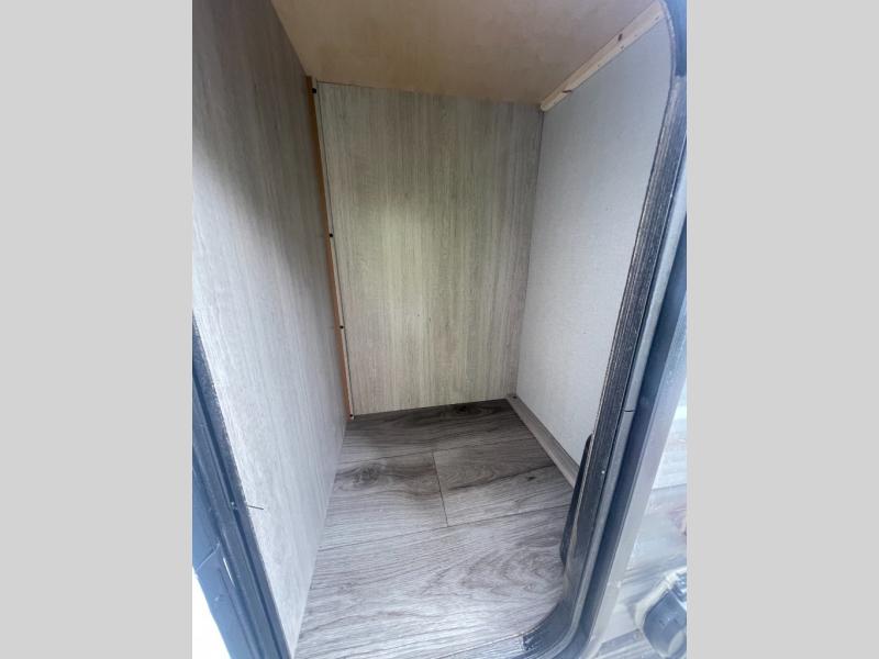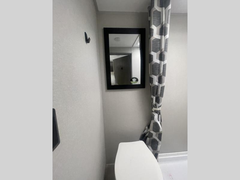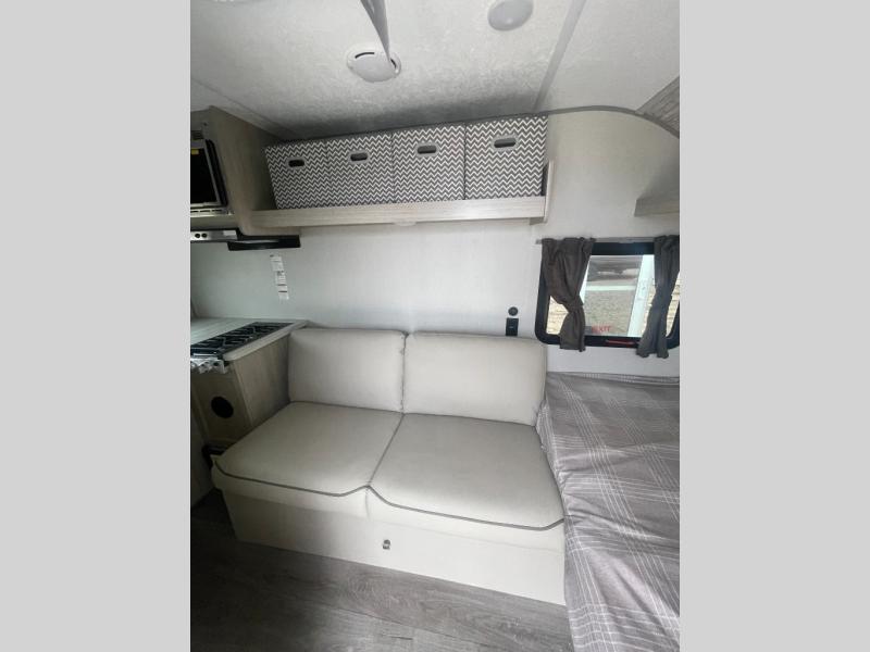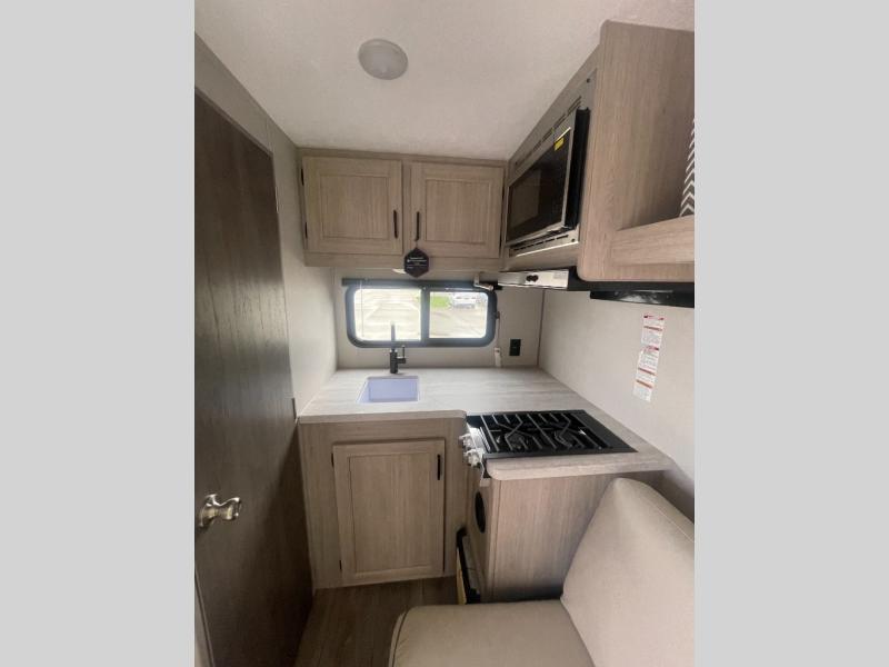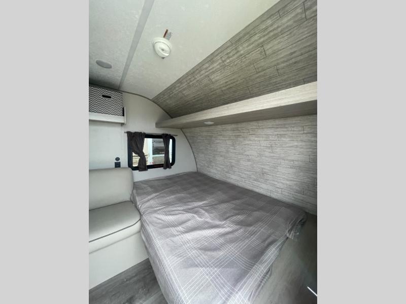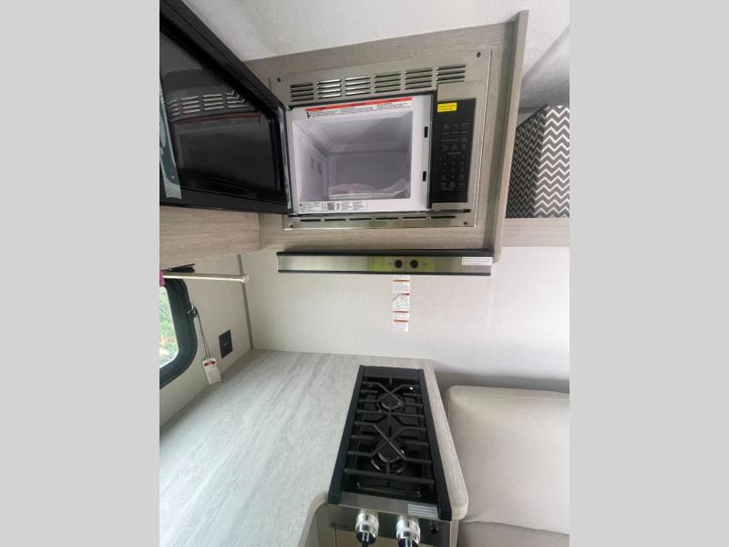 Lightweight camping is easier than you think with this travel trailer in tow! The front 54" x 74" queen bed will provide a great night's rest each night, while your overnight guest takes the 60" Jack knife sofa. There is a handy shelf above the front bed for your belongings plus a shelf with bins over the sofa. A private bath includes a 24" x 32" shower and a toilet with a mirror behind it so you can freshen up each day. You'll also find a two burner cooktop and microwave oven to make meals each day plus a 3.3 cu. ft. 12V refrigerator for food storage!