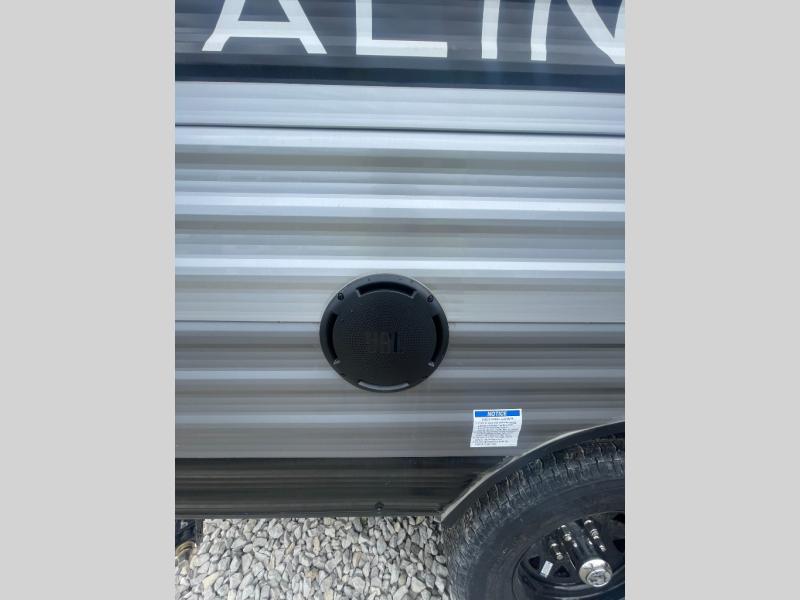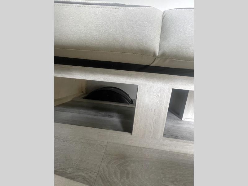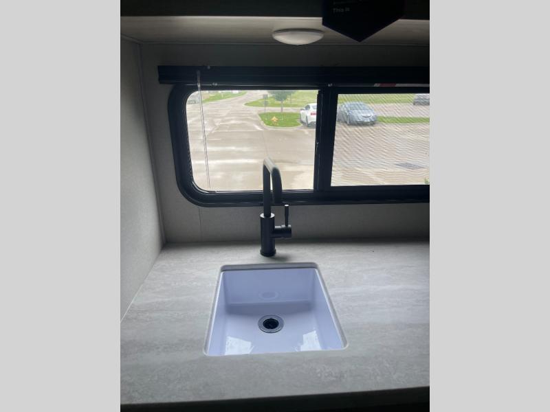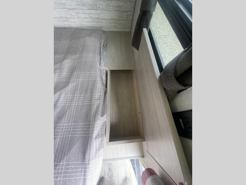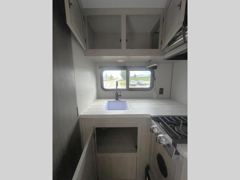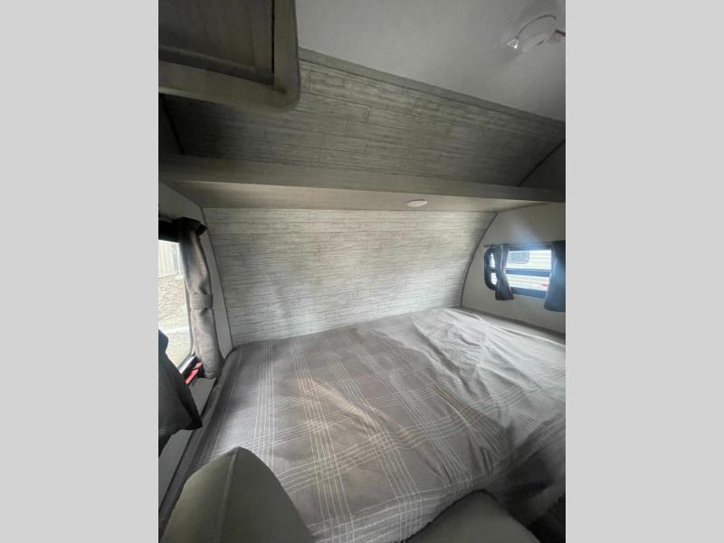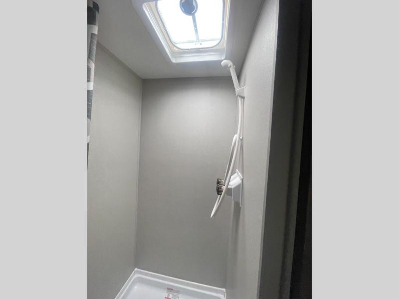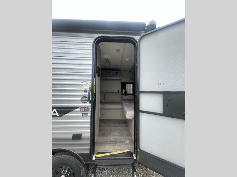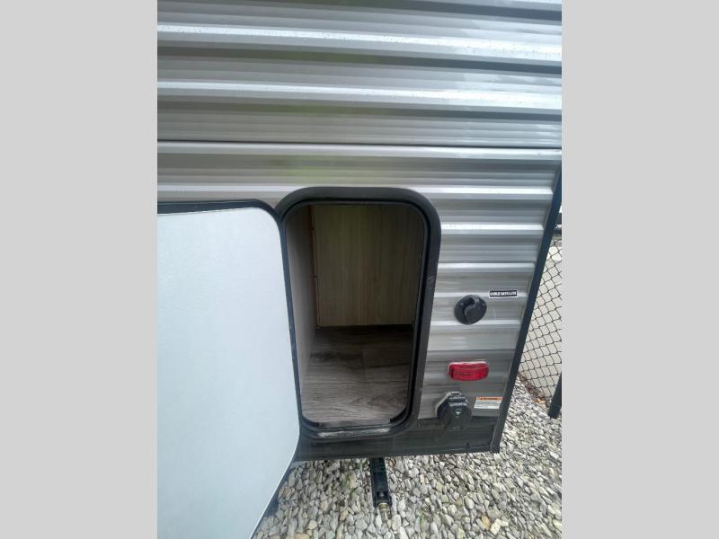 Lightweight camping is easier than you think with this travel trailer in tow! The front 54" x 74" queen bed will provide a great night's rest each night, while your overnight guest takes the 60" Jack knife sofa. There is a handy shelf above the front bed for your belongings plus a shelf with bins over the sofa. A private bath includes a 24" x 32" shower and a toilet with a mirror behind it so you can freshen up each day. You'll also find a two burner cooktop and microwave oven to make meals each day plus a 3.3 cu. ft. 12V refrigerator for food storage!