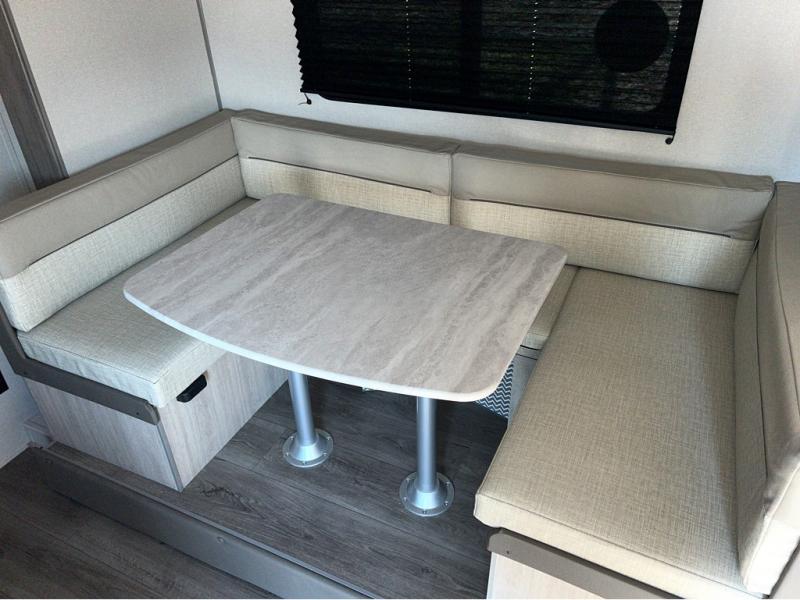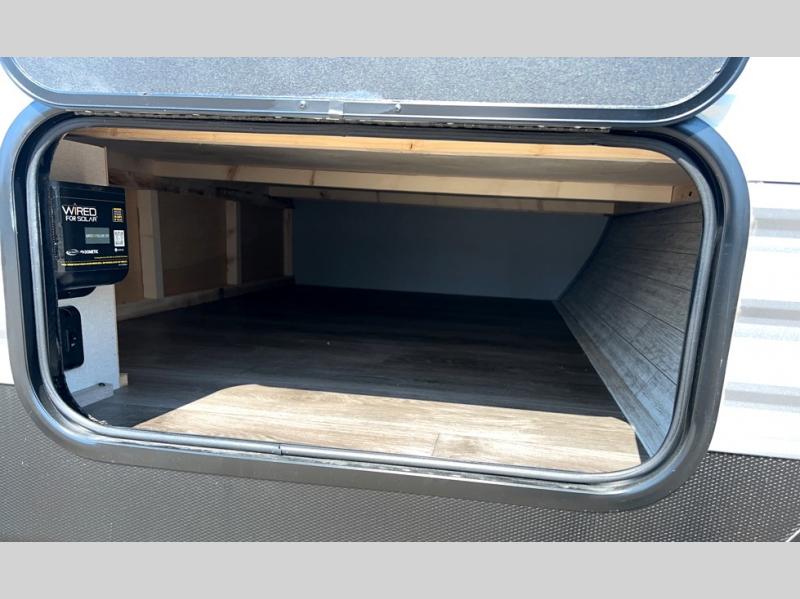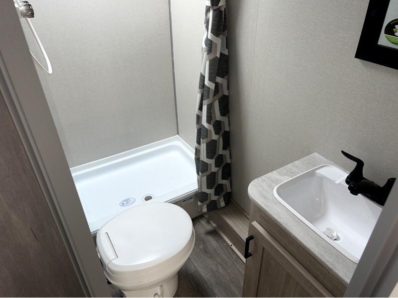 This spacious travel trailer can sleep eight campers each night thanks to the double-size bunks in the back, the U-shaped dinette within the slide out, and the queen bed up front! You can easily make meals for your crew with the two burner cooktop and microwave oven, and leftovers can go in the 10.7 cu. ft. 12V refrigerator! After you've cleaned up in the full bath, head outdoors to relax under the 15' power awning with multicolor LED lights and a remote!