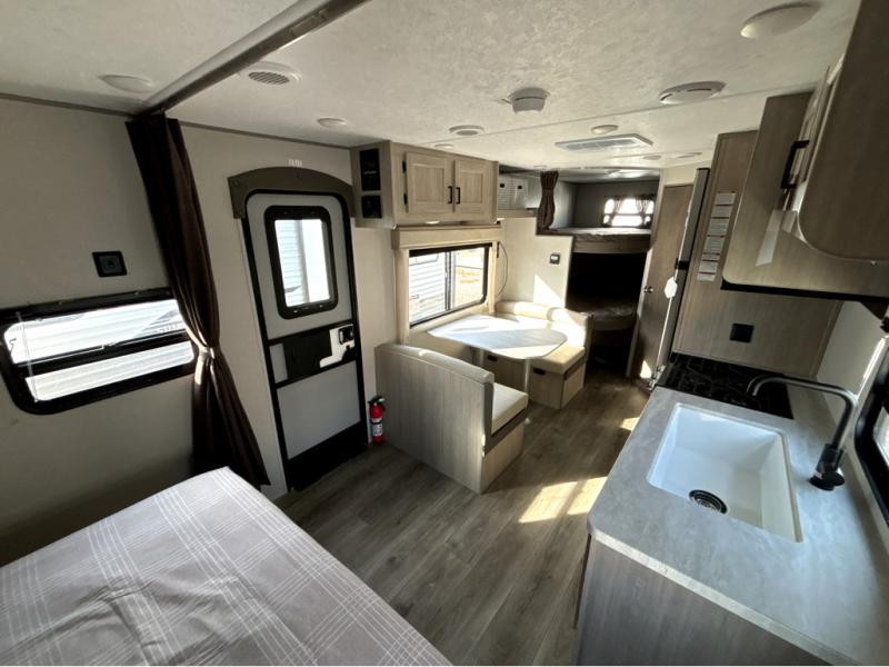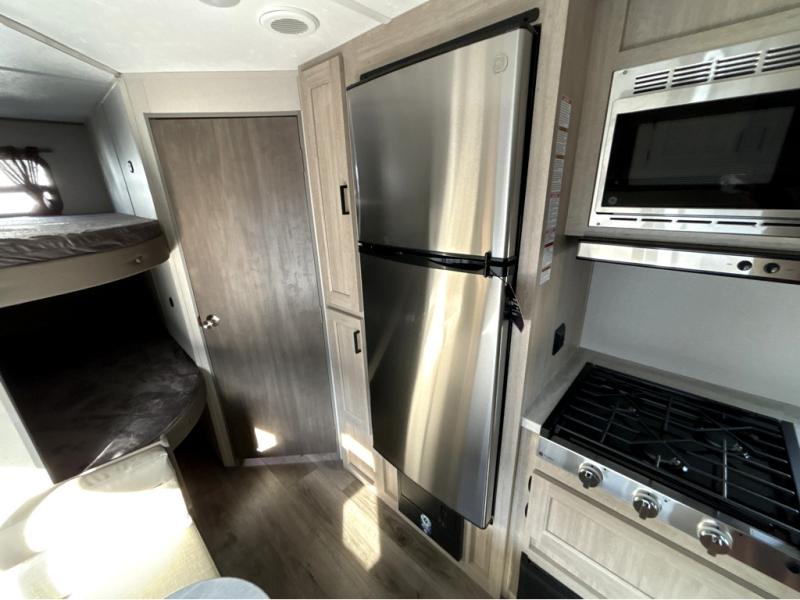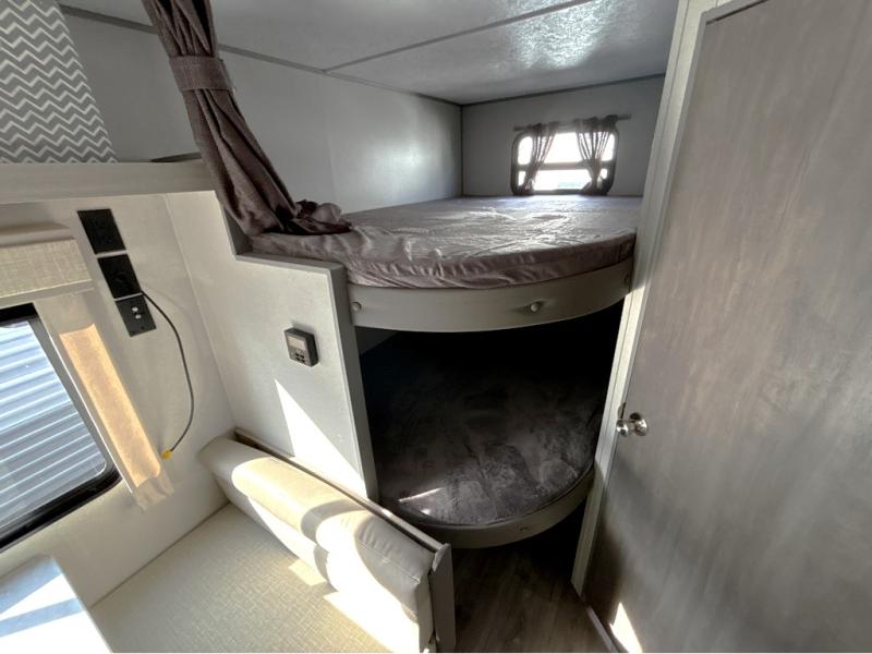 You'll love camping and spending time together in this travel trailer for seven! The bunk beds include under-bunk storage to keep bags out of the way, and the full bath is right next to the bunks for easy nighttime use. A semi-private bedroom up front includes a privacy curtain so you can get dressed each morning, and there are dual wardrobes to keep your things tidy. The chef of your group can whip up breakfast each morning on the three burner cooktop or in the GE stainless microwave, and there is a GE 10.7 cu. ft. 12V refrigerator to keep perishables fresh! A booth dinette provides a place to dine, or you can take your plate outdoors to sit under the 15' power awning with multicolored lights!
