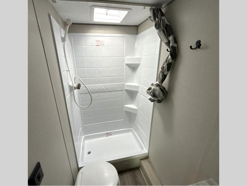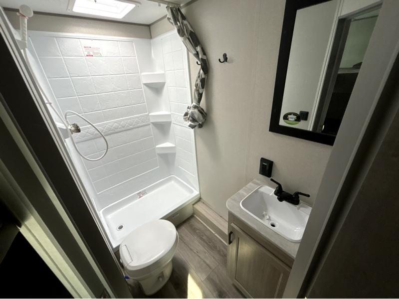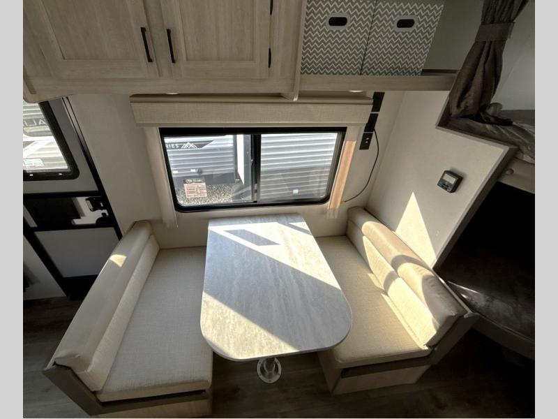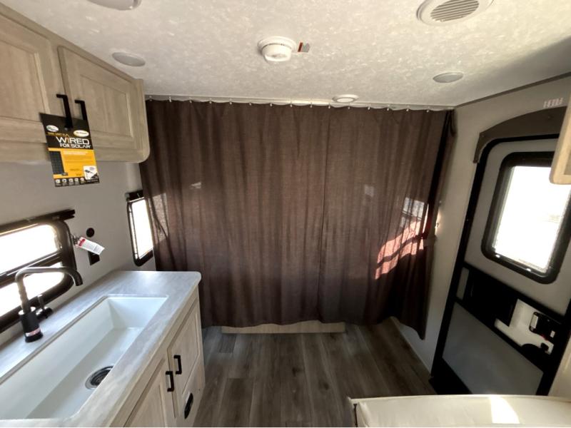 You'll love camping and spending time together in this travel trailer for seven! The bunk beds include under-bunk storage to keep bags out of the way, and the full bath is right next to the bunks for easy nighttime use. A semi-private bedroom up front includes a privacy curtain so you can get dressed each morning, and there are dual wardrobes to keep your things tidy. The chef of your group can whip up breakfast each morning on the three burner cooktop or in the GE stainless microwave, and there is a GE 10.7 cu. ft. 12V refrigerator to keep perishables fresh! A booth dinette provides a place to dine, or you can take your plate outdoors to sit under the 15' power awning with multicolored lights!