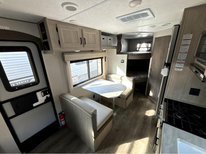 You'll love camping and spending time together in this travel trailer for seven! The bunk beds include under-bunk storage to keep bags out of the way, and the full bath is right next to the bunks for easy nighttime use. A semi-private bedroom up front includes a privacy curtain so you can get dressed each morning, and there are dual wardrobes to keep your things tidy. The chef of your group can whip up breakfast each morning on the three burner cooktop or in the GE stainless microwave, and there is a GE 10.7 cu. ft. 12V refrigerator to keep perishables fresh! A booth dinette provides a place to dine, or you can take your plate outdoors to sit under the 15' power awning with multicolored lights!