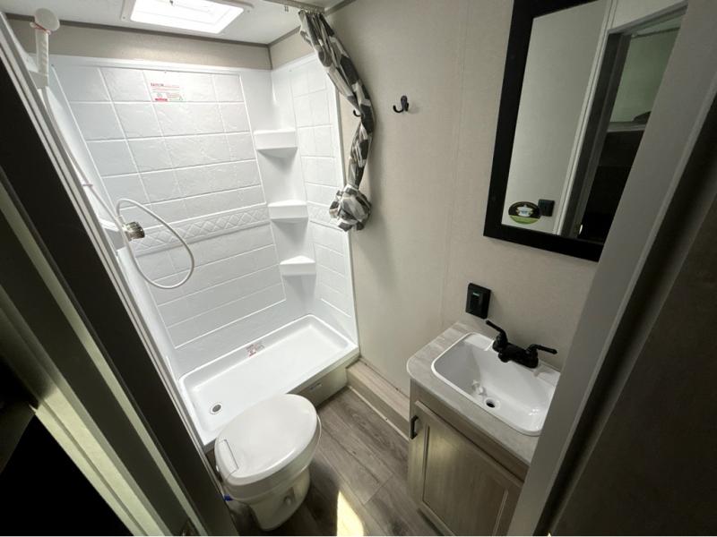 You'll love camping and spending time together in this travel trailer for seven! The bunk beds include under-bunk storage to keep bags out of the way, and the full bath is right next to the bunks for easy nighttime use. A semi-private bedroom up front includes a privacy curtain so you can get dressed each morning, and there are dual wardrobes to keep your things tidy. The chef of your group can whip up breakfast each morning on the three burner cooktop or in the GE stainless microwave, and there is a GE 10.7 cu. ft. 12V refrigerator to keep perishables fresh! A booth dinette provides a place to dine, or you can take your plate outdoors to sit under the 15' power awning with multicolored lights!