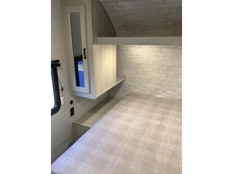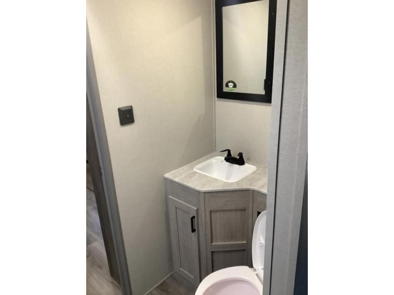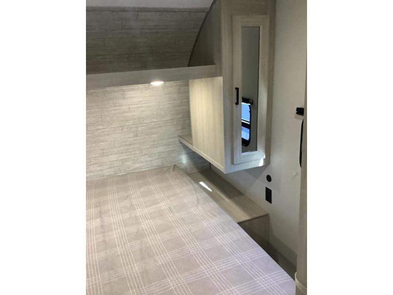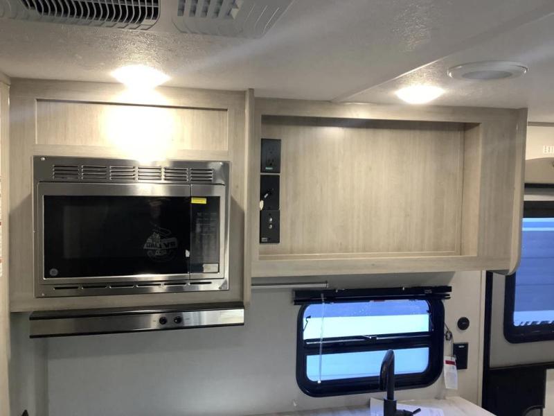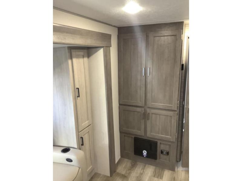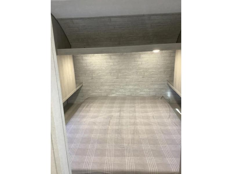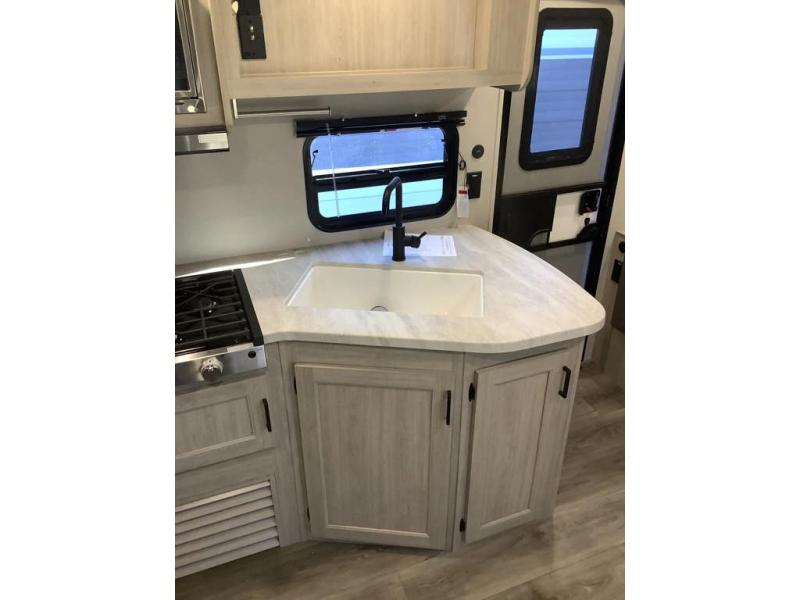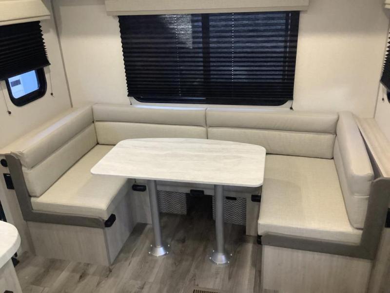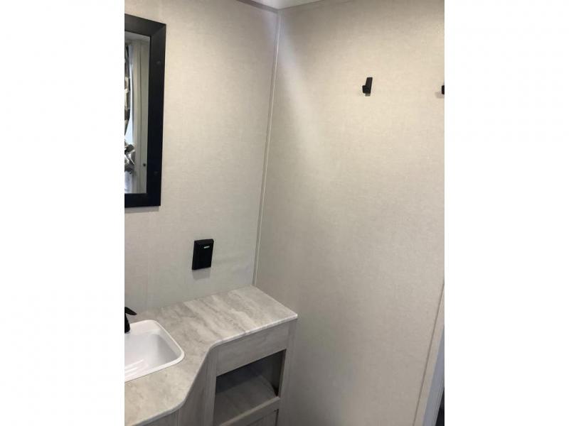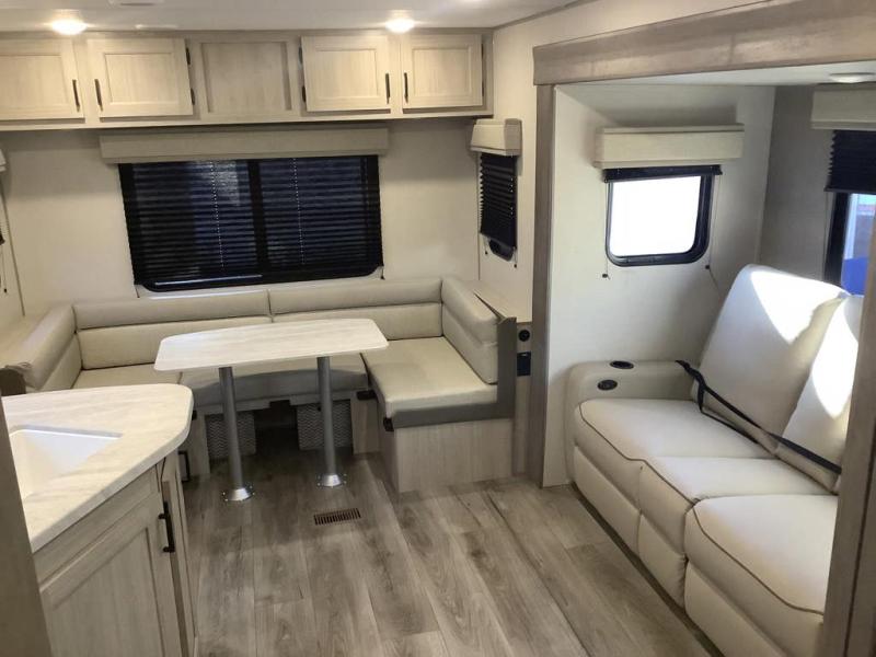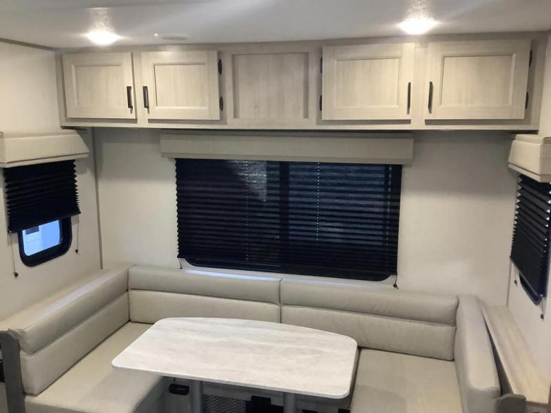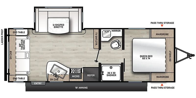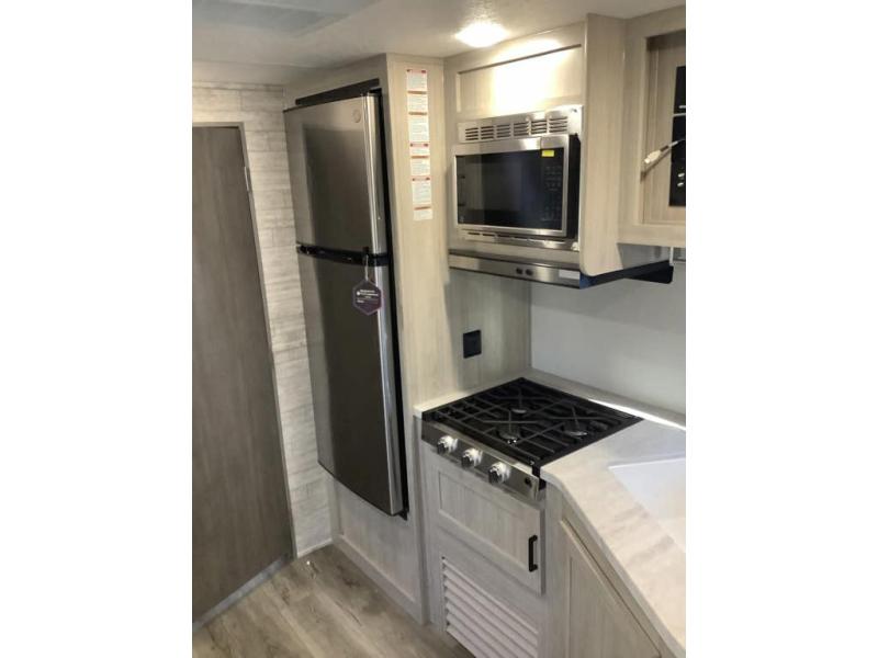 You and your spouse will love the layout of this trailer with a walk-through bathroom which is convenient for you when you are in the front bedroom, and handy for your guests when they stay overnight on the U-shaped dinette. The 68" theater seating includes dual end tables to set your drink on, and the U-shaped dinette will be perfect to dine around or play games at. The galley kitchen offers all the appliances needed to make all your meals, such as a GE stainless three burner cooktop, a GE stainless microwave, plus a GE stainless10.7 cu. ft. 12V refrigerator. You will have your own side of the walk-around queen bed and a wardrobe, as well as USB ports and 110V outlets in the nightstands.