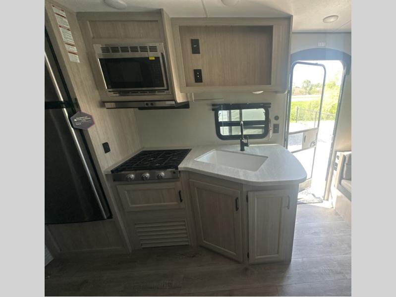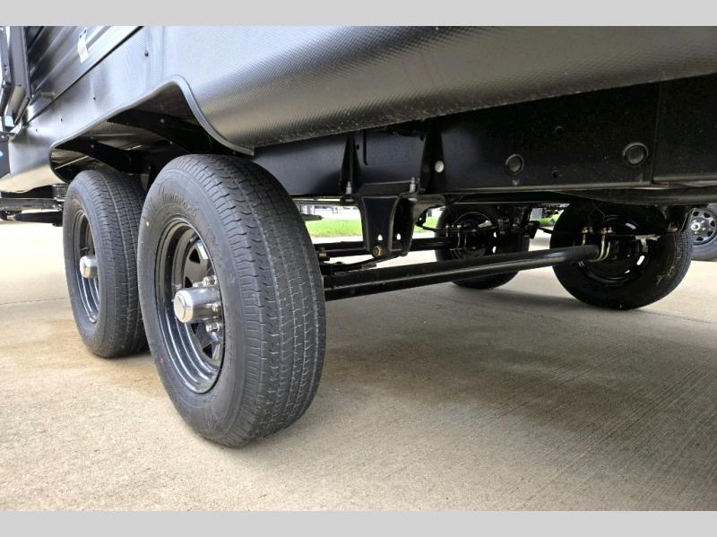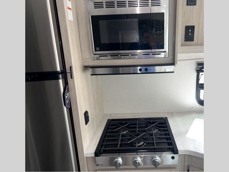 You and your spouse will love the layout of this trailer with a walk-through bathroom which is convenient for you when you are in the front bedroom, and handy for your guests when they stay overnight on the U-shaped dinette. The rear U-shaped dinette includes dual end tables to set your drink on, and the theater seating within the slide out will let you relax each evening. The galley kitchen offers all the appliances needed to make all your meals, such as a GE stainless three burner cooktop, a GE stainless microwave, plus a GE stainless 10.7 cu. ft. 12V refrigerator. You will have your own side of the walk-around queen bed and a wardrobe, as well as USB ports and 110V outlets in the nightstands.
