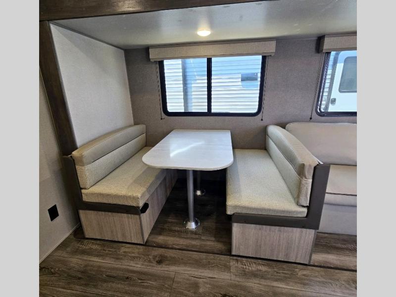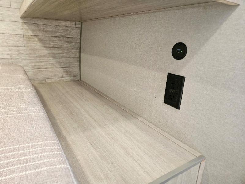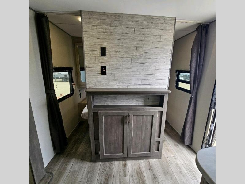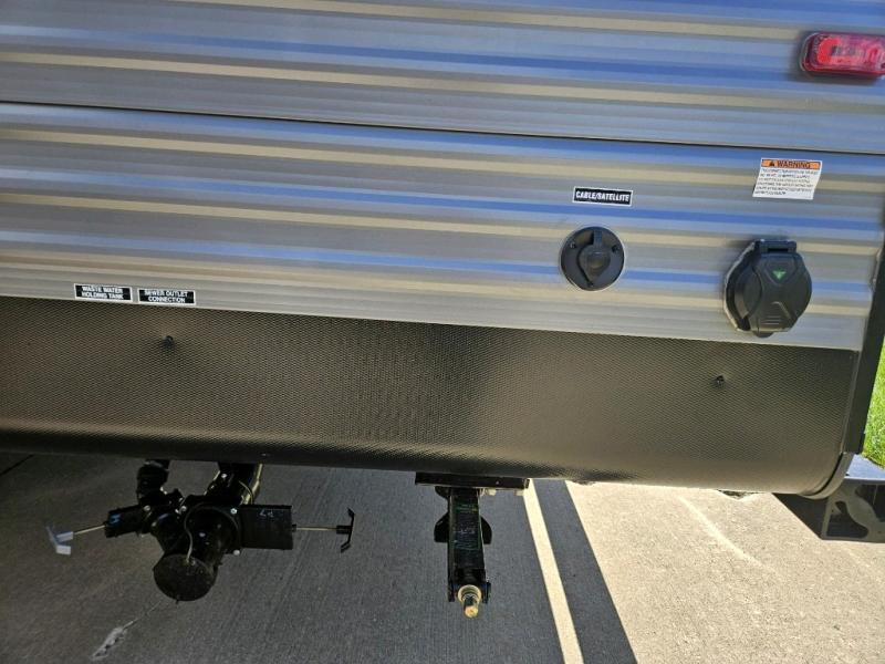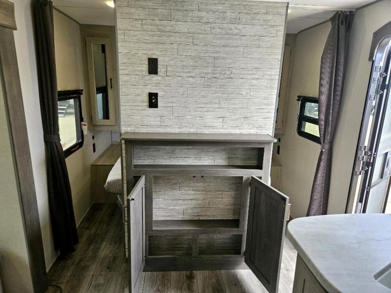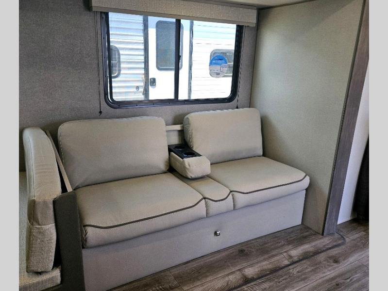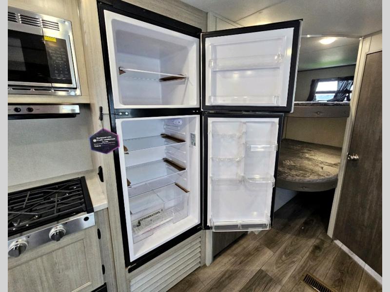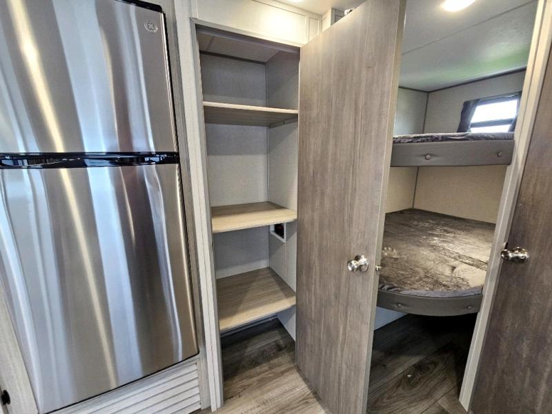 This is the perfect mid-size travel trailer for you and your family! The 46" x 74" double-size bunk beds with lower interior storage offer a comfortable sleeping space for the kids and you will have your own private sleeping space with the 60" x 74" queen bed in the front private bedroom. Freshen up each morning in the rear corner bathroom with the tub/shower and a mirror to get ready each morning. You can prepare your best home cooked meals with the GE stainless three burner cooktop and GE stainless 10.7 cu. ft. 12V refrigerator, then enjoy them together at the booth dinette. The sofa is near the entertainment center for a relaxing movie night. You don't need to leave any of your outdoor gear behind thanks to the front pass-through storage area and the exterior outside storage areas.