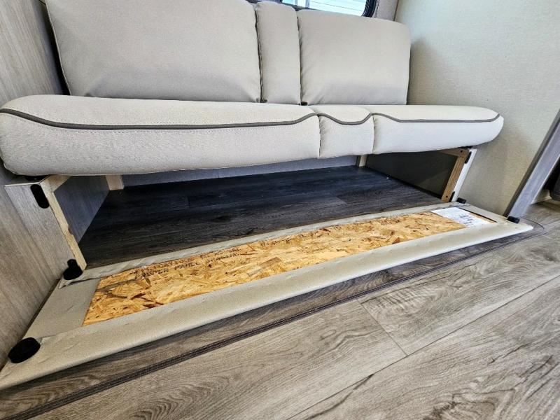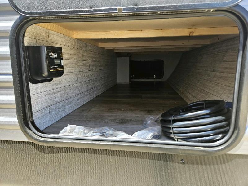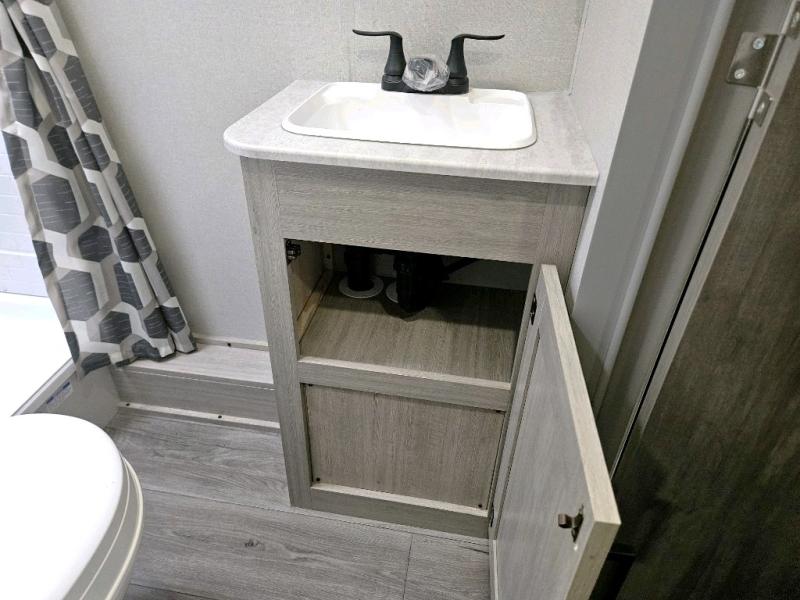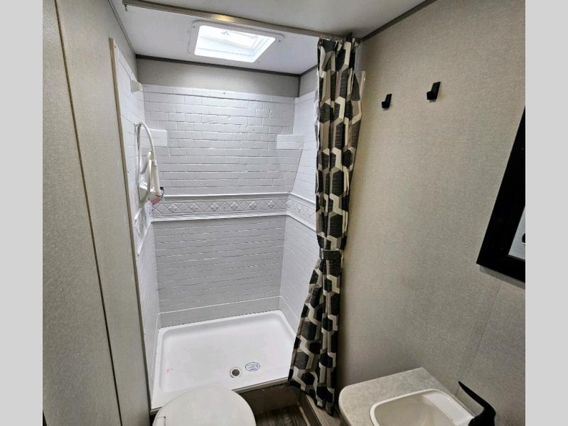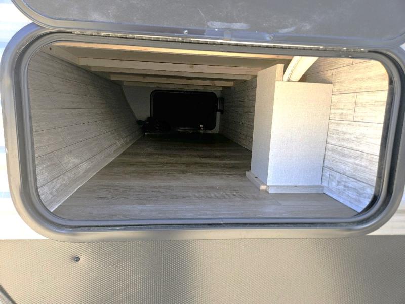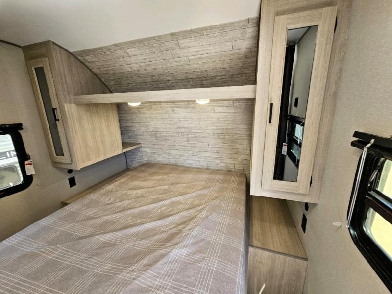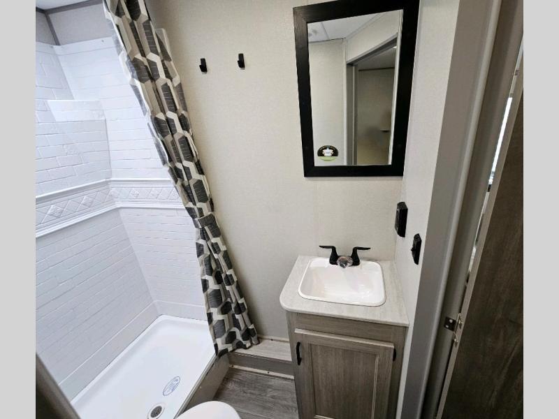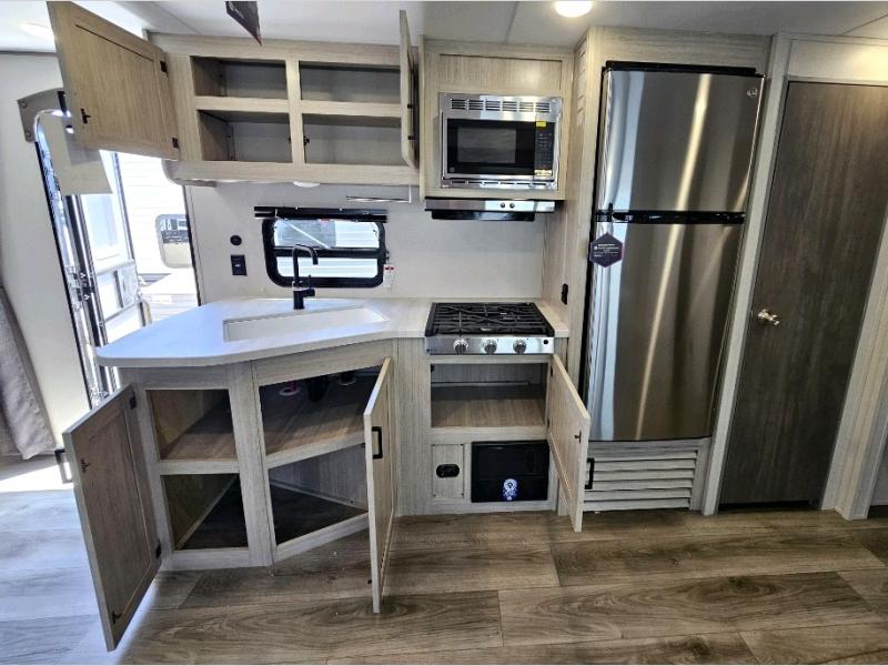 This is the perfect mid-size travel trailer for you and your family! The 46" x 74" double-size bunk beds with lower interior storage offer a comfortable sleeping space for the kids and you will have your own private sleeping space with the 60" x 74" queen bed in the front private bedroom. Freshen up each morning in the rear corner bathroom with the tub/shower and a mirror to get ready each morning. You can prepare your best home cooked meals with the GE stainless three burner cooktop and GE stainless 10.7 cu. ft. 12V refrigerator, then enjoy them together at the booth dinette. The sofa is near the entertainment center for a relaxing movie night. You don't need to leave any of your outdoor gear behind thanks to the front pass-through storage area and the exterior outside storage areas.