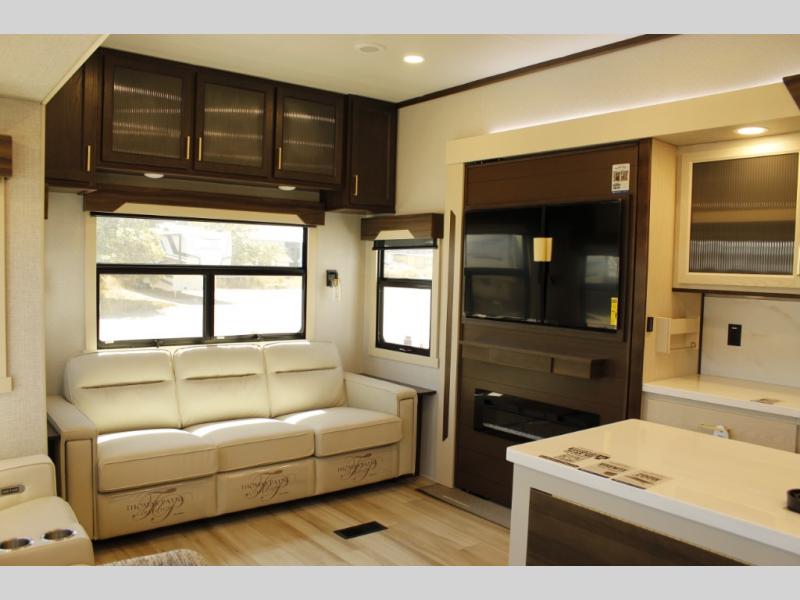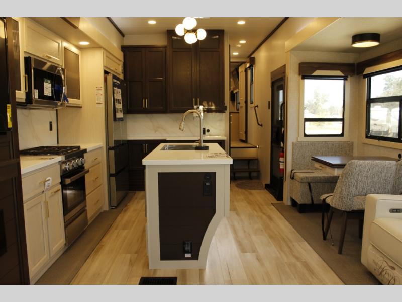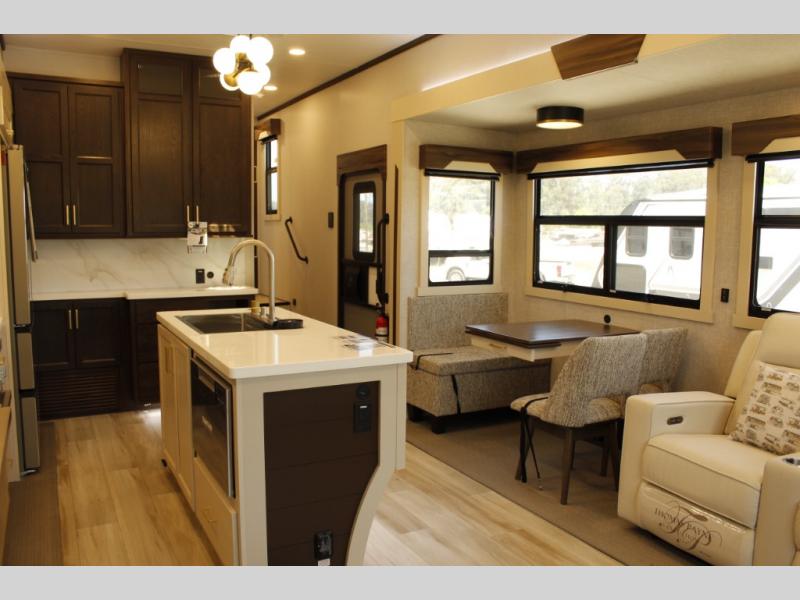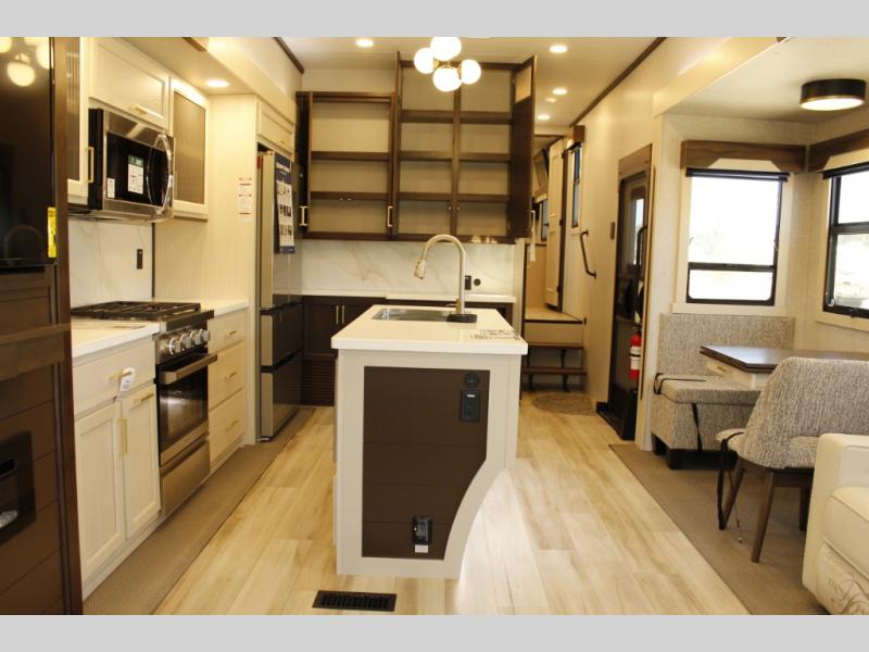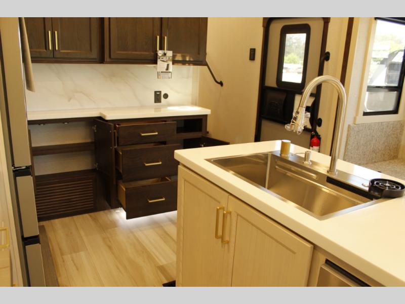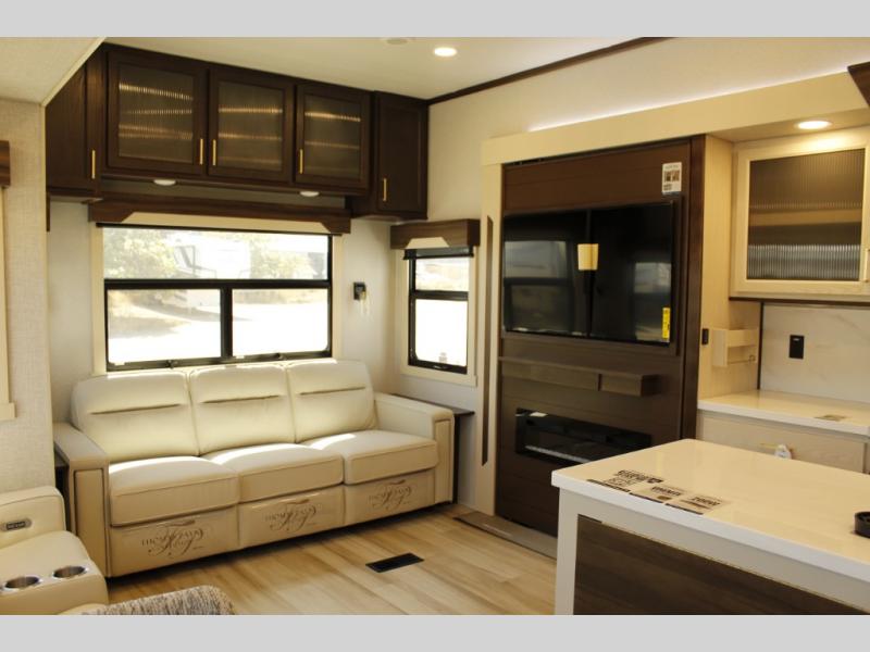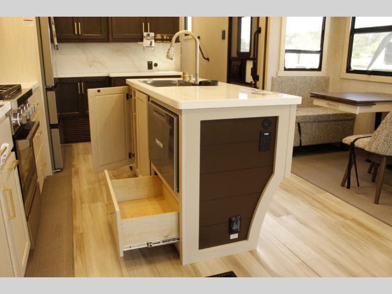 You can bring a guest or two to join in on the fun with this fifth wheel! The rear living area has a hide-a-bed sofa and power theater seating across from the swivel mounted TV and fireplace with a hidden Murphy pantry behind. The chef can prepare their best meals with the kitchen island and your guests will love the fold-down breakfast counter. The full bathroom has a spacious shower with a seat plus a dual sink vanity for convenience. The king bed slide in the front private bedroom welcomes you to enjoy a good night's rest and the front wardrobe has storage shelves and washer/dryer prep if you want the option to wash clothes while you're away from home!