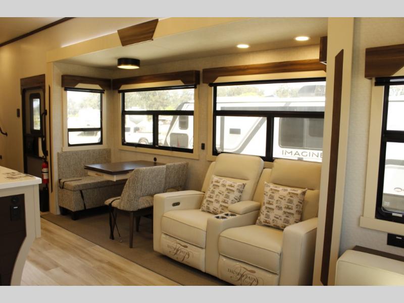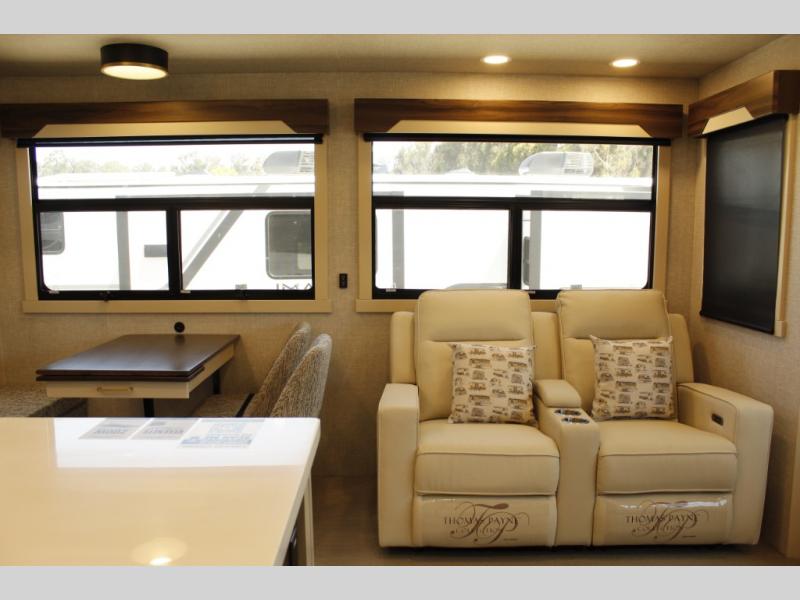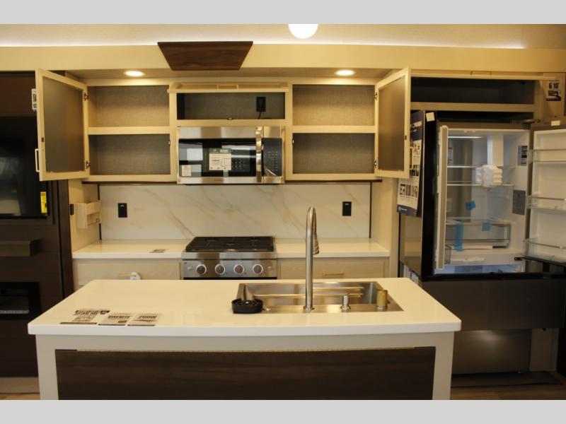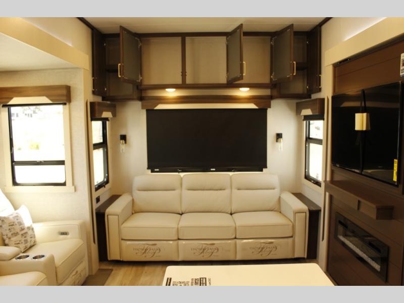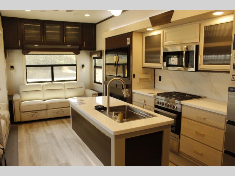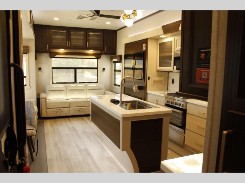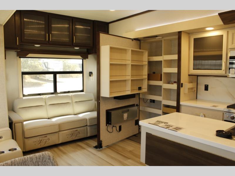 You can bring a guest or two to join in on the fun with this fifth wheel! The rear living area has a hide-a-bed sofa and power theater seating across from the swivel mounted TV and fireplace with a hidden Murphy pantry behind. The chef can prepare their best meals with the kitchen island and your guests will love the fold-down breakfast counter. The full bathroom has a spacious shower with a seat plus a dual sink vanity for convenience. The king bed slide in the front private bedroom welcomes you to enjoy a good night's rest and the front wardrobe has storage shelves and washer/dryer prep if you want the option to wash clothes while you're away from home!