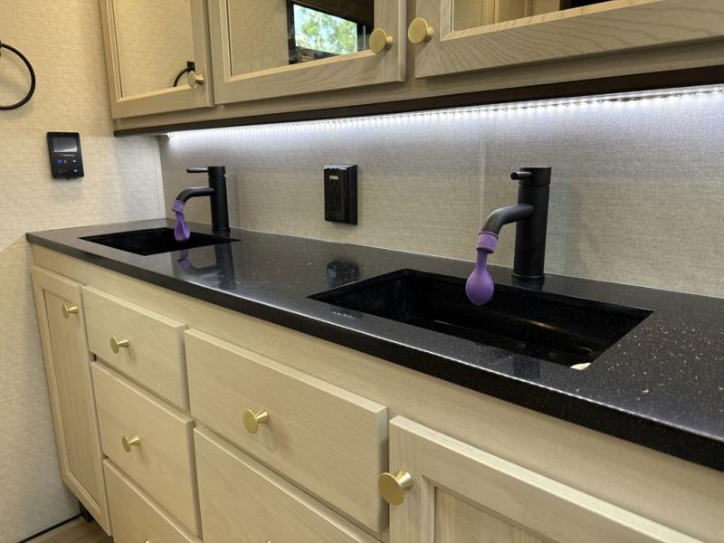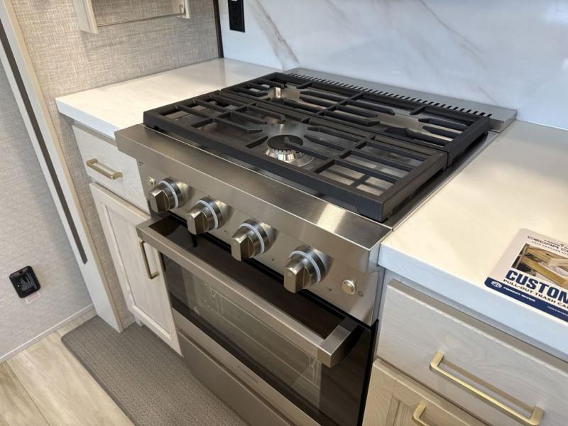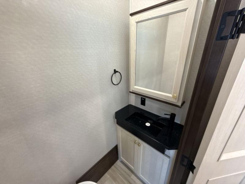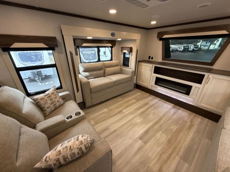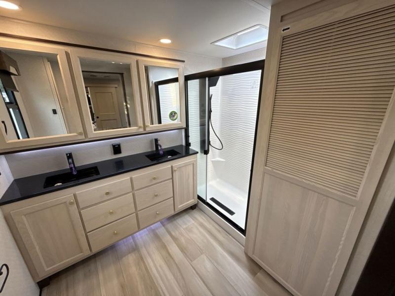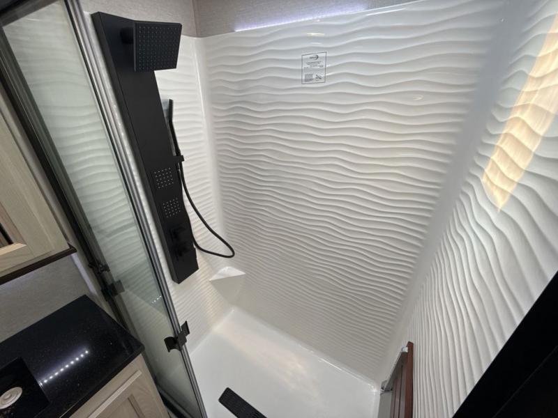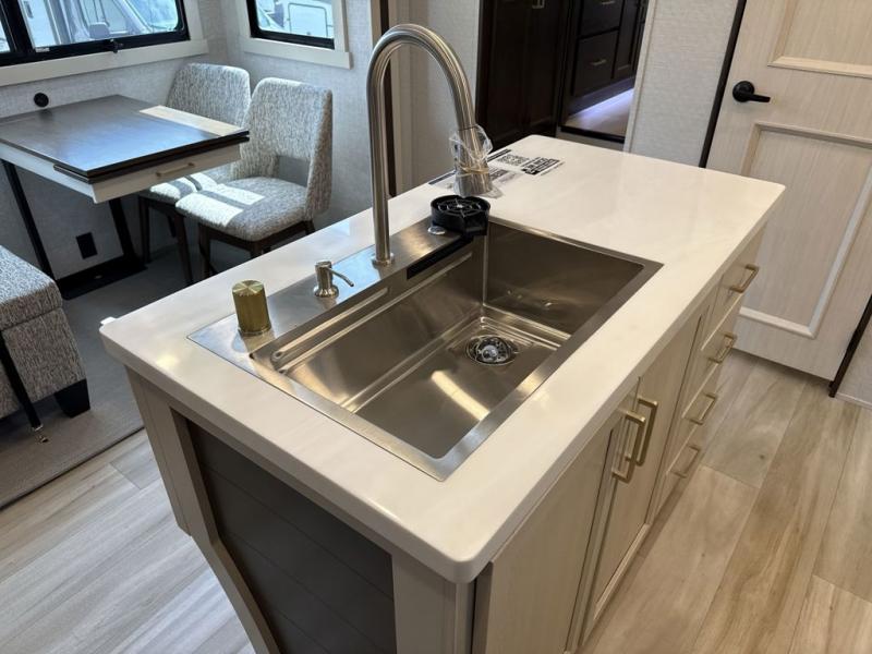 This fifth wheel has everything and then some! The front living area has opposing tri-fold sofas and power theater seating across from the front entertainment center with a fireplace and hidden telescoping TV. The chef can prepare their best meals with the kitchen island with a fold-down breakfast counter, and there is an 18 cu. ft. 12V refrigerator with an icemaker for food storage. Enjoy your meals and the extra space provided with the wall mounted dining table with an extension and an ottoman. The master suite has a king bed slide to lay your head at night and access to the full rear bathroom which has a shower with a seat, a linen closet, washer/dryer prep, and a dual sink vanity. You'll also find drop-down storage underneath the bath/bedroom so nothing gets left behind. And the convenient half bath can be traded out for an optional bonus pantry if you don't need the half bath!