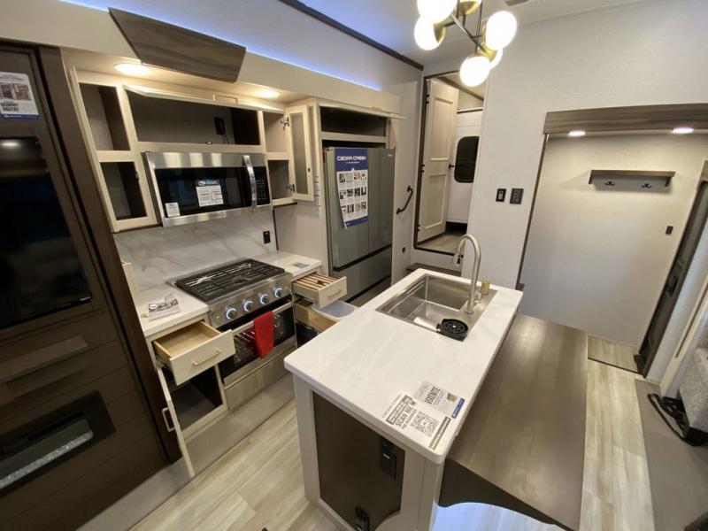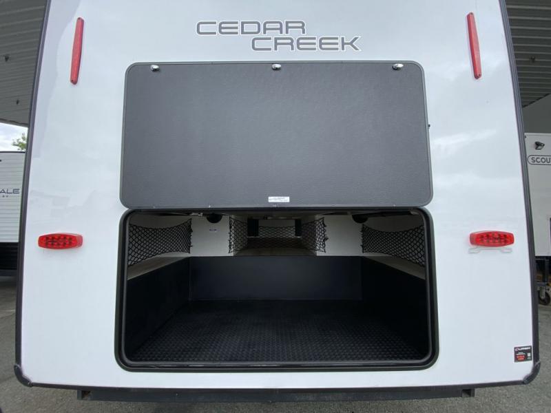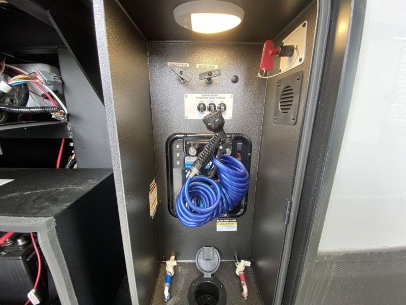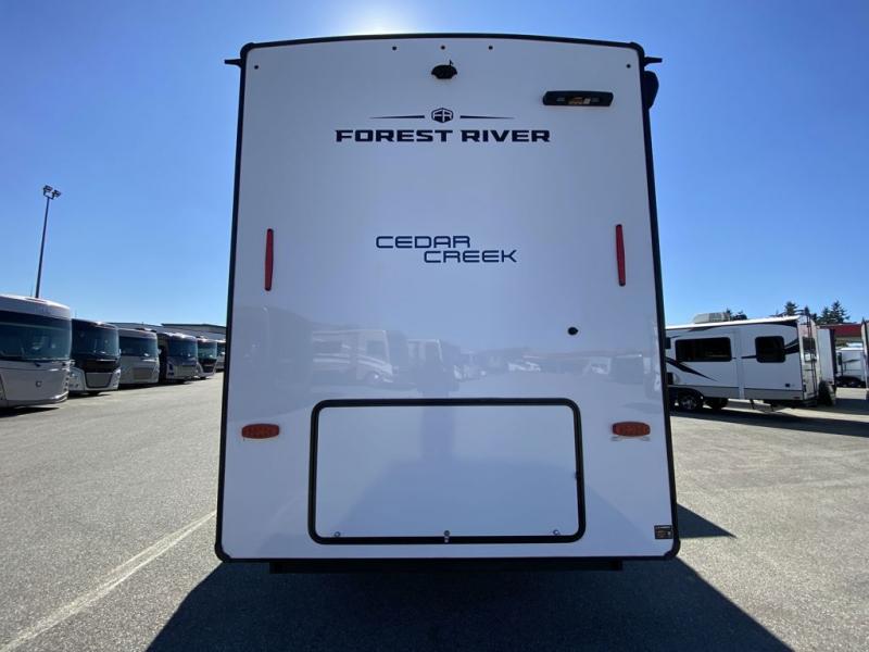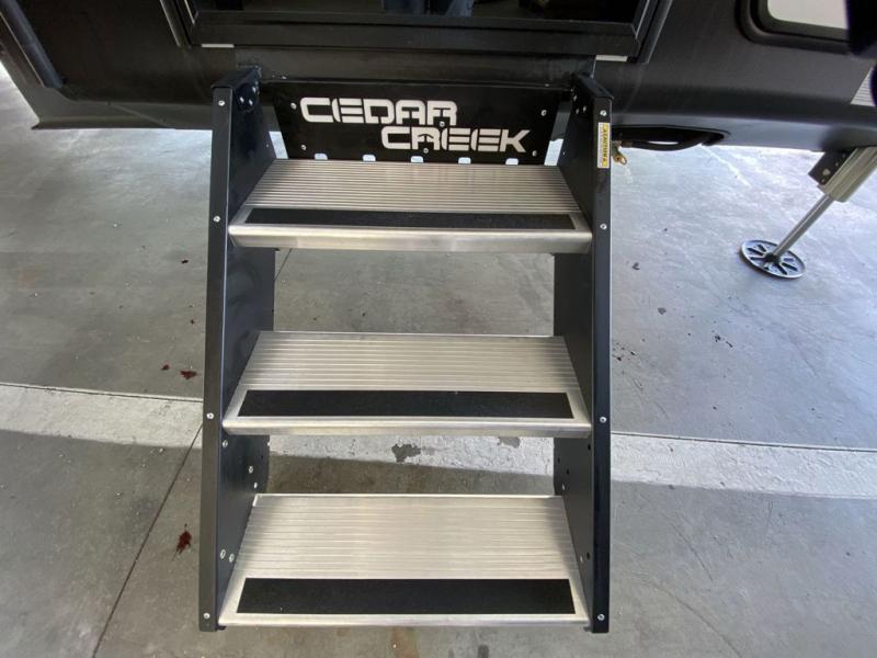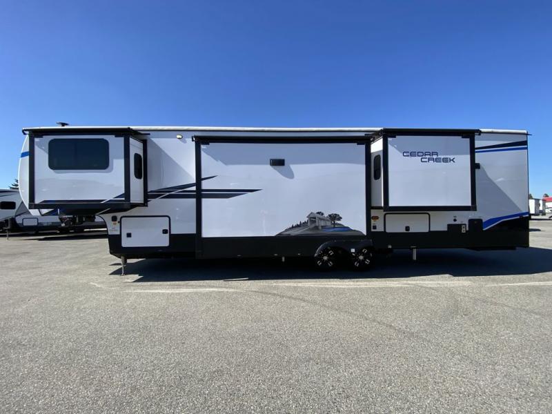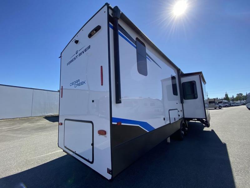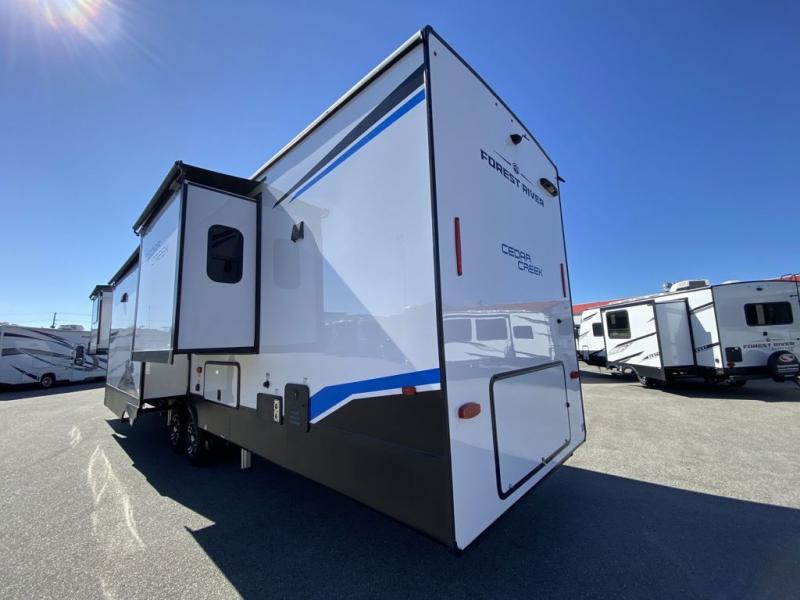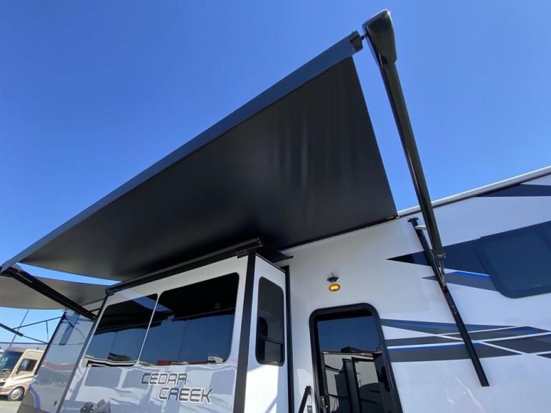 With any Cedar Creek fifth wheel by Forest River, you will find a quality-built RV with your comfort in mind! The all-aluminum super structure on 16" centers or less will provide a solid foundation to your fifth wheel, and the 3M bonded sidewalls will hold up over years of use. Each model also includes a Road Warrior suspension for smooth towing, a 21,000 lb. Rhino box hitch, and a new 101" wide body frame. Inside, you'll enjoy walnut/two tone wooden cabinets and fascias, day/night roller shades, motion lighting in the bath and bedroom closet, plus many more comforts. The new CradlePoint WiFi/5G antenna and Day 1 connectivity will help keep you connected as you travel, and the "Rich Solar" 200W solar panel will give you off-grid capabilities!