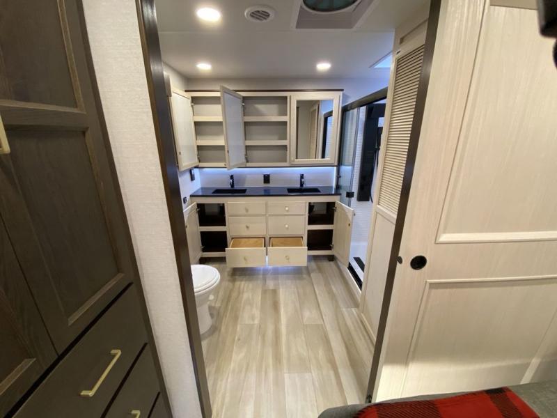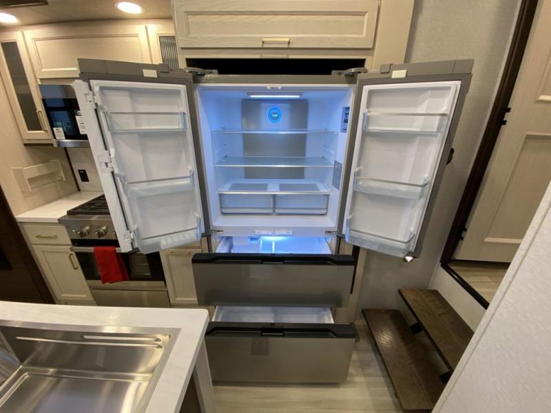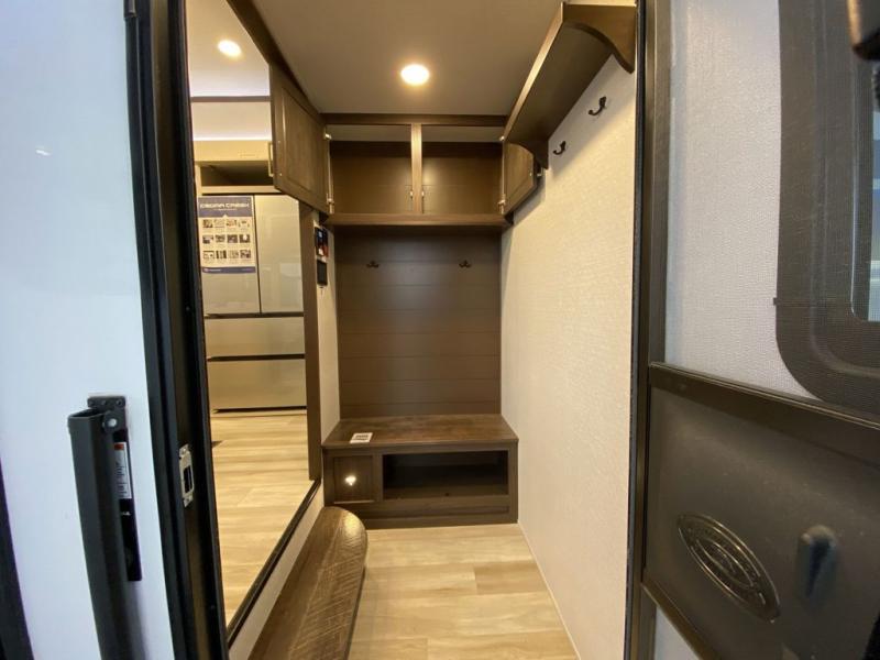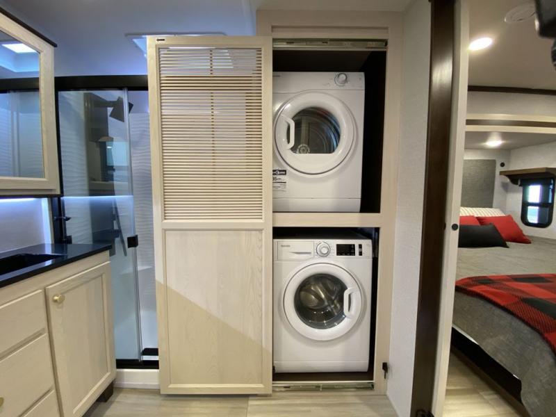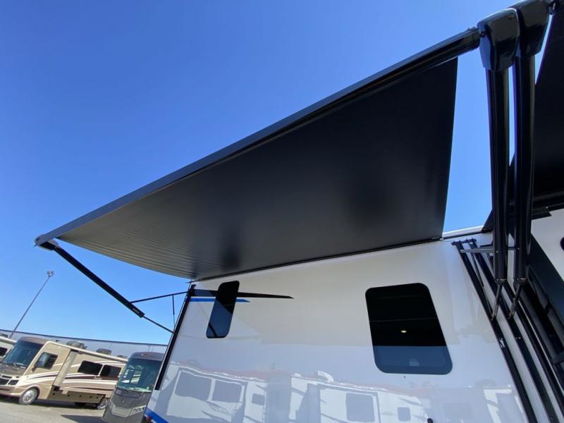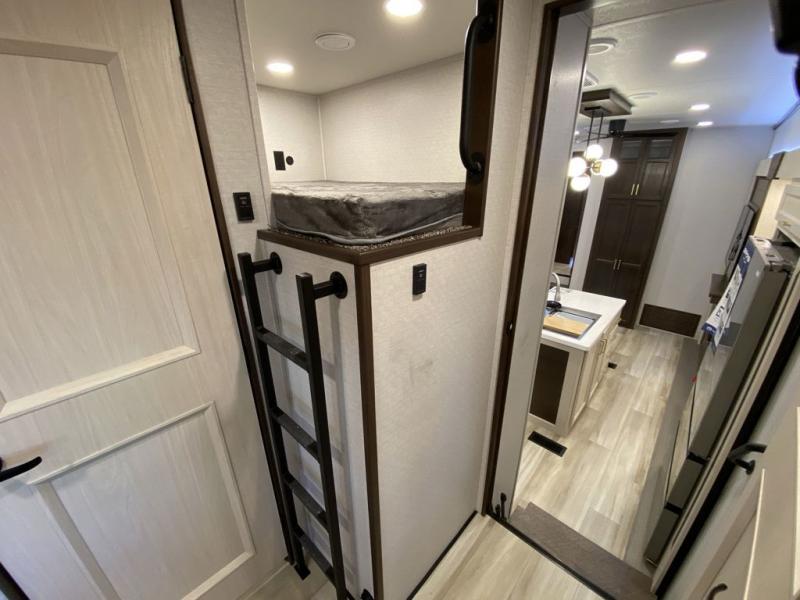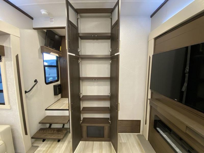 You won't believe all this fifth wheel has to offer! There is a convenient mud room right as you enter the unit where you can use the bench to take your shoes off and not drag dirt in the living areas. The front bedroom includes a jackknife sofa slide out, a half bath, plus a Murphy bed so this room can be used as a guest room! And the loft access is in this room to house more guests or use as storage space. Your crew will love to meet in the middle combined kitchen and living area with power theater seats, a wall mounted dining table with an extension and an ottoman, plus a kitchen island with a fold-down breakfast counter. There is also a Murphy pantry hidden behind the entertainment center and all the appliances needed to make meals each day. You will be met with comfort in the master bedroom that includes a king bed slide out, a dresser and a TV, plus a full rear bath with dual bath sinks. You will also find a shower with a seat, washer/dryer prep, and drop-down storage under the rear bedroom/bathroom so nothing gets left behind!