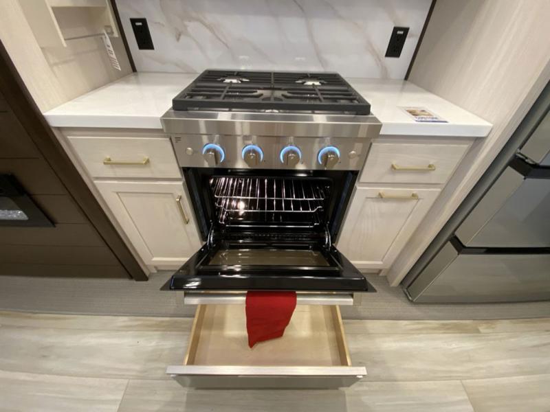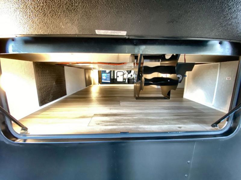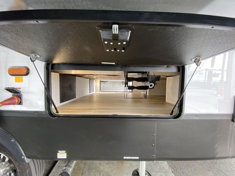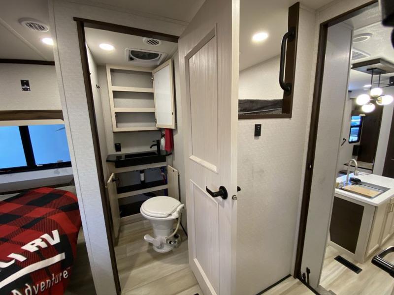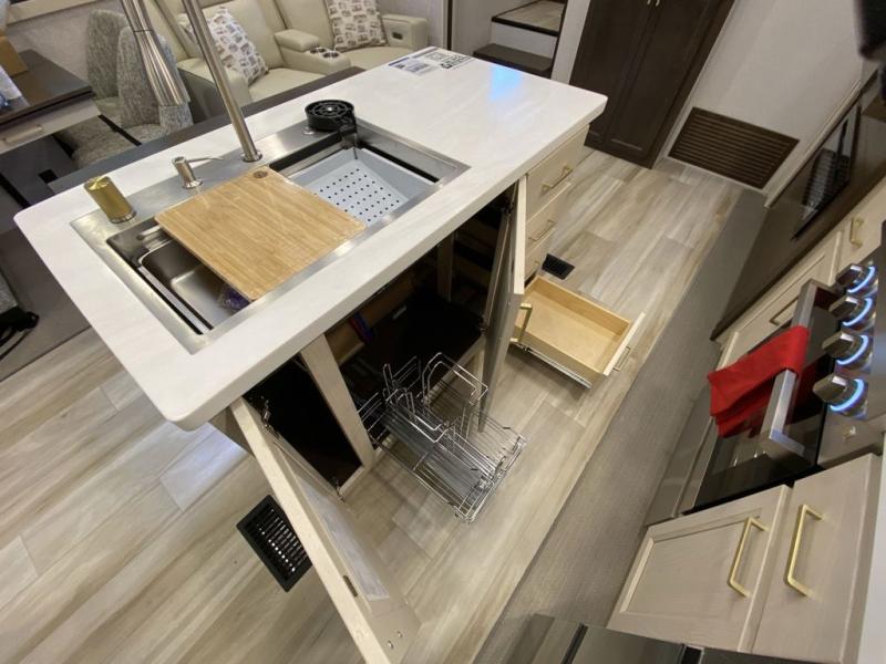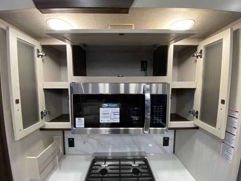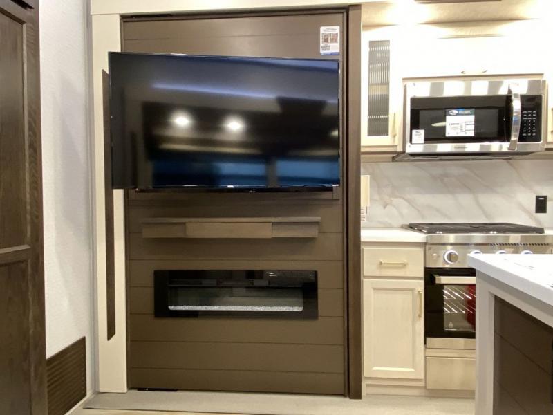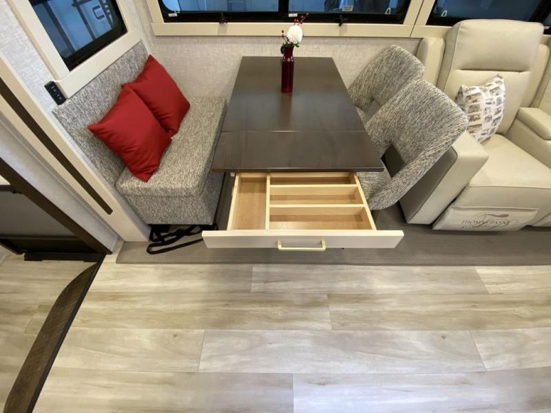 You won't believe all this fifth wheel has to offer! There is a convenient mud room right as you enter the unit where you can use the bench to take your shoes off and not drag dirt in the living areas. The front bedroom includes a jackknife sofa slide out, a half bath, plus a Murphy bed so this room can be used as a guest room! And the loft access is in this room to house more guests or use as storage space. Your crew will love to meet in the middle combined kitchen and living area with power theater seats, a wall mounted dining table with an extension and an ottoman, plus a kitchen island with a fold-down breakfast counter. There is also a Murphy pantry hidden behind the entertainment center and all the appliances needed to make meals each day. You will be met with comfort in the master bedroom that includes a king bed slide out, a dresser and a TV, plus a full rear bath with dual bath sinks. You will also find a shower with a seat, washer/dryer prep, and drop-down storage under the rear bedroom/bathroom so nothing gets left behind!