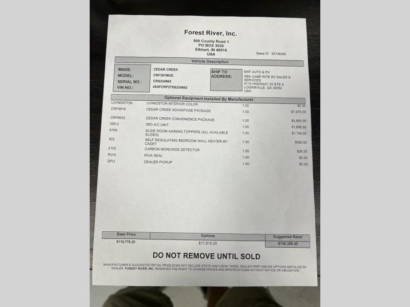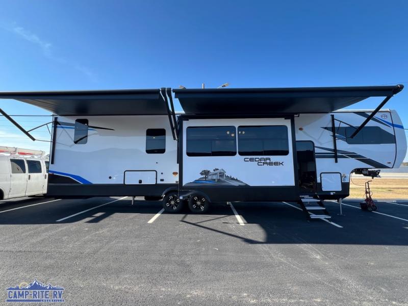 With any Cedar Creek fifth wheel by Forest River, you will find a quality-built RV with your comfort in mind! The all-aluminum super structure on 16" centers or less will provide a solid foundation to your fifth wheel, and the 3M bonded sidewalls will hold up over years of use. Each model also includes a Road Warrior suspension for smooth towing, a 21,000 lb. Rhino box hitch, and a new 101" wide body frame. Inside, you'll enjoy walnut/two tone wooden cabinets and fascias, day/night roller shades, motion lighting in the bath and bedroom closet, plus many more comforts. The new CradlePoint WiFi/5G antenna and Day 1 connectivity will help keep you connected as you travel, and the "Rich Solar" 200W solar panel will give you off-grid capabilities!