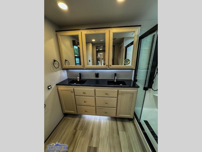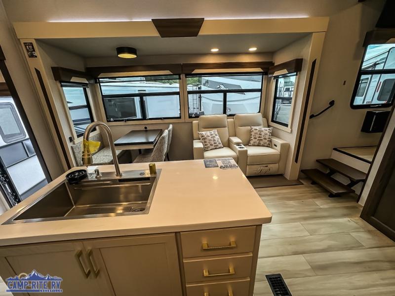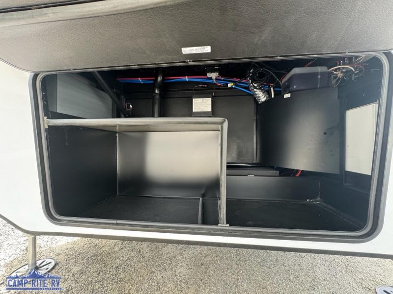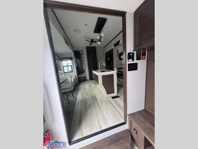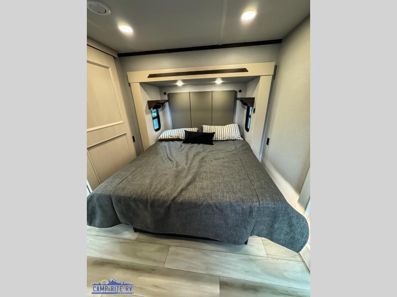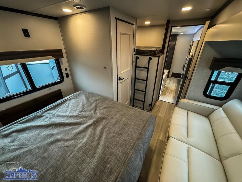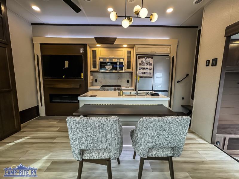 You won't believe all this fifth wheel has to offer! There is a convenient mud room right as you enter the unit where you can use the bench to take your shoes off and not drag dirt in the living areas. The front bedroom includes a jackknife sofa slide out, a half bath, plus a Murphy bed so this room can be used as a guest room! And the loft access is in this room to house more guests or use as storage space. Your crew will love to meet in the middle combined kitchen and living area with power theater seats, a wall mounted dining table with an extension and an ottoman, plus a kitchen island with a fold-down breakfast counter. There is also a Murphy pantry hidden behind the entertainment center and all the appliances needed to make meals each day. You will be met with comfort in the master bedroom that includes a king bed slide out, a dresser and a TV, plus a full rear bath with dual bath sinks. You will also find a shower with a seat, washer/dryer prep, and drop-down storage under the rear bedroom/bathroom so nothing gets left behind!