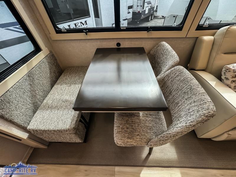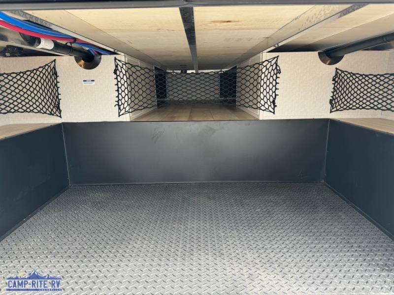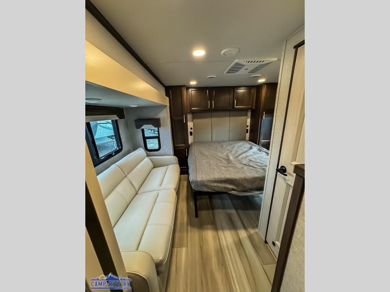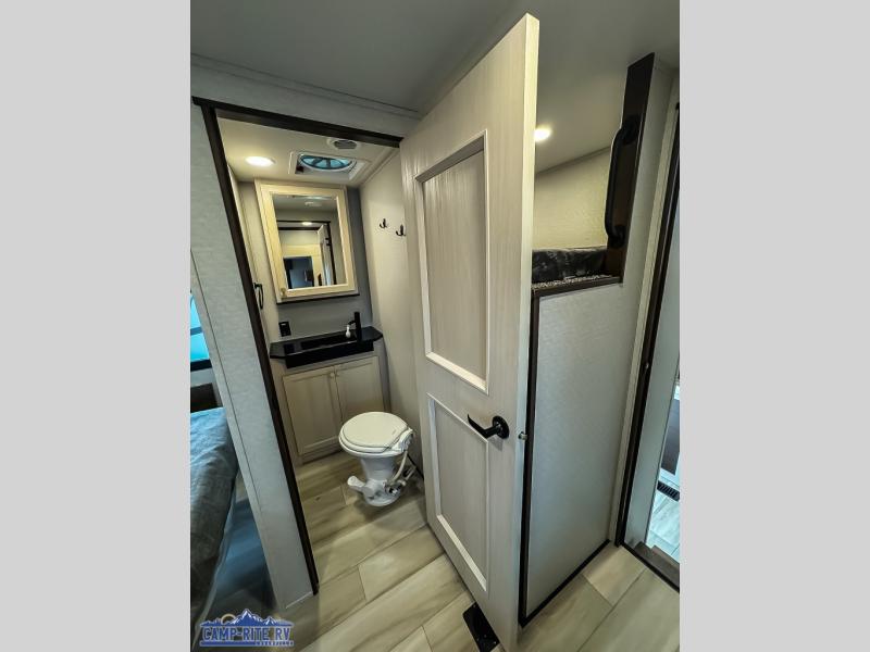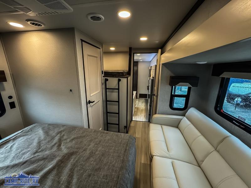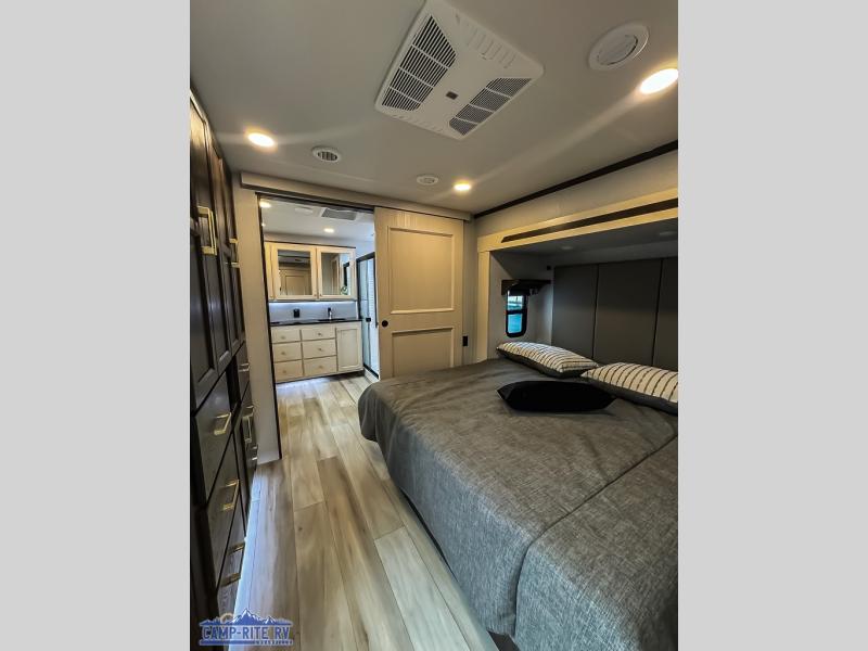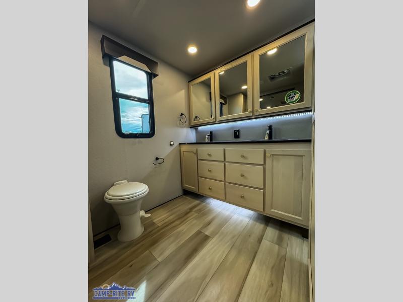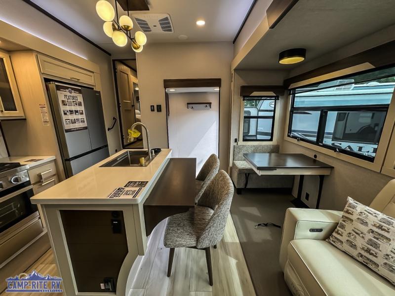 You won't believe all this fifth wheel has to offer! There is a convenient mud room right as you enter the unit where you can use the bench to take your shoes off and not drag dirt in the living areas. The front bedroom includes a jackknife sofa slide out, a half bath, plus a Murphy bed so this room can be used as a guest room! And the loft access is in this room to house more guests or use as storage space. Your crew will love to meet in the middle combined kitchen and living area with power theater seats, a wall mounted dining table with an extension and an ottoman, plus a kitchen island with a fold-down breakfast counter. There is also a Murphy pantry hidden behind the entertainment center and all the appliances needed to make meals each day. You will be met with comfort in the master bedroom that includes a king bed slide out, a dresser and a TV, plus a full rear bath with dual bath sinks. You will also find a shower with a seat, washer/dryer prep, and drop-down storage under the rear bedroom/bathroom so nothing gets left behind!