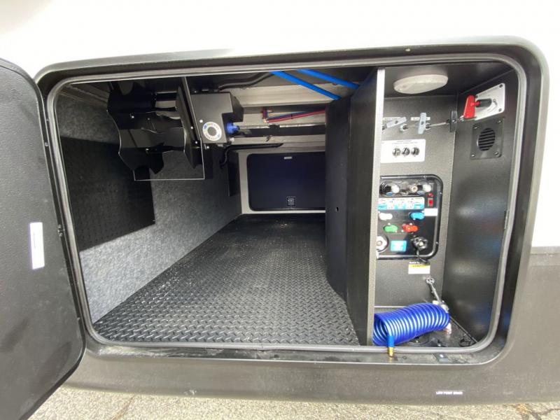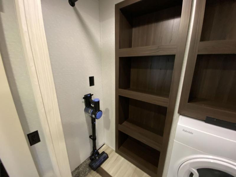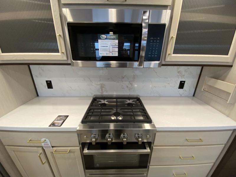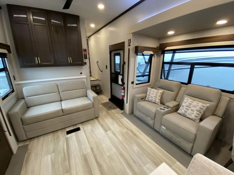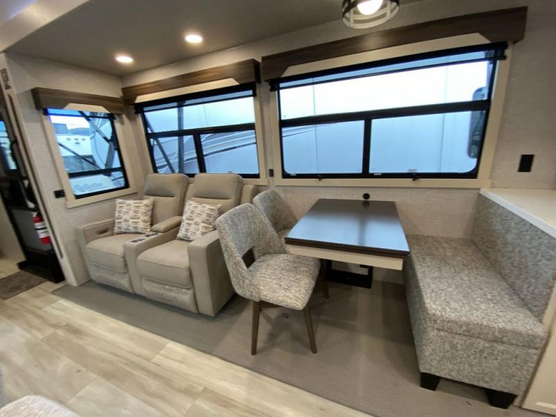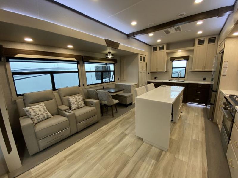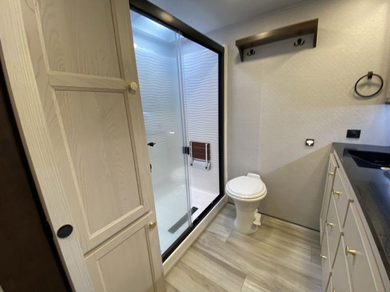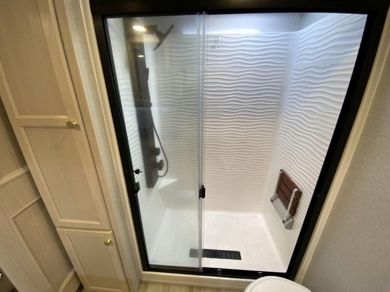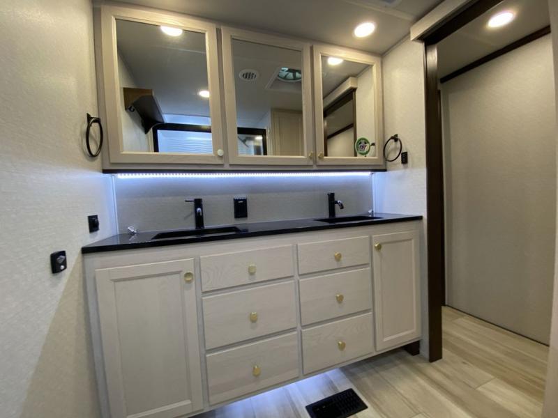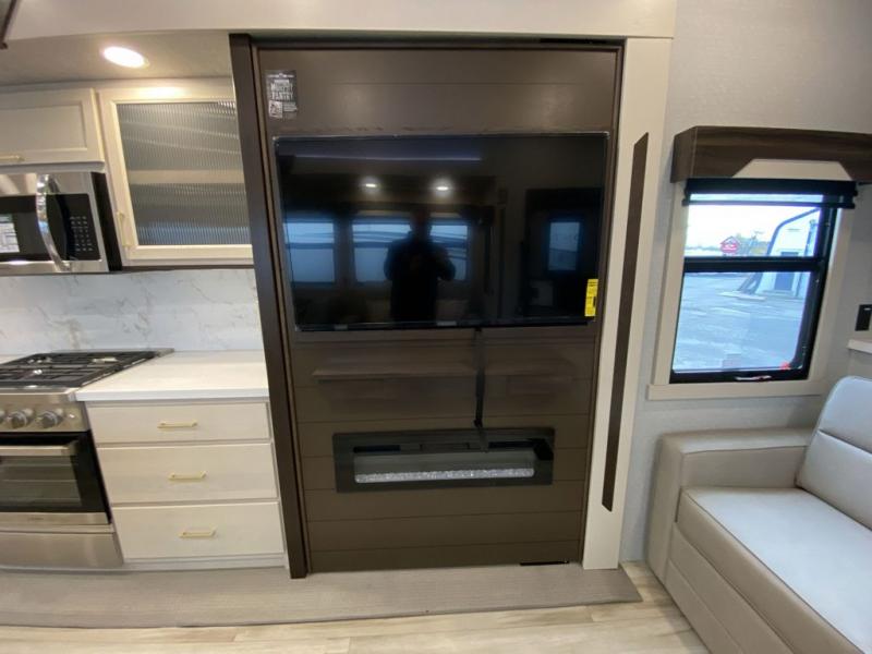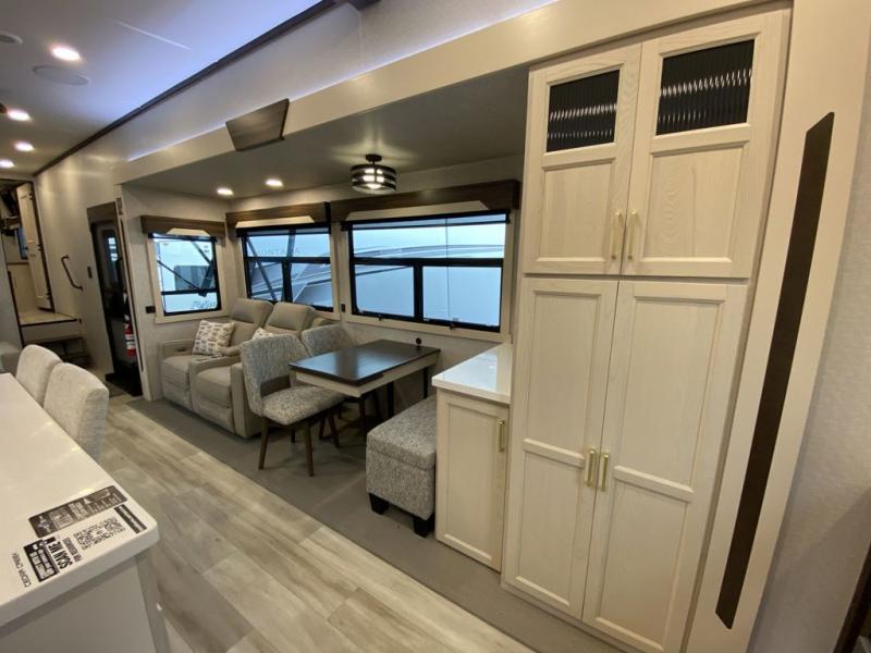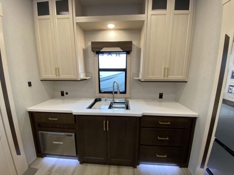 It will feel like coming home each time you take this fifth wheel out! The dual opposing slides in the main living area make your space open, and the waterfall island with swivel chairs will be the perfect place to prep meals, dine together, or set out snacks for movie night! You will also love the rear counter space with a large sink to clean up each day and there is a dishwasher option if you want the option to make the process even easier. A tri-fold sofa in the main living area will provide a place for a guest or two to sleep, and the Murphy pantry hidden behind the entertainment center and fireplace will keep snacks stocked up. The full bath includes a shower with a seat, dual bath sinks, plus a linen closet to keep towels tidy. What could make this fifth wheel better than a king bed slide out in the front bedroom?! How about a large wardrobe with washer/dryer prep, a dresser with a TV above, and overhead storage for belongings!