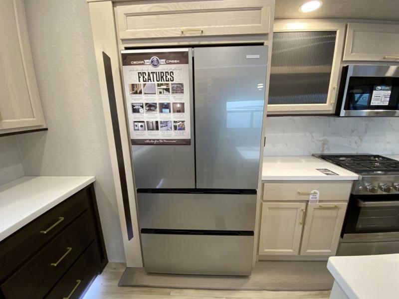 With any Cedar Creek fifth wheel by Forest River, you will find a quality-built RV with your comfort in mind! The all-aluminum super structure on 16" centers or less will provide a solid foundation to your fifth wheel, and the 3M bonded sidewalls will hold up over years of use. Each model also includes a Road Warrior suspension for smooth towing, a 21,000 lb. Rhino box hitch, and a new 101" wide body frame. Inside, you'll enjoy walnut/two tone wooden cabinets and fascias, day/night roller shades, motion lighting in the bath and bedroom closet, plus many more comforts. The new CradlePoint WiFi/5G antenna and Day 1 connectivity will help keep you connected as you travel, and the "Rich Solar" 200W solar panel will give you off-grid capabilities!