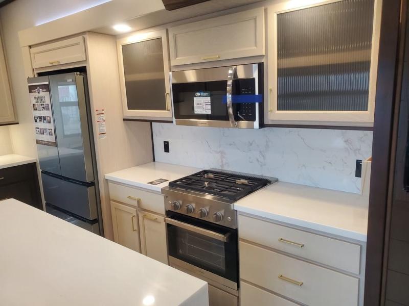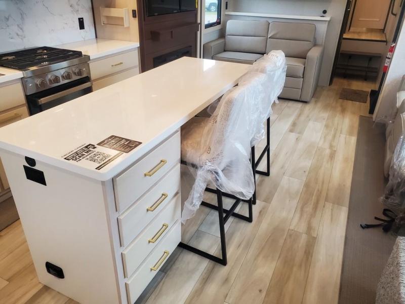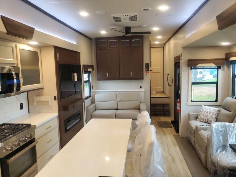 It will feel like coming home each time you take this fifth wheel out! The dual opposing slides in the main living area make your space open, and the waterfall island with swivel chairs will be the perfect place to prep meals, dine together, or set out snacks for movie night! You will also love the rear counter space with a large sink to clean up each day and there is a dishwasher option if you want the option to make the process even easier. A tri-fold sofa in the main living area will provide a place for a guest or two to sleep, and the Murphy pantry hidden behind the entertainment center and fireplace will keep snacks stocked up. The full bath includes a shower with a seat, dual bath sinks, plus a linen closet to keep towels tidy. What could make this fifth wheel better than a king bed slide out in the front bedroom?! How about a large wardrobe with washer/dryer prep, a dresser with a TV above, and overhead storage for belongings!