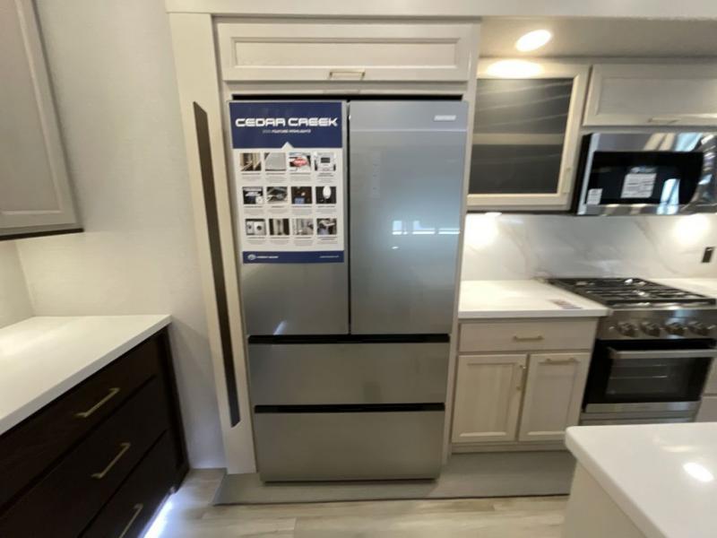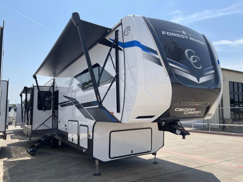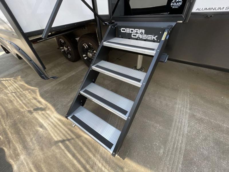 With any Cedar Creek fifth wheel by Forest River, you will find a quality-built RV with your comfort in mind! The all-aluminum super structure on 16" centers or less will provide a solid foundation to your fifth wheel, and the 3M bonded sidewalls will hold up over years of use. Each model also includes a Road Warrior suspension for smooth towing, a 21,000 lb. Rhino box hitch, and a new 101" wide body frame. Inside, you'll enjoy walnut/two tone wooden cabinets and fascias, day/night roller shades, motion lighting in the bath and bedroom closet, plus many more comforts. The new CradlePoint WiFi/5G antenna and Day 1 connectivity will help keep you connected as you travel, and the "Rich Solar" 200W solar panel will give you off-grid capabilities!