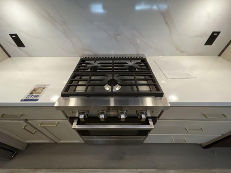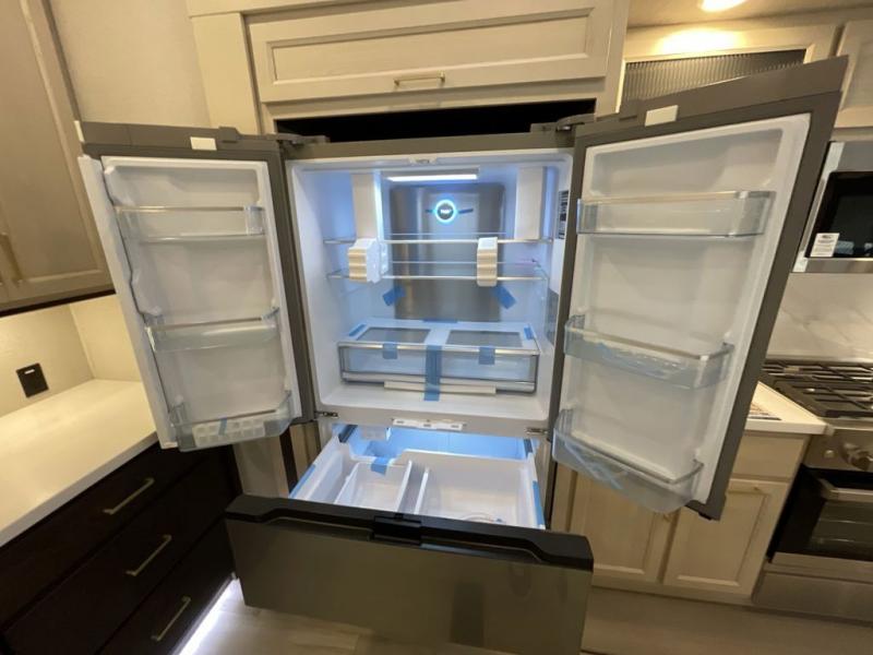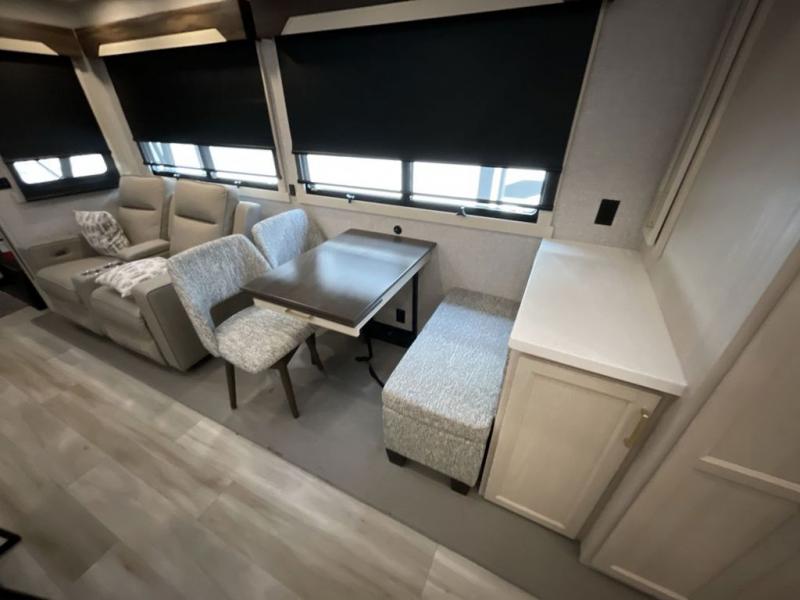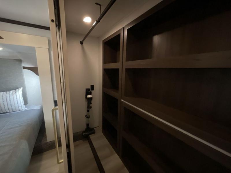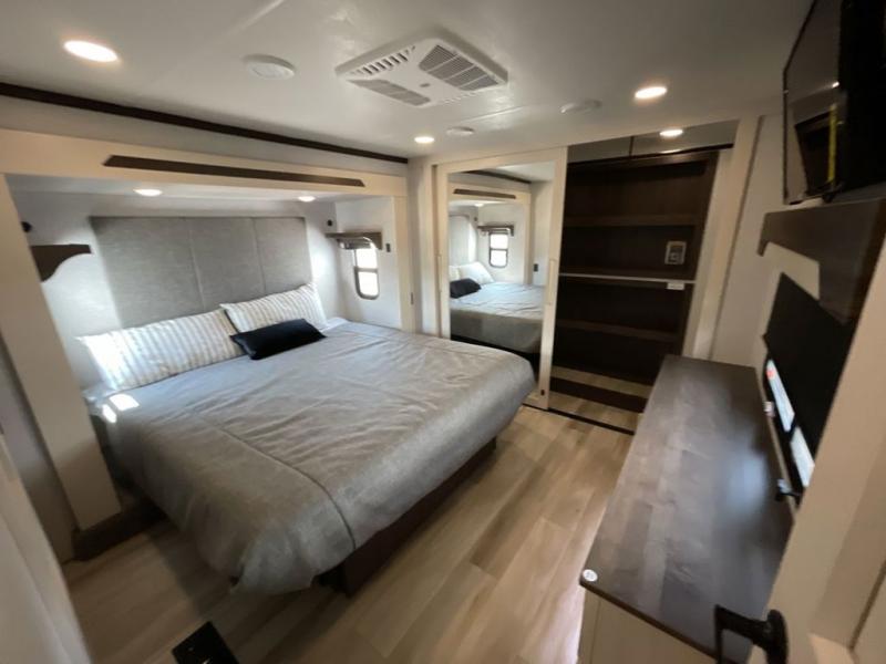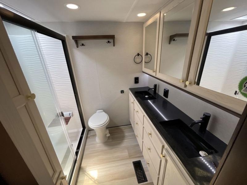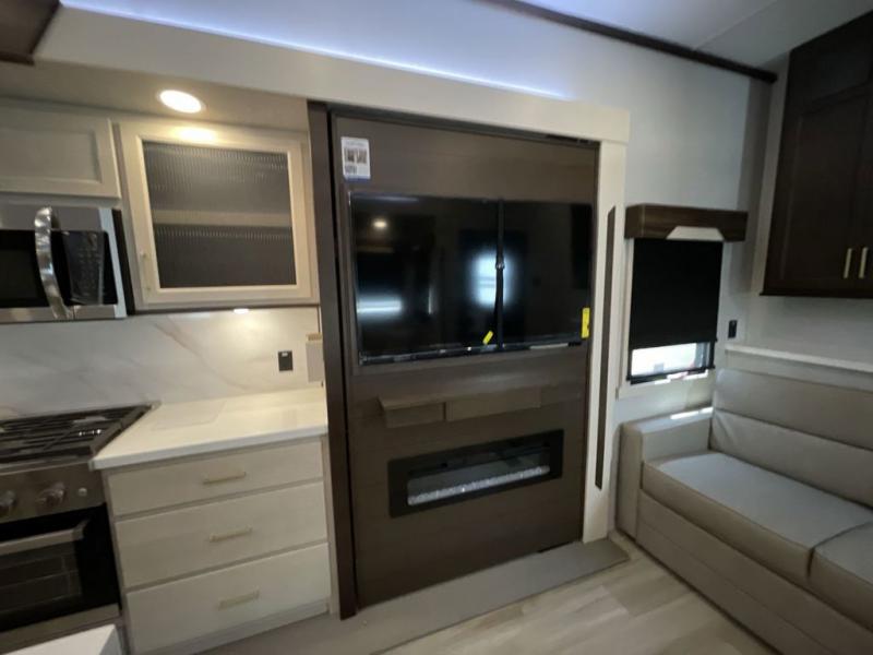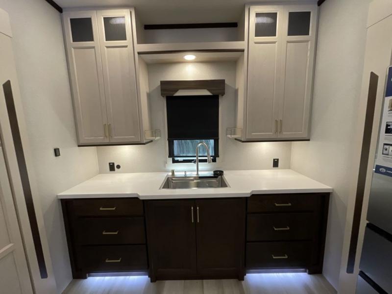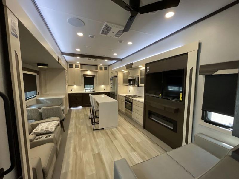 It will feel like coming home each time you take this fifth wheel out! The dual opposing slides in the main living area make your space open, and the waterfall island with swivel chairs will be the perfect place to prep meals, dine together, or set out snacks for movie night! You will also love the rear counter space with a large sink to clean up each day and there is a dishwasher option if you want the option to make the process even easier. A tri-fold sofa in the main living area will provide a place for a guest or two to sleep, and the Murphy pantry hidden behind the entertainment center and fireplace will keep snacks stocked up. The full bath includes a shower with a seat, dual bath sinks, plus a linen closet to keep towels tidy. What could make this fifth wheel better than a king bed slide out in the front bedroom?! How about a large wardrobe with washer/dryer prep, a dresser with a TV above, and overhead storage for belongings!