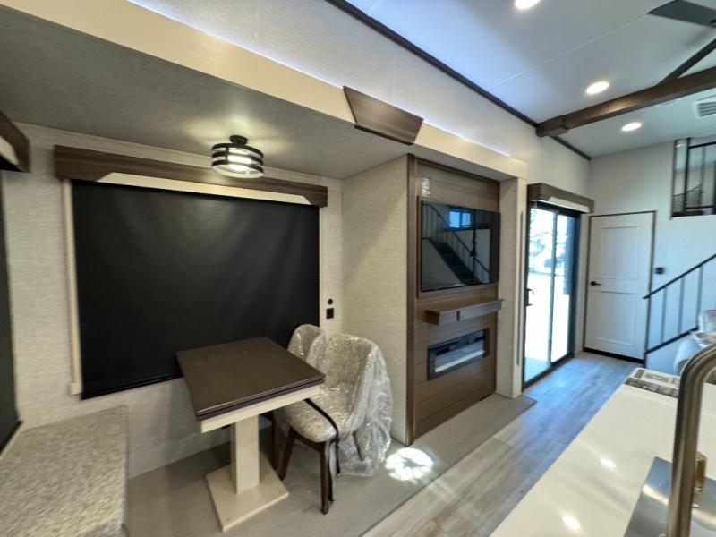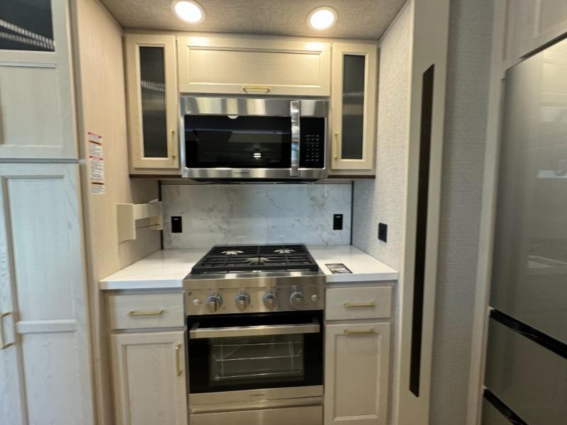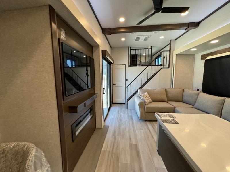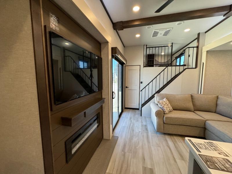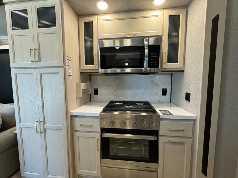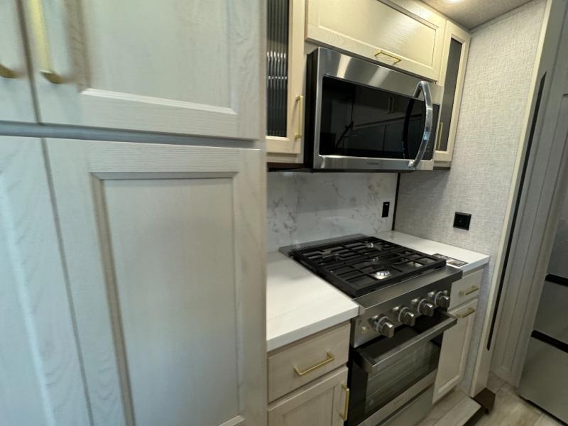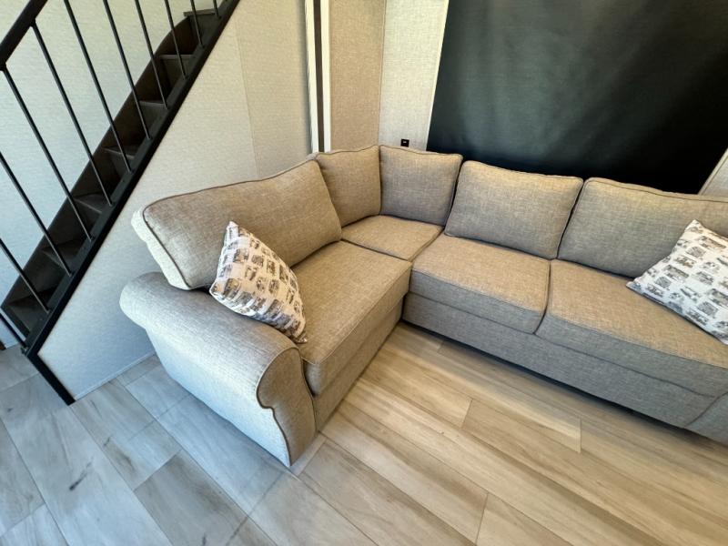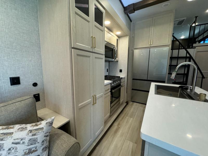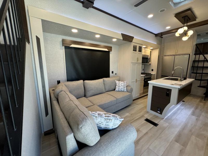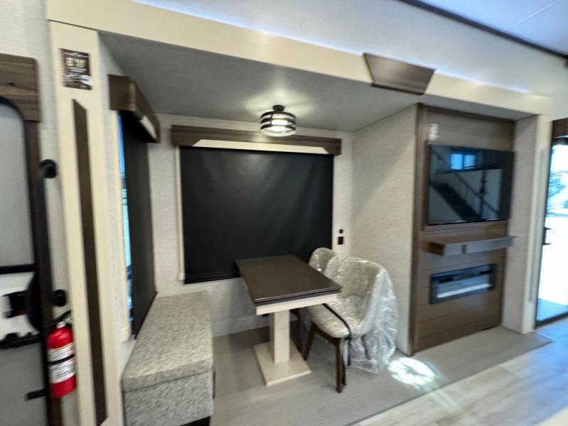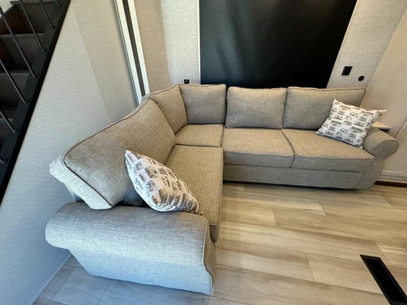A front and rear loft plus master bedroom offer three different sleeping spaces that you and your family or guests will enjoy. The front master offers a king bed slide, plus two dressers and a wardrobe for clothing. There is also a 32" TV as well. The main combined living and kitchen area features a large L-shaped sectional sofa opposite a swivel mount Smart TV and fireplace mounted on the exterior door that hides a Murphy pantry. The kitchen is fully equipped for all of your cooking needs with a 30" stainless steel microwave, a 12V 20 cu. ft. refrigerator, an island with fold-down breakfast counter. There is also a free standing dinette with an extension and an ottoman.