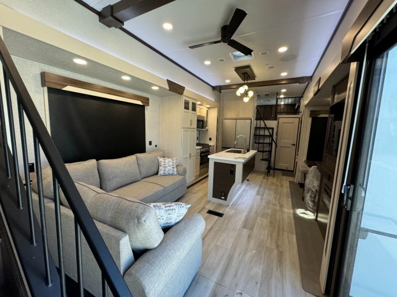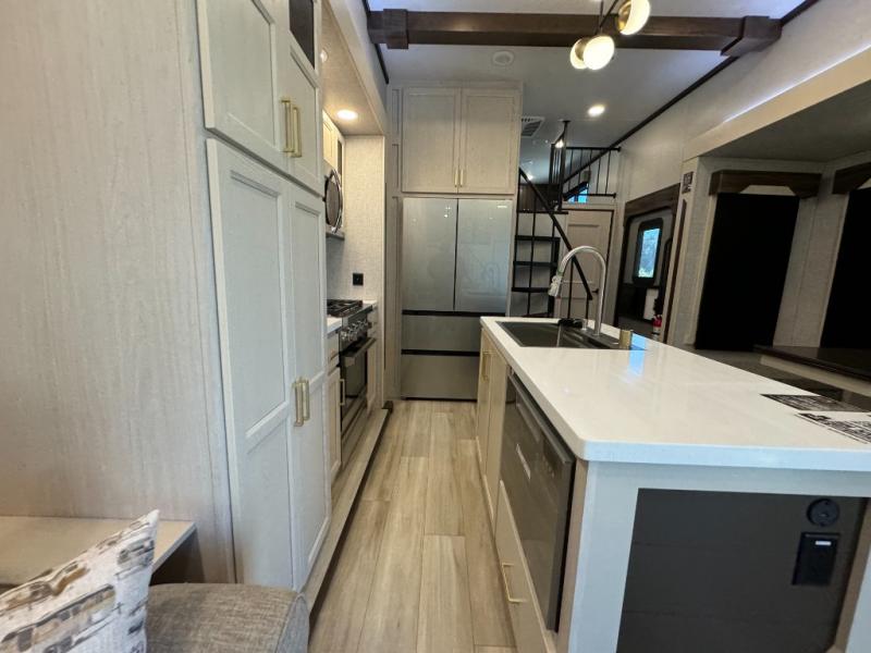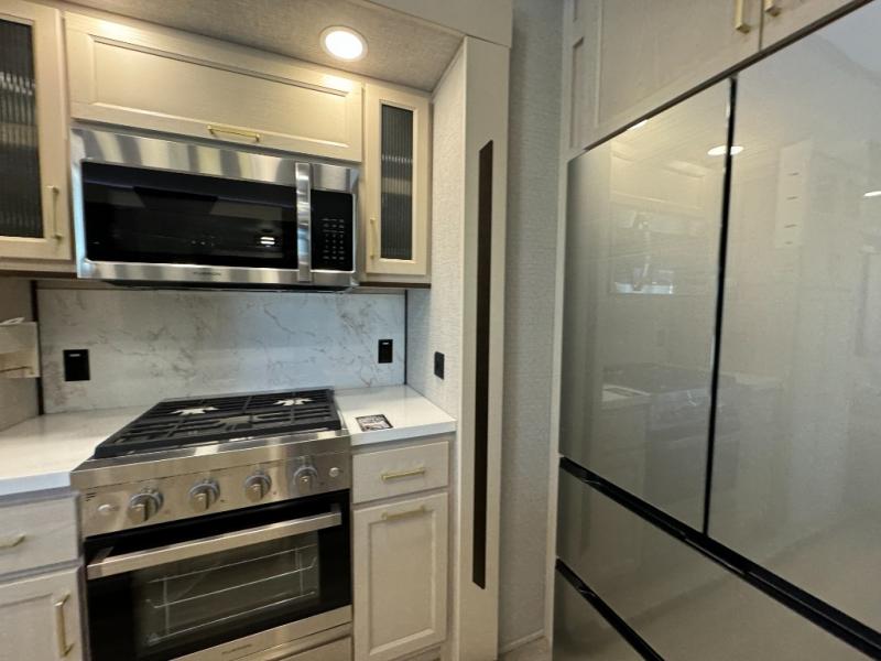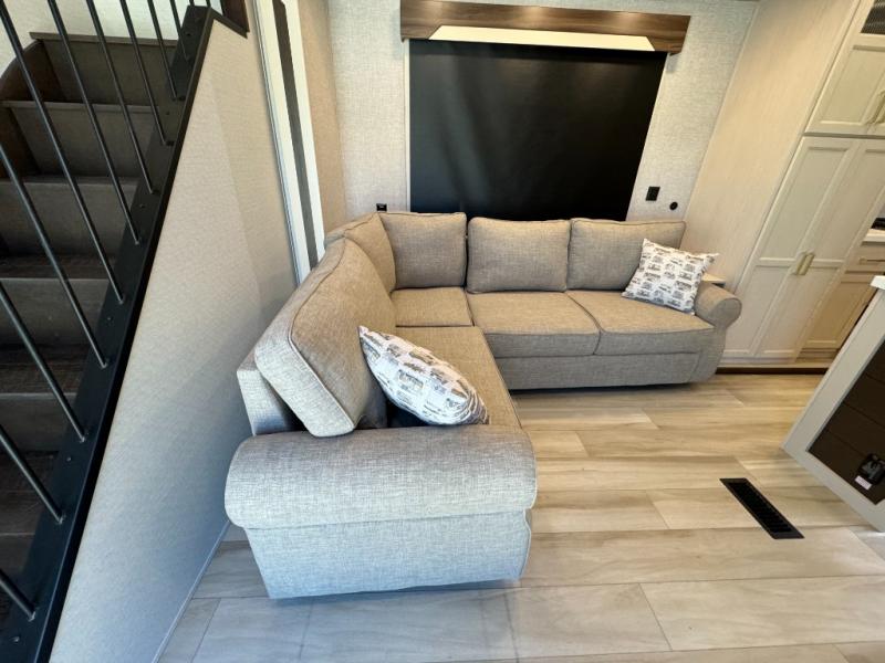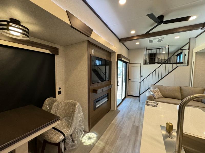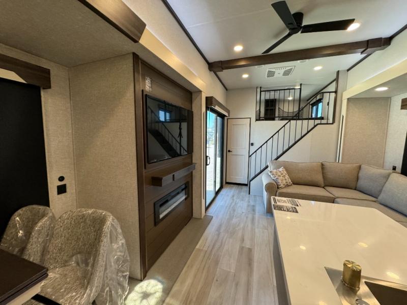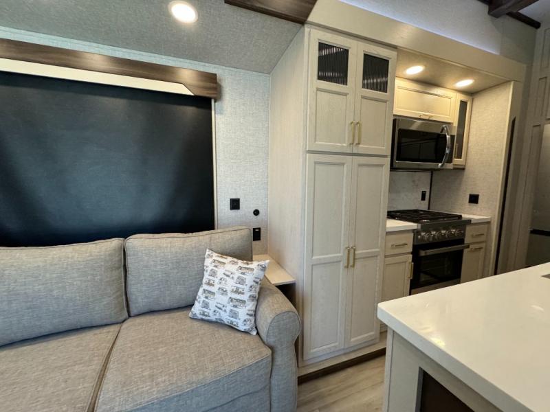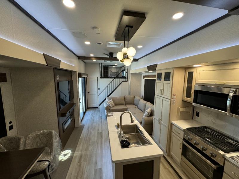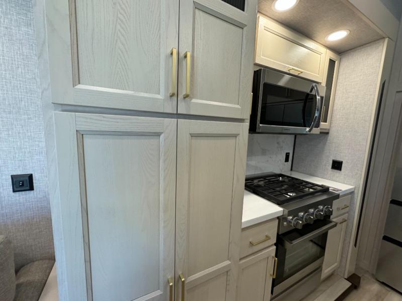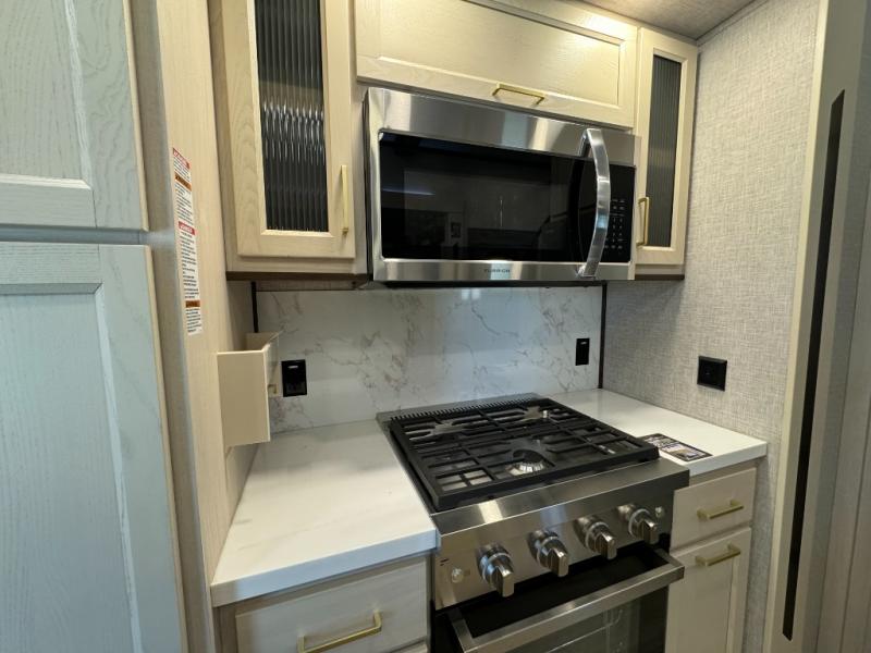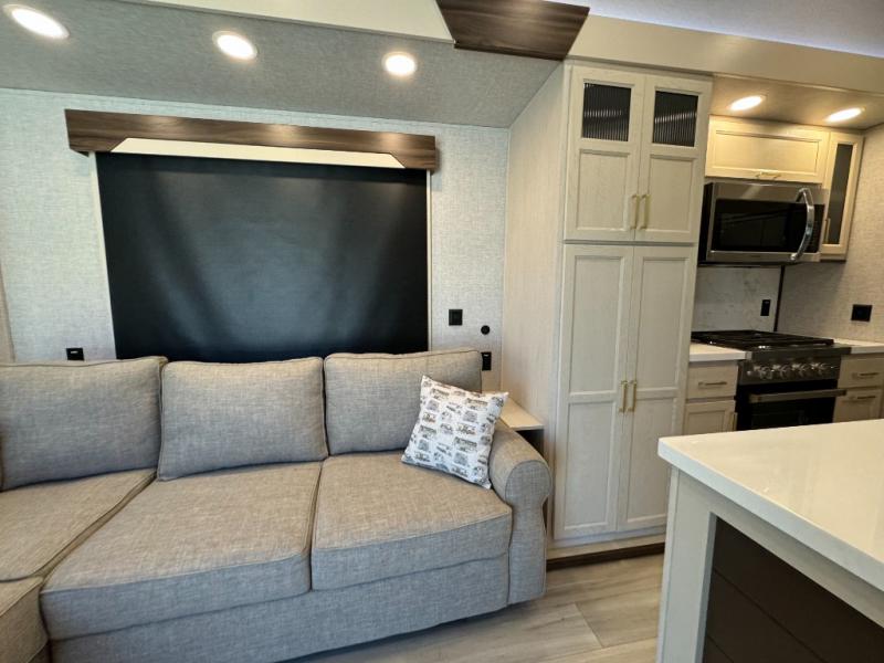 A front and rear loft plus master bedroom offer three different sleeping spaces that you and your family or guests will enjoy. The front master offers a king bed slide, plus two dressers and a wardrobe for clothing. There is also a 32" TV as well. The main combined living and kitchen area features a large L-shaped sectional sofa opposite a swivel mount Smart TV and fireplace mounted on the exterior door that hides a Murphy pantry. The kitchen is fully equipped for all of your cooking needs with a 30" stainless steel microwave, a 12V 20 cu. ft. refrigerator, an island with fold-down breakfast counter. There is also a free standing dinette with an extension and an ottoman.