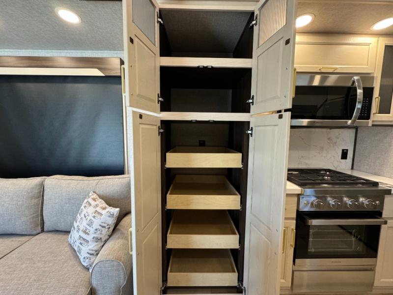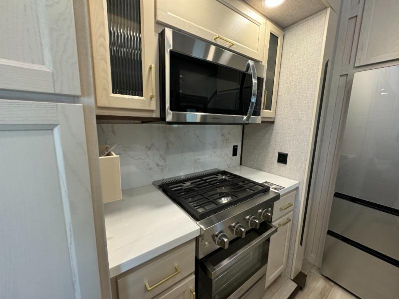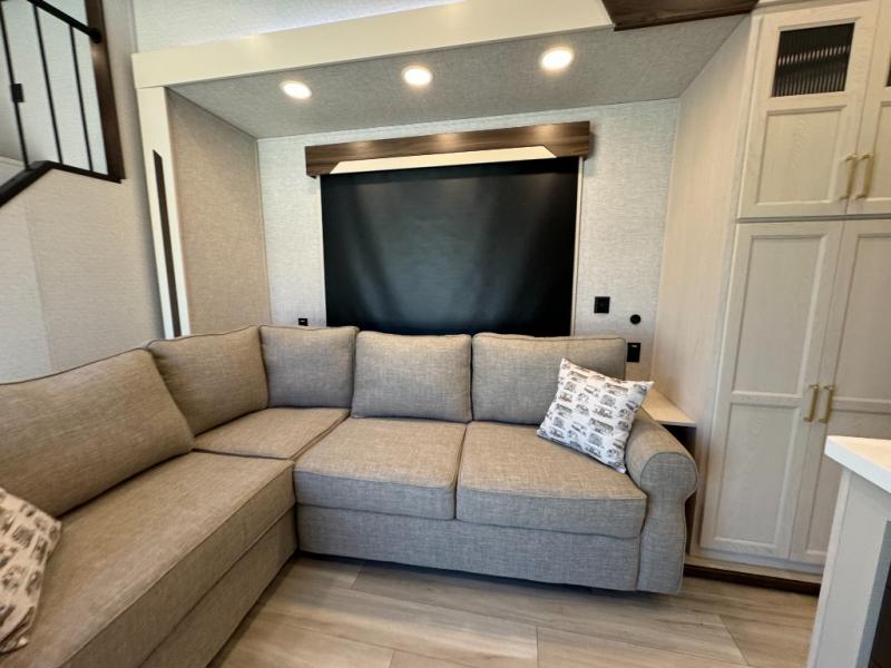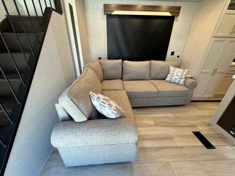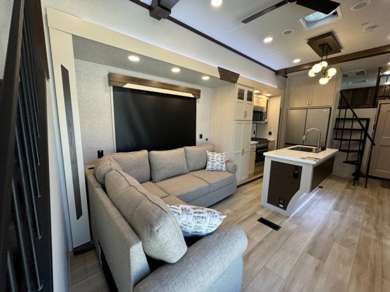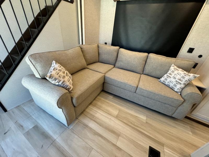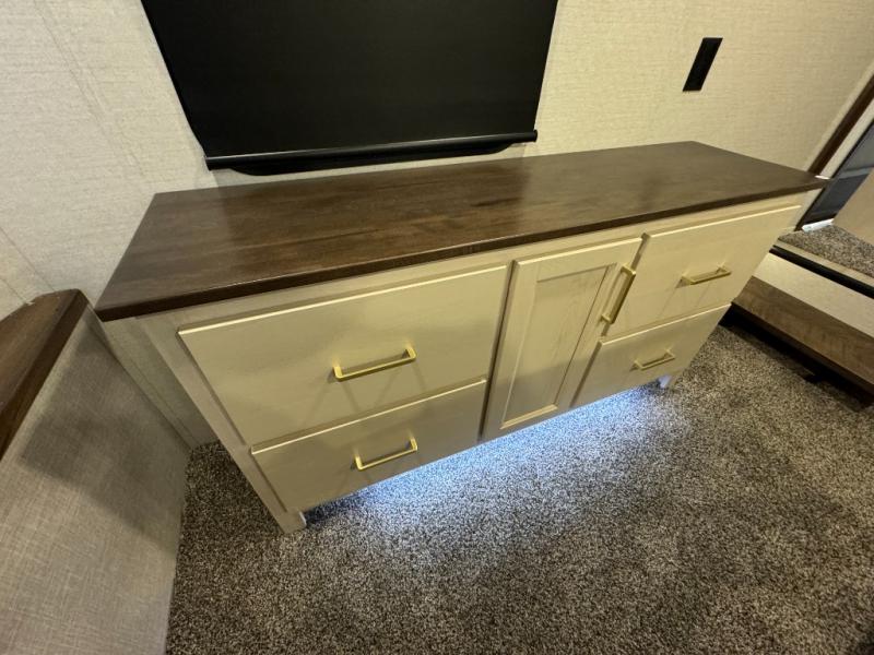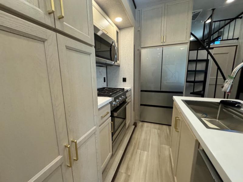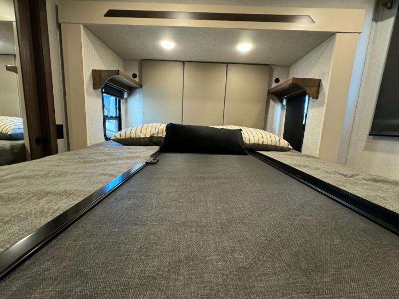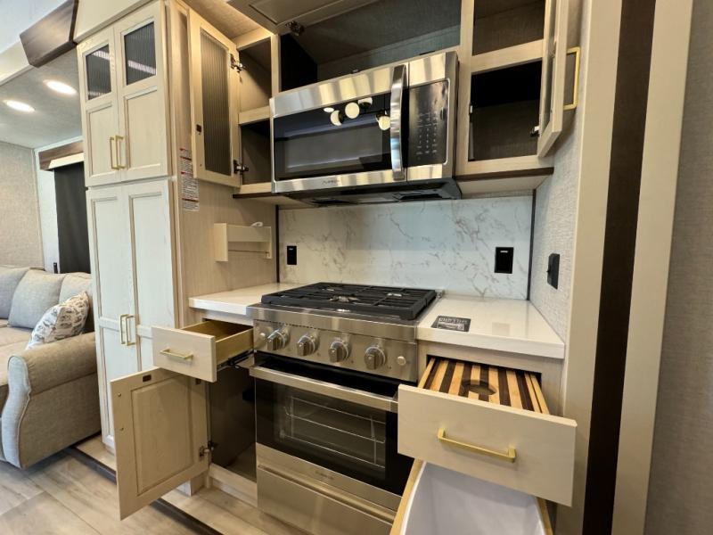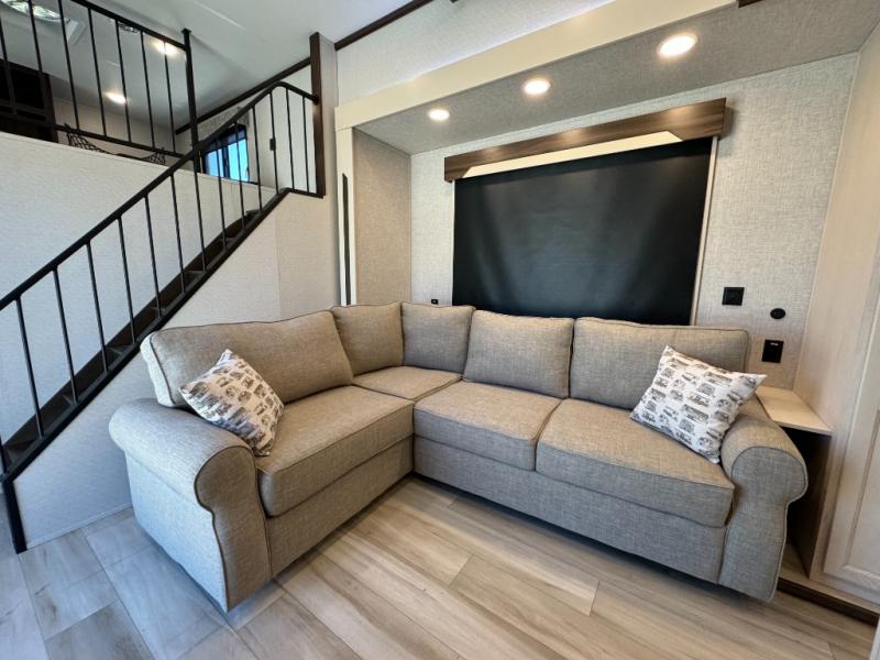 A front and rear loft plus master bedroom offer three different sleeping spaces that you and your family or guests will enjoy. The front master offers a king bed slide, plus two dressers and a wardrobe for clothing. There is also a 32" TV as well. The main combined living and kitchen area features a large L-shaped sectional sofa opposite a swivel mount Smart TV and fireplace mounted on the exterior door that hides a Murphy pantry. The kitchen is fully equipped for all of your cooking needs with a 30" stainless steel microwave, a 12V 20 cu. ft. refrigerator, an island with fold-down breakfast counter. There is also a free standing dinette with an extension and an ottoman.