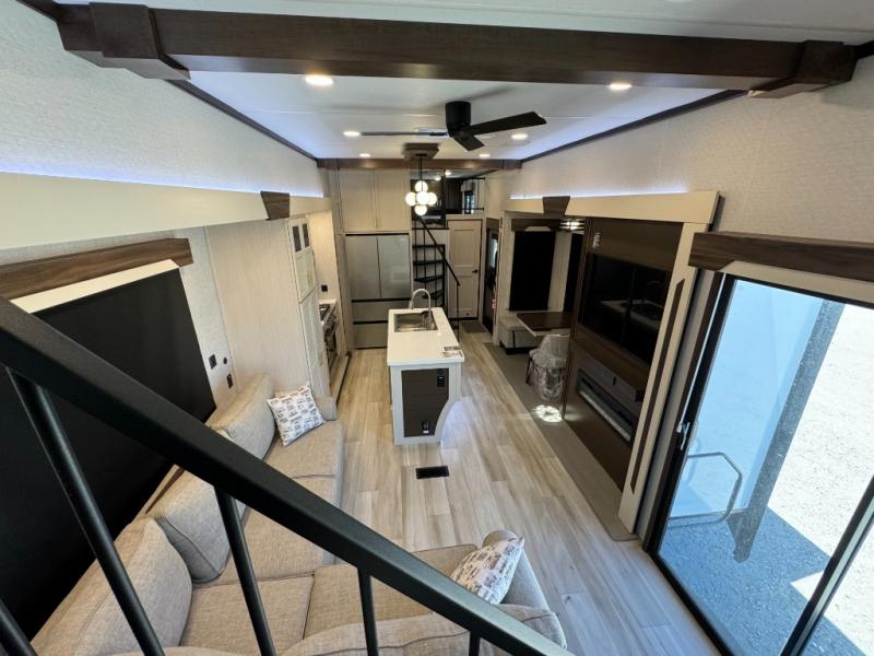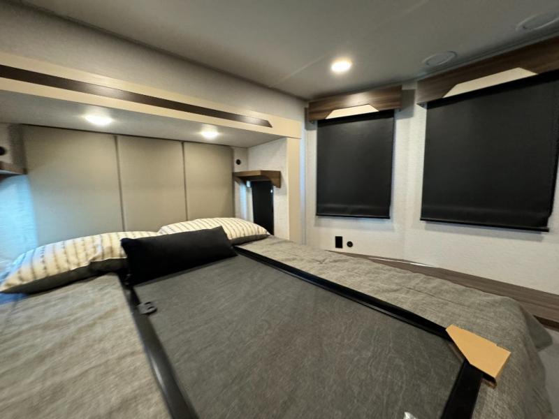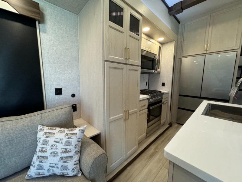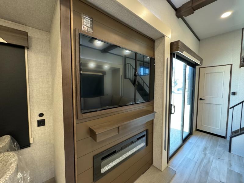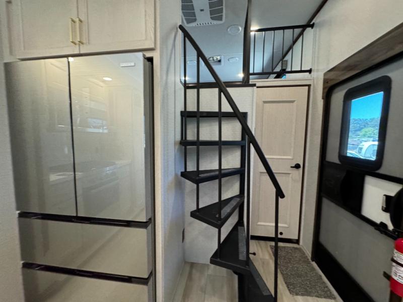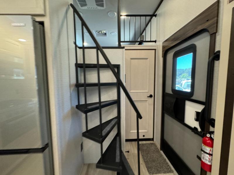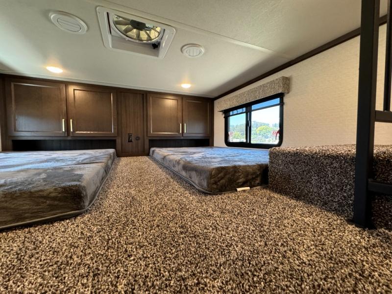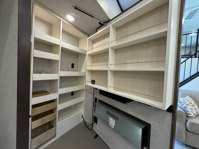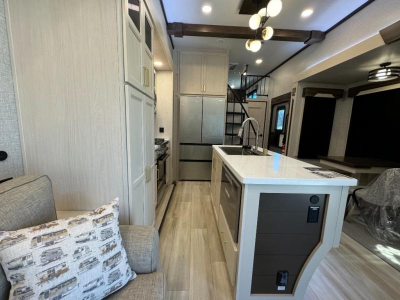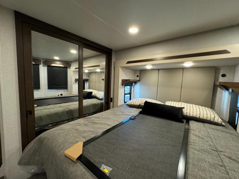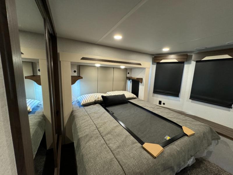 A front and rear loft plus master bedroom offer three different sleeping spaces that you and your family or guests will enjoy. The front master offers a king bed slide, plus two dressers and a wardrobe for clothing. There is also a 32" TV as well. The main combined living and kitchen area features a large L-shaped sectional sofa opposite a swivel mount Smart TV and fireplace mounted on the exterior door that hides a Murphy pantry. The kitchen is fully equipped for all of your cooking needs with a 30" stainless steel microwave, a 12V 20 cu. ft. refrigerator, an island with fold-down breakfast counter. There is also a free standing dinette with an extension and an ottoman.