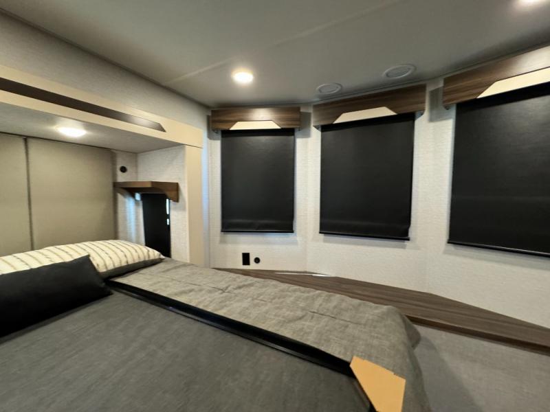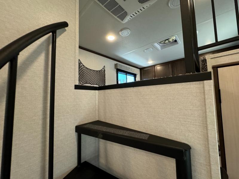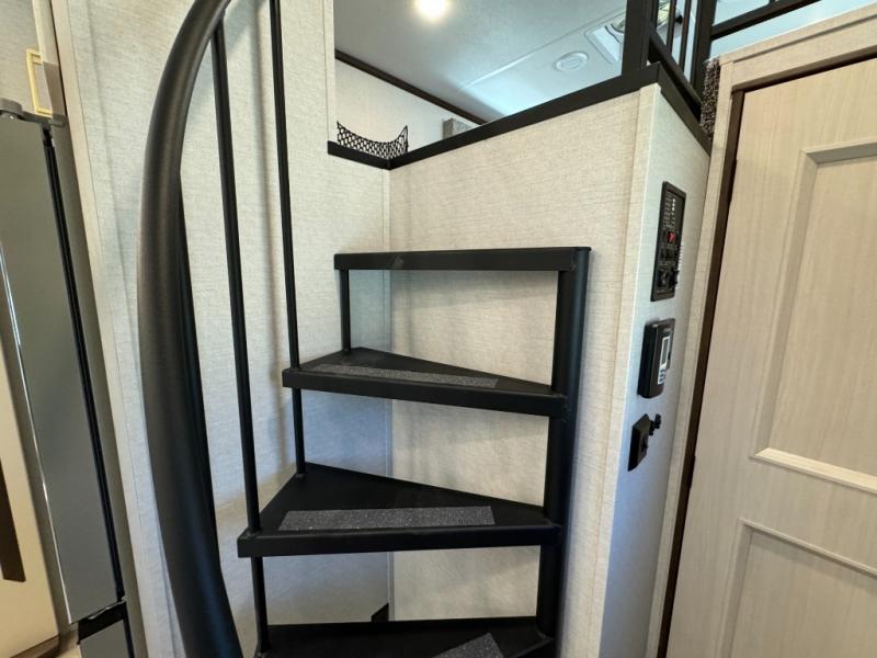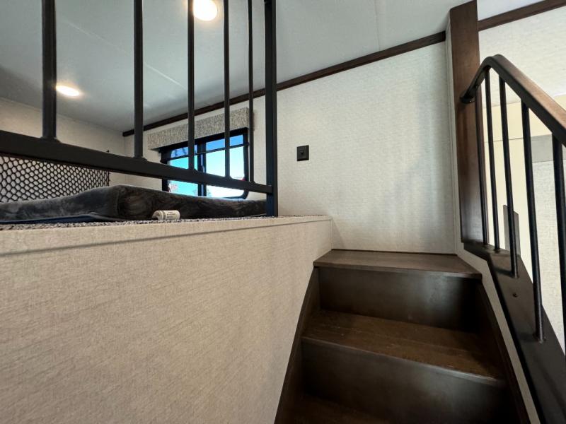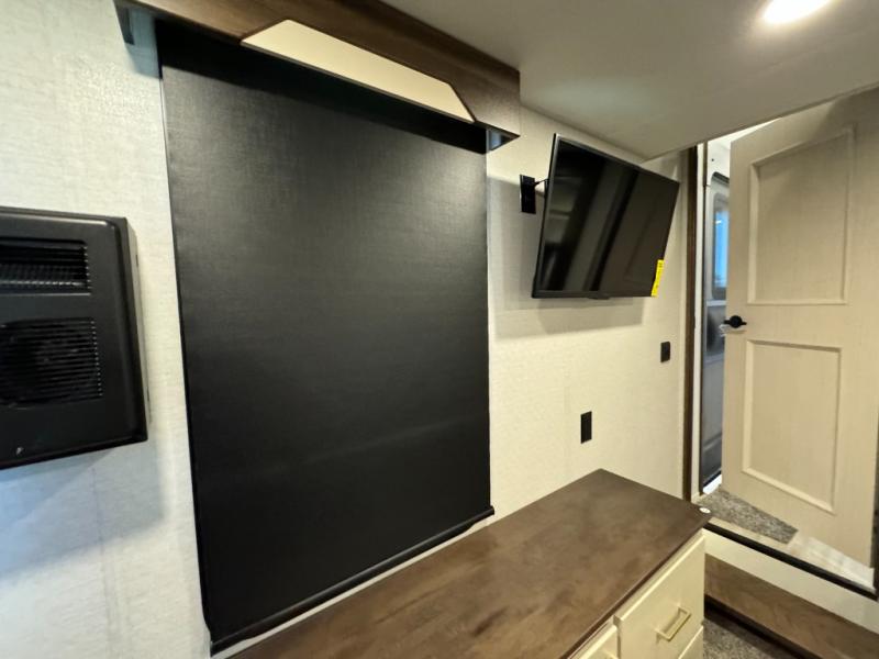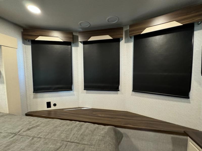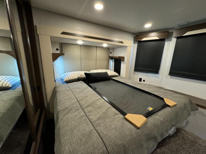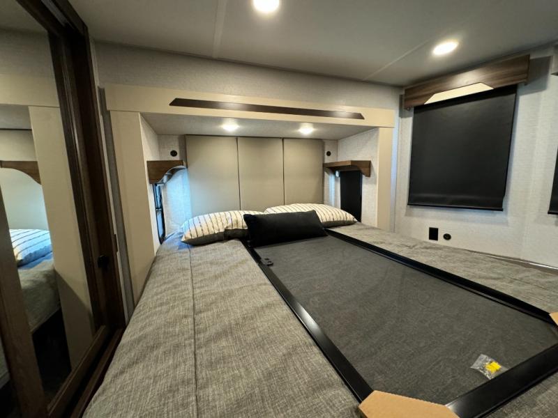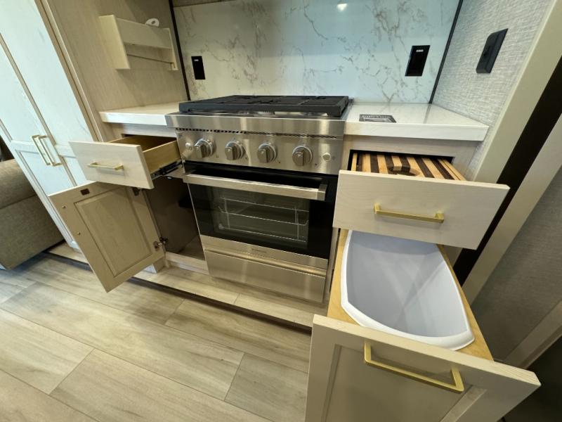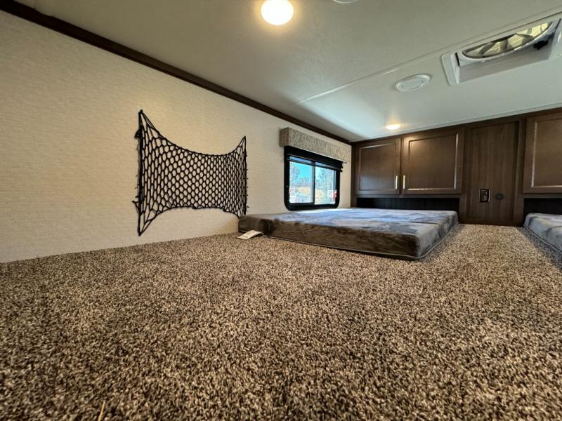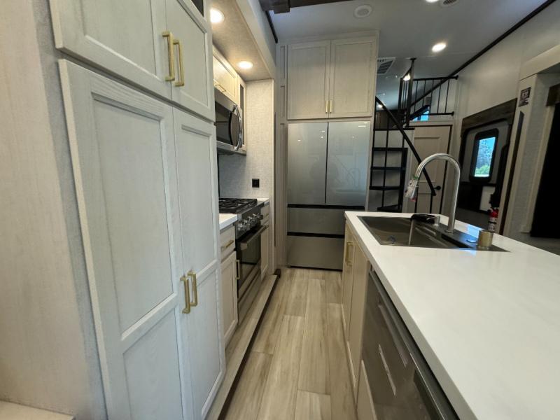 A front and rear loft plus master bedroom offer three different sleeping spaces that you and your family or guests will enjoy. The front master offers a king bed slide, plus two dressers and a wardrobe for clothing. There is also a 32" TV as well. The main combined living and kitchen area features a large L-shaped sectional sofa opposite a swivel mount Smart TV and fireplace mounted on the exterior door that hides a Murphy pantry. The kitchen is fully equipped for all of your cooking needs with a 30" stainless steel microwave, a 12V 20 cu. ft. refrigerator, an island with fold-down breakfast counter. There is also a free standing dinette with an extension and an ottoman.