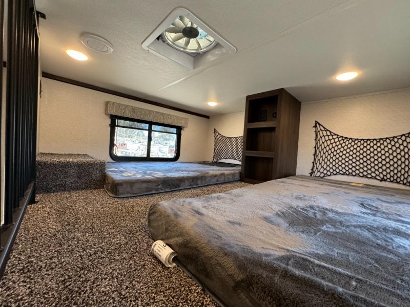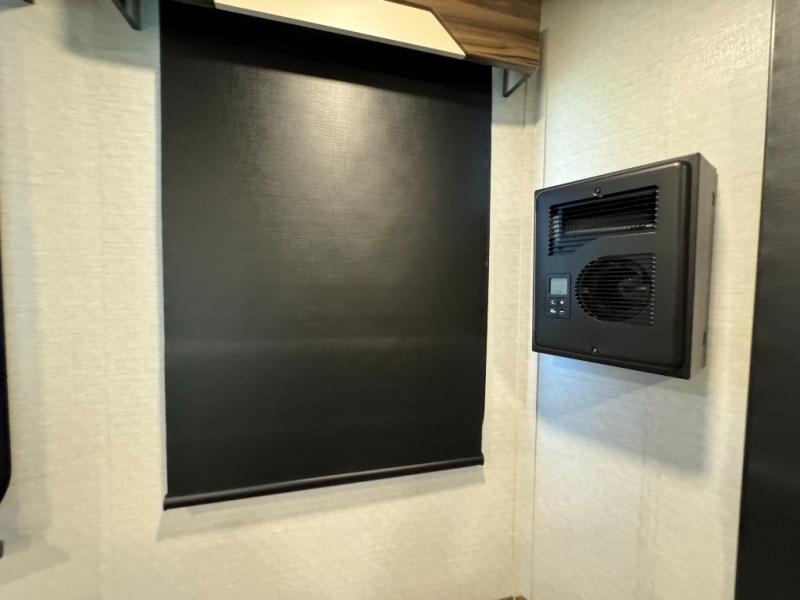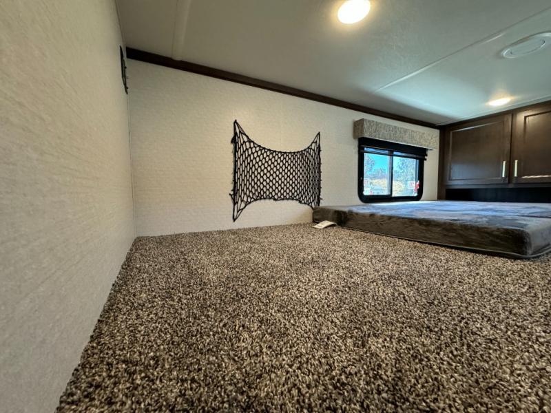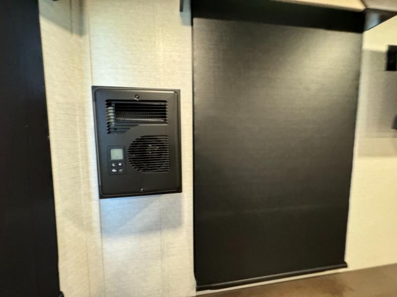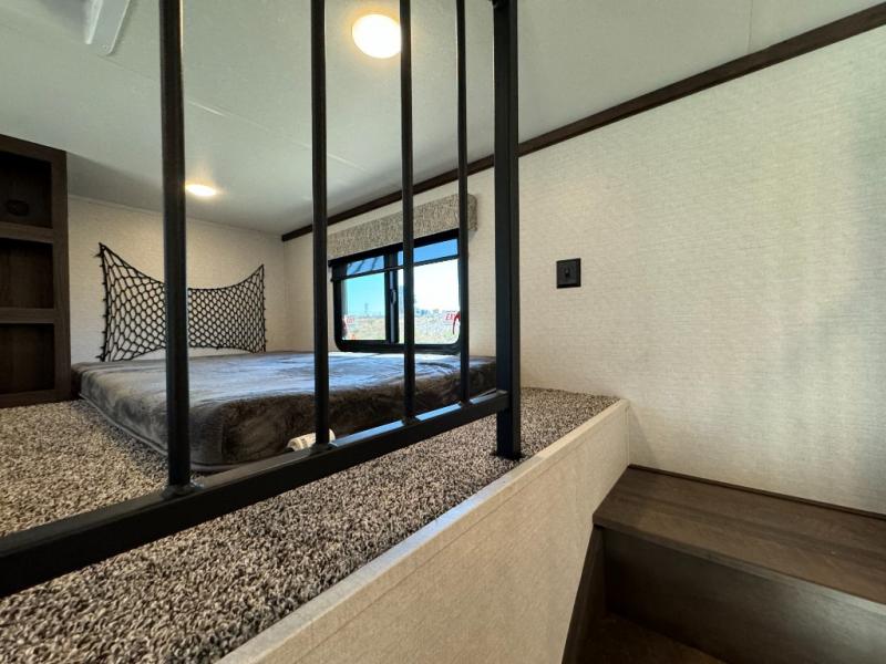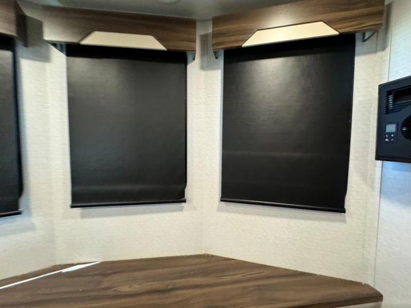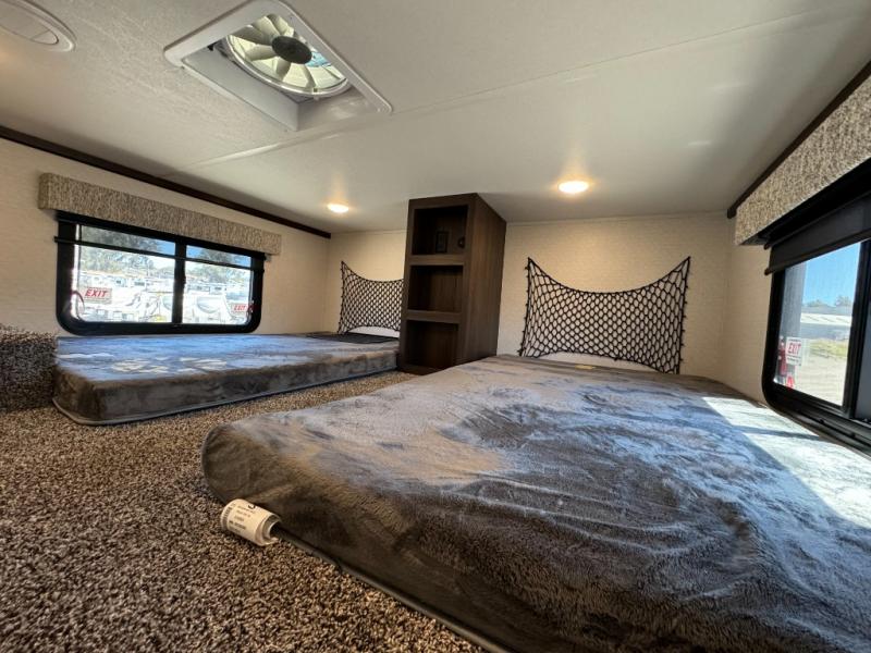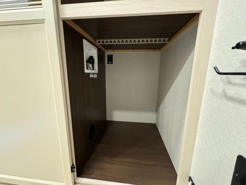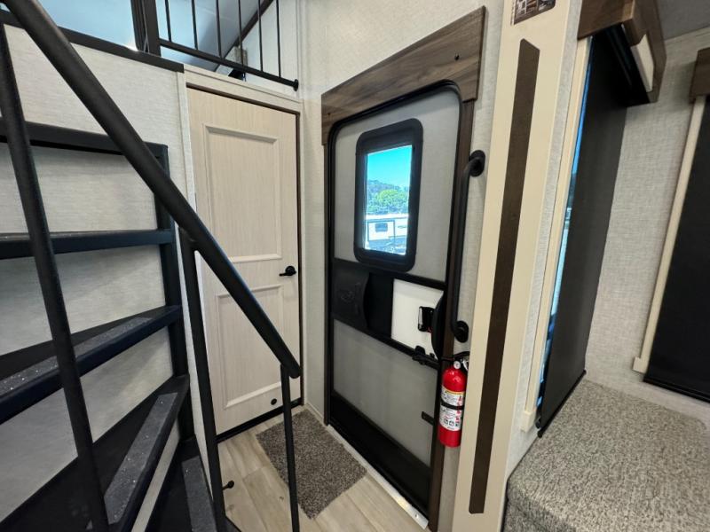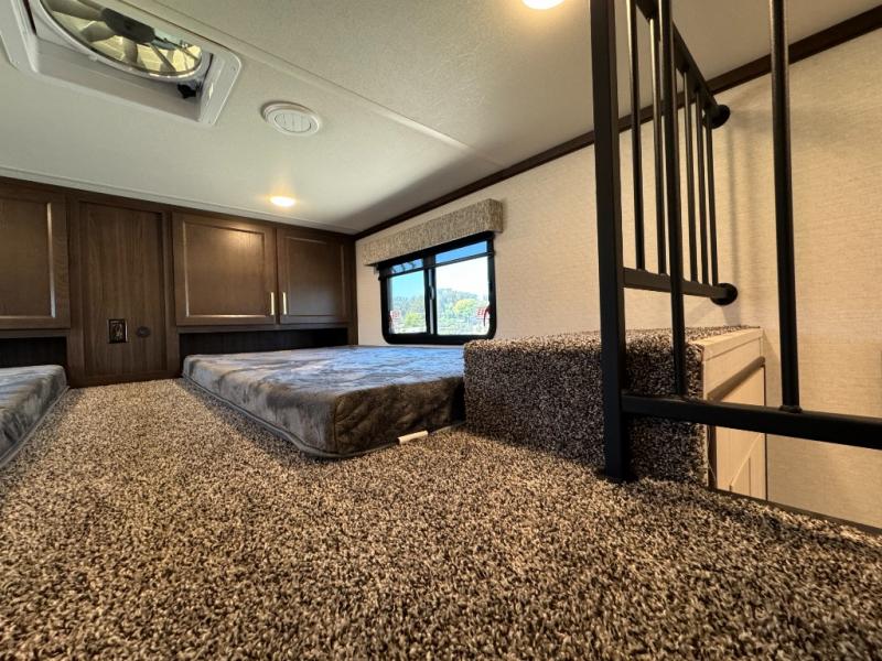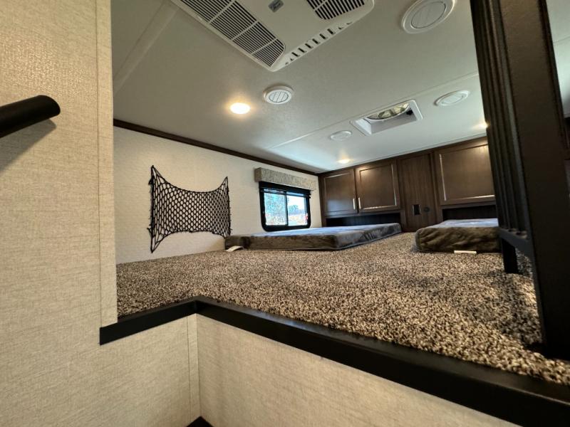 A front and rear loft plus master bedroom offer three different sleeping spaces that you and your family or guests will enjoy. The front master offers a king bed slide, plus two dressers and a wardrobe for clothing. There is also a 32" TV as well. The main combined living and kitchen area features a large L-shaped sectional sofa opposite a swivel mount Smart TV and fireplace mounted on the exterior door that hides a Murphy pantry. The kitchen is fully equipped for all of your cooking needs with a 30" stainless steel microwave, a 12V 20 cu. ft. refrigerator, an island with fold-down breakfast counter. There is also a free standing dinette with an extension and an ottoman.