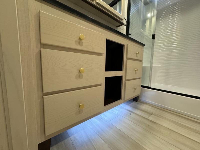 Each time you visit your favorite camping destination, you'll be so grateful to find the Forest River Cedar Creek Cottage destination trailer waiting for you! The exterior has ABS removable underbelly panels, a decorative front cap with a molded picket fence, an electric awning with LED night lighting, and a full, walk-on roof for added durability. The dual-pane patio door will allow you to see the beautiful outside scenery from the comfort of indoors, and the 8' 5" wide body will give your crew plenty of space to stretch out and relax. There are also vinyl floor coverings inside, along with solid surface countertops with stainless steel apron sinks, USB ports in the kitchen and bedroom, plus a spacious shower with a seat and sliding glass doors for added luxury.