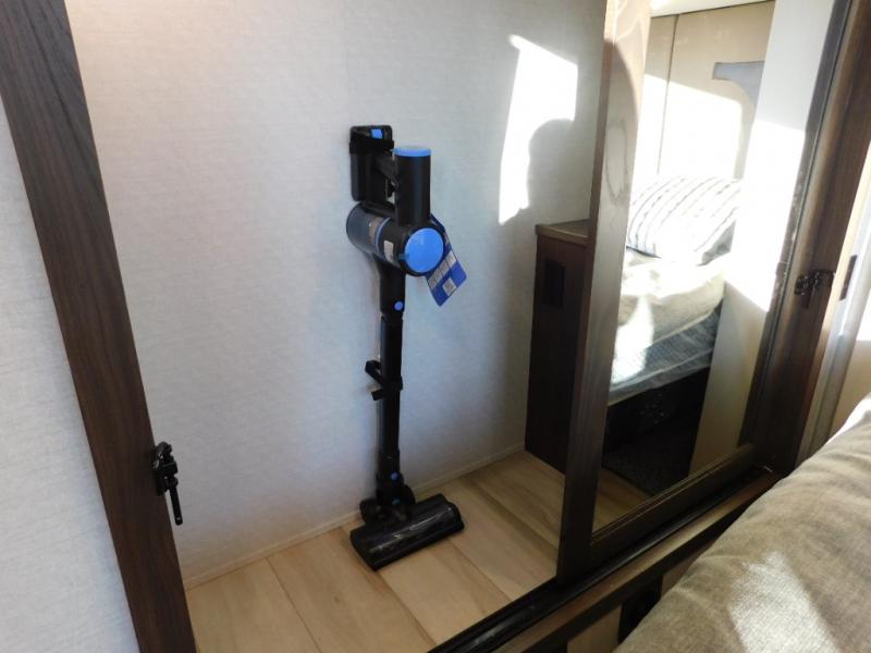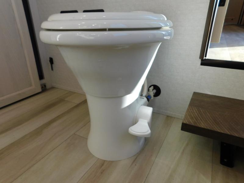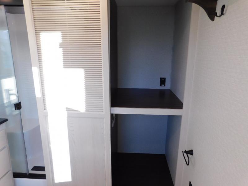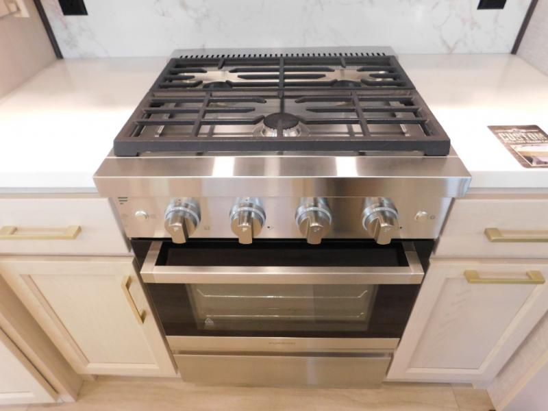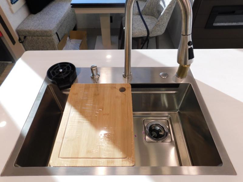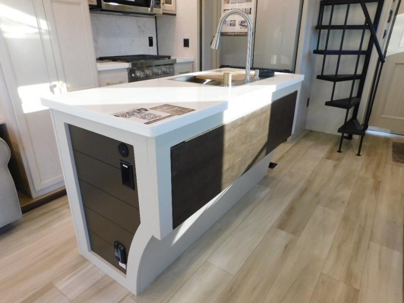 A front and rear loft plus master bedroom offer three different sleeping spaces that you and your family or guests will enjoy. The front master offers a king bed slide, plus two dressers and a wardrobe for clothing. There is also a 32" TV as well. The main combined living and kitchen area features a large L-shaped sectional sofa opposite a swivel mount Smart TV and fireplace mounted on the exterior door that hides a Murphy pantry. The kitchen is fully equipped for all of your cooking needs with a 30" stainless steel microwave, a 12V 20 cu. ft. refrigerator, an island with fold-down breakfast counter. There is also a free standing dinette with an extension and an ottoman.
