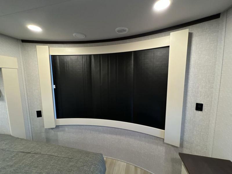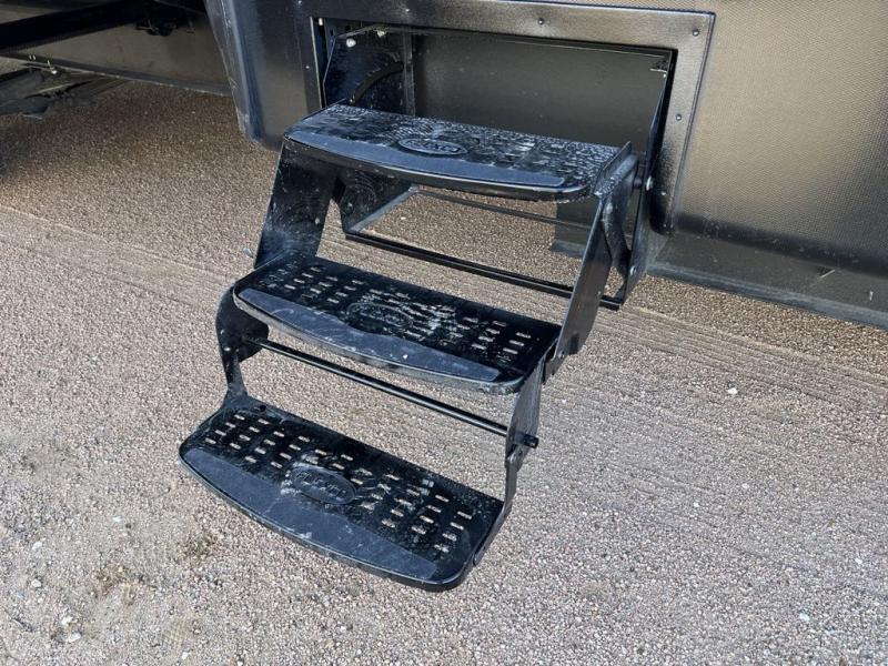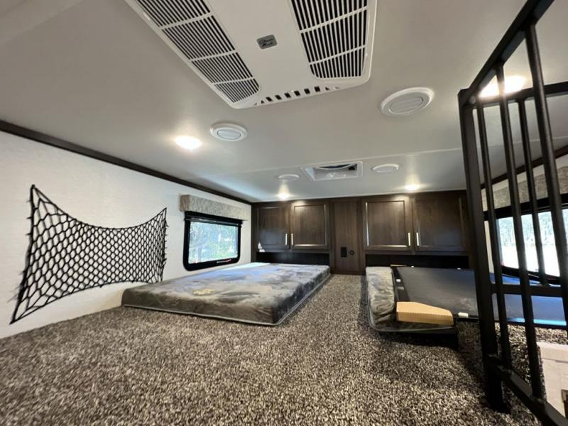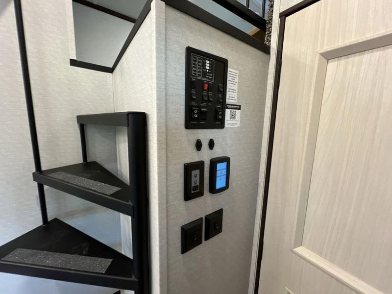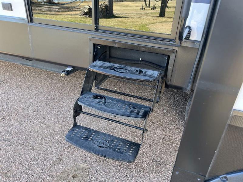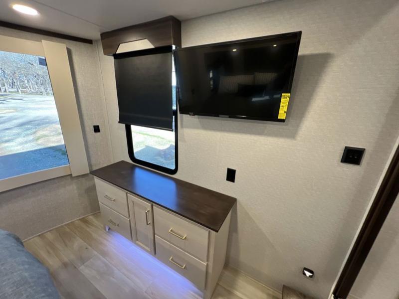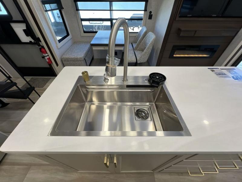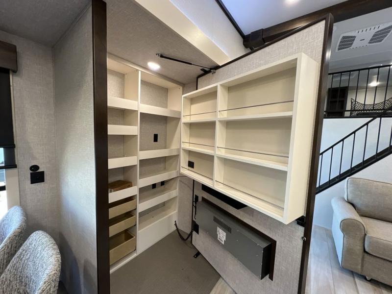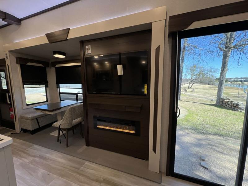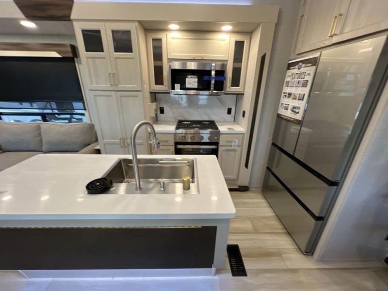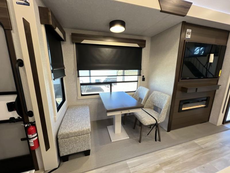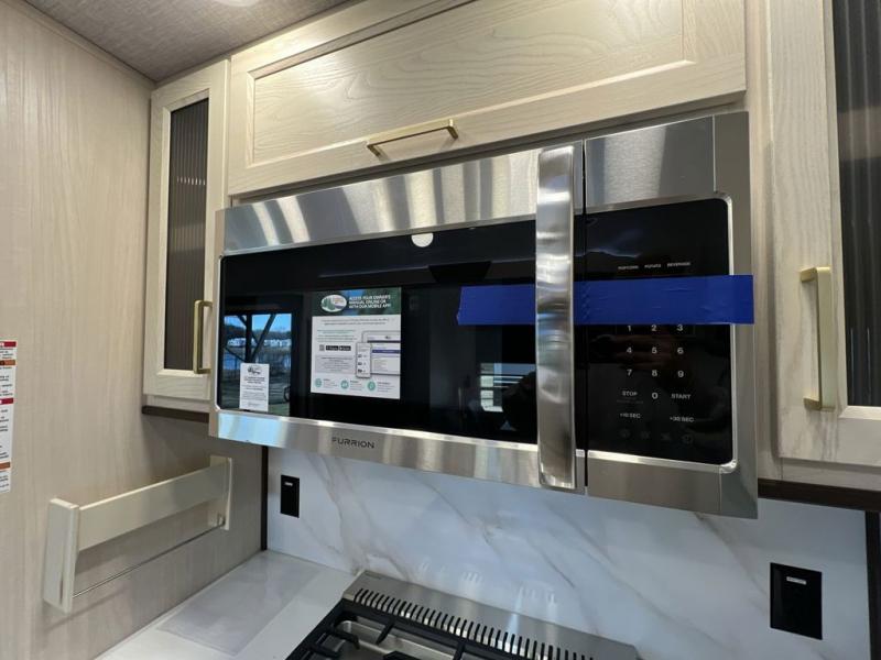 A front and rear loft plus master bedroom offer three different sleeping spaces that you and your family or guests will enjoy. The front master offers a king bed slide, plus two dressers and a wardrobe for clothing. There is also a 32" TV as well. The main combined living and kitchen area features a large L-shaped sectional sofa opposite a swivel mount Smart TV and fireplace mounted on the exterior door that hides a Murphy pantry. The kitchen is fully equipped for all of your cooking needs with a 30" stainless steel microwave, a 12V 18 cu. ft. refrigerator, and an island with fold-down breakfast counter. There is also a free standing dinette with an extension and an ottoman.