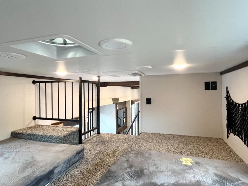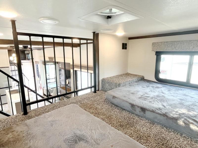 A front and rear loft plus master bedroom offer three different sleeping spaces that you and your family or guests will enjoy. The front master offers a king bed slide, plus two dressers and a wardrobe for clothing. There is also a 32" TV as well. The main combined living and kitchen area features a large L-shaped sectional sofa opposite a swivel mount Smart TV and fireplace mounted on the exterior door that hides a Murphy pantry. The kitchen is fully equipped for all of your cooking needs with a 30" stainless steel microwave, a 12V 18 cu. ft. refrigerator, and an island with fold-down breakfast counter. There is also a free standing dinette with an extension and an ottoman.