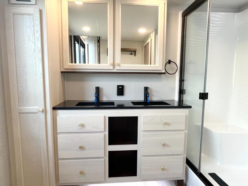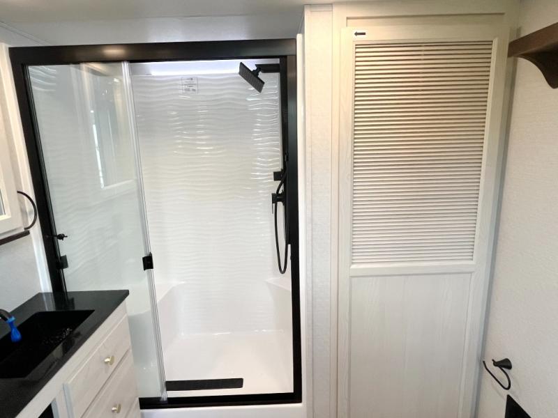 With any Cedar Creek Cottage destination trailer by Forest River, you can enjoy extended stays with residential features at the location of your choice! Each model is built with 3M bonded sidewalls that grow stronger with age and are resistant to UV, heat, oil, moisture, and more. There is also an AlphaPly TPO roof membrane, detachable entry steps, and new waterproof and bug proof Vixenite slide room floor panels for added durability. Head inside where you'll find residential dovetail, self-closing drawers, flush floor slides in the kitchen and living area, a residential style headboard and luxurious bedding decor, and extra storage for linens in the bedroom and bath. Each model is also pre-wired for satellite to the roof, and you can stay connected with the new Cradle Point WiFi/5G antenna and Day 1 connectivity.