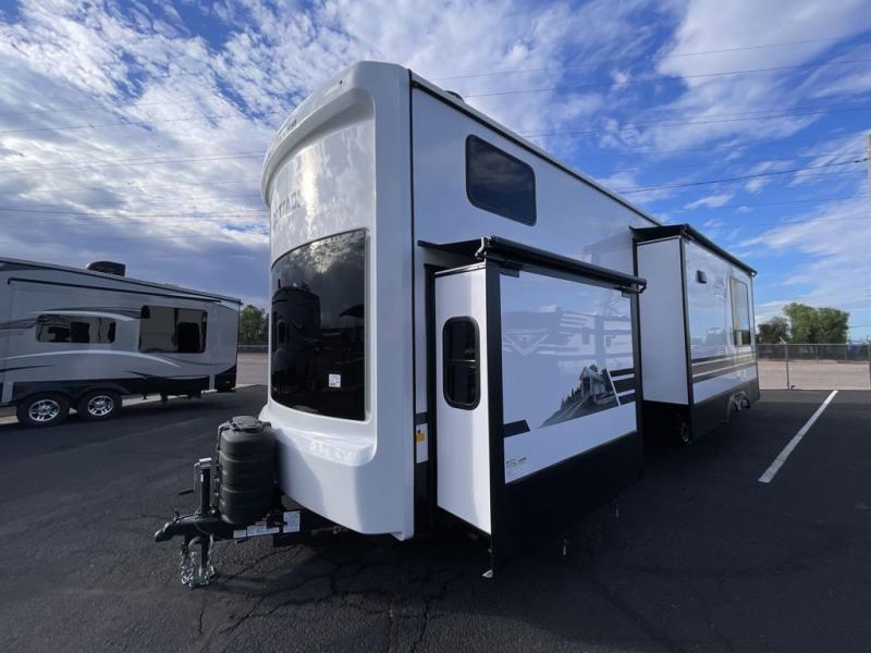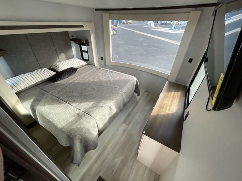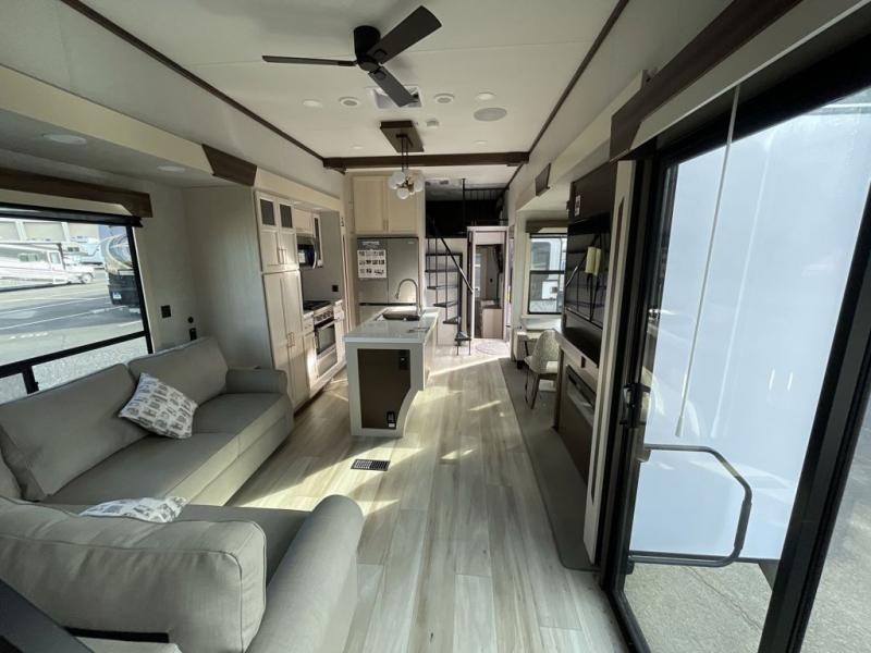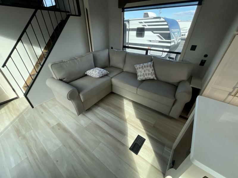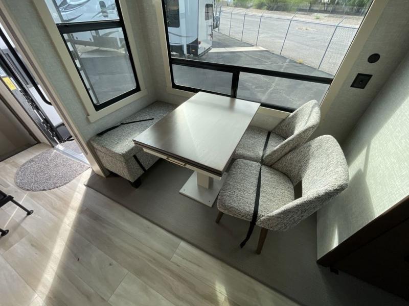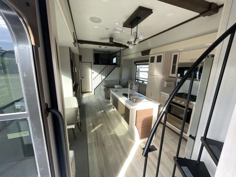 A front and rear loft plus master bedroom offer three different sleeping spaces that you and your family or guests will enjoy. The front master offers a king bed slide, plus two dressers and a wardrobe for clothing. There is also a 32" TV as well. The main combined living and kitchen area features a large L-shaped sectional sofa opposite a swivel mount Smart TV and fireplace mounted on the exterior door that hides a Murphy pantry. The kitchen is fully equipped for all of your cooking needs with a 30" stainless steel microwave, a 12V 18 cu. ft. refrigerator, and an island with fold-down breakfast counter. There is also a free standing dinette with an extension and an ottoman.