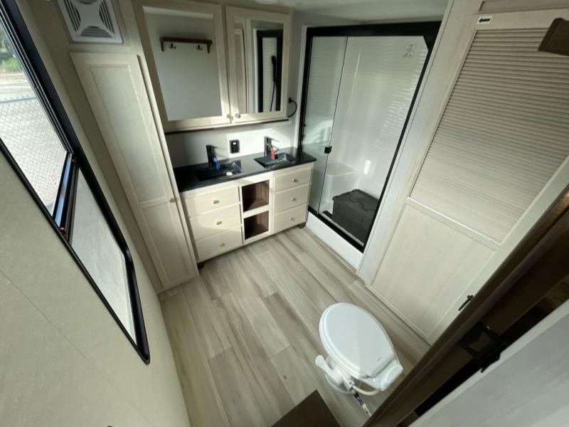 With any Cedar Creek Cottage destination trailer by Forest River, you can enjoy extended stays with residential features at the location of your choice! Each model is built with 3M bonded sidewalls that grow stronger with age and are resistant to UV, heat, oil, moisture, and more. There is also an AlphaPly TPO roof membrane, detachable entry steps, and new waterproof and bug proof Vixenite slide room floor panels for added durability. Head inside where you'll find residential dovetail, self-closing drawers, flush floor slides in the kitchen and living area, a residential style headboard and luxurious bedding decor, and extra storage for linens in the bedroom and bath. Each model is also pre-wired for satellite to the roof, and you can stay connected with the new Cradle Point WiFi/5G antenna and Day 1 connectivity.