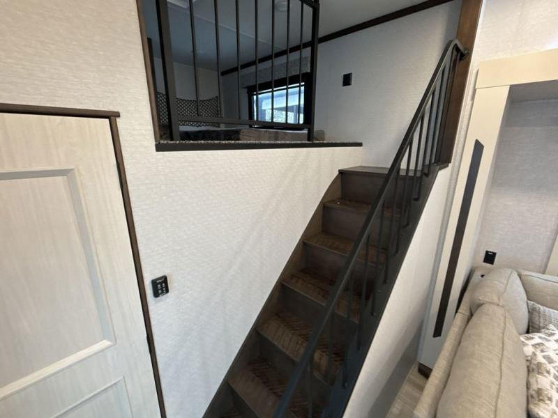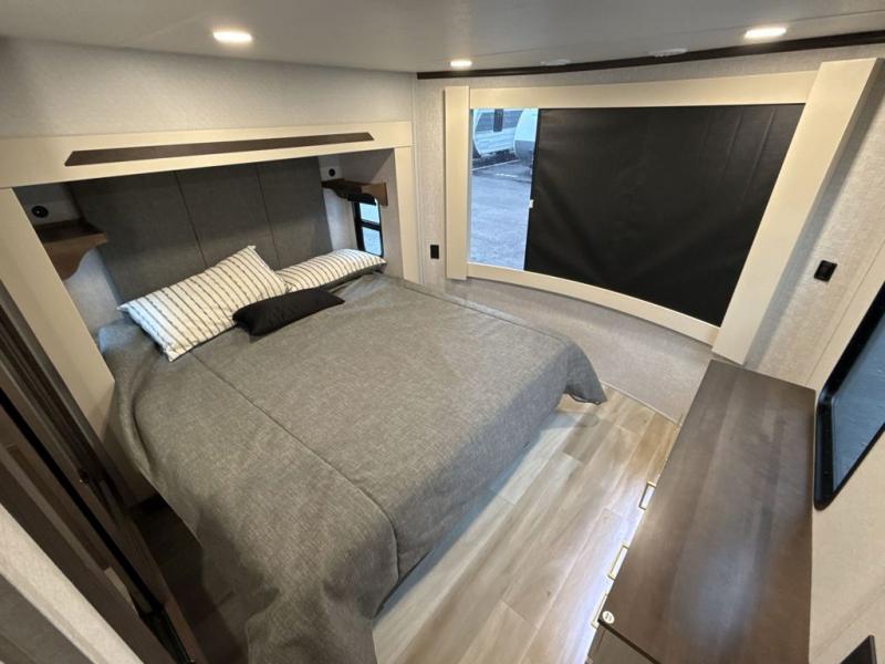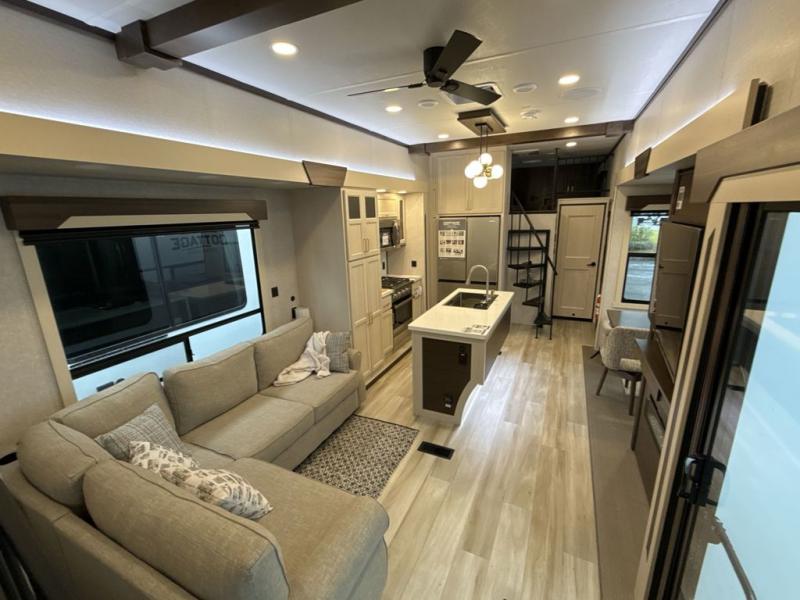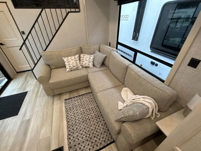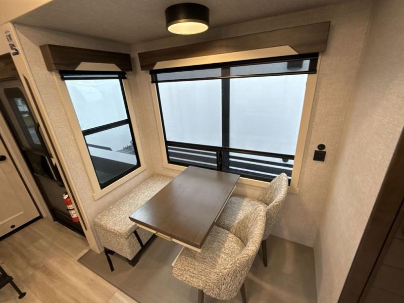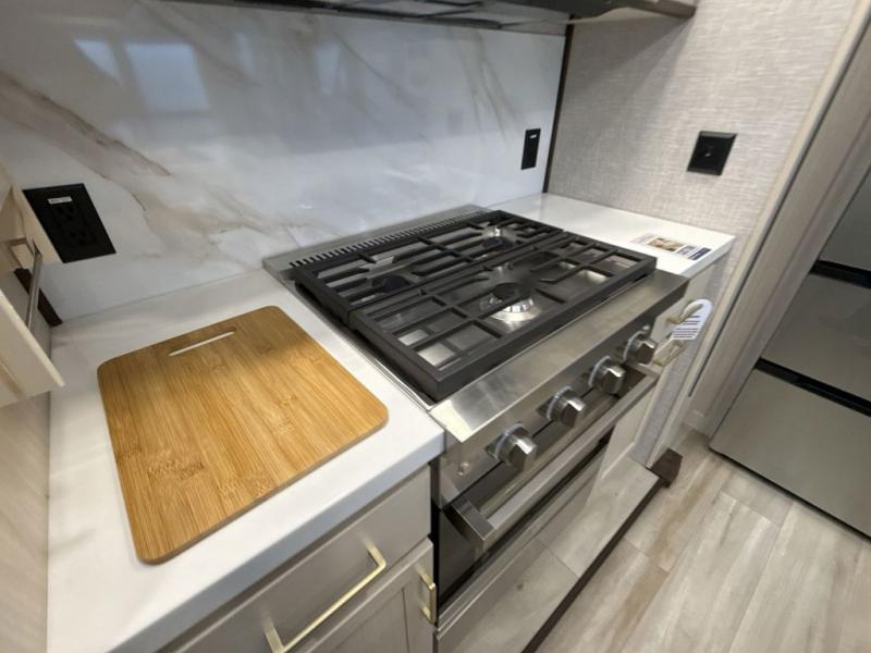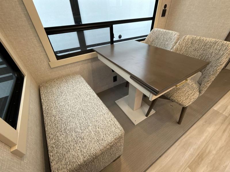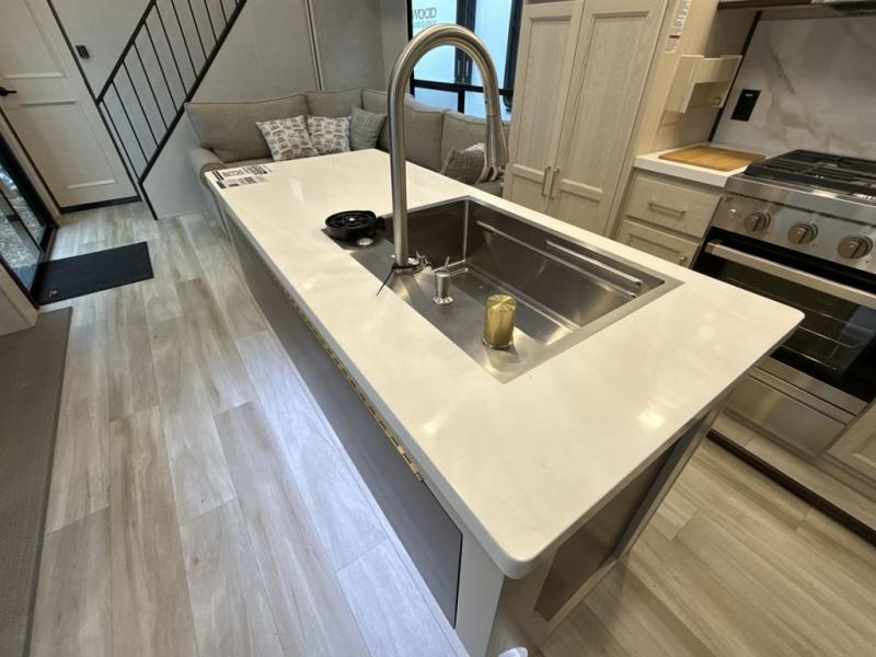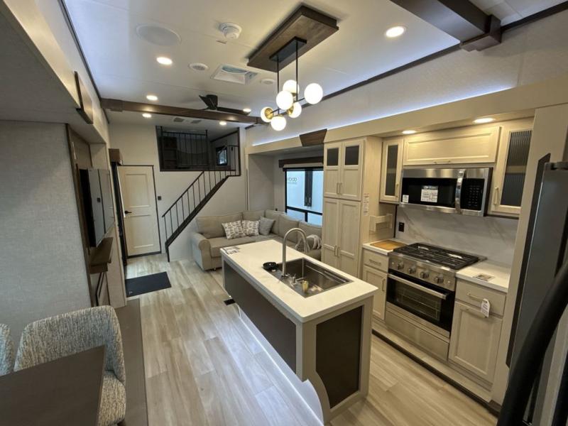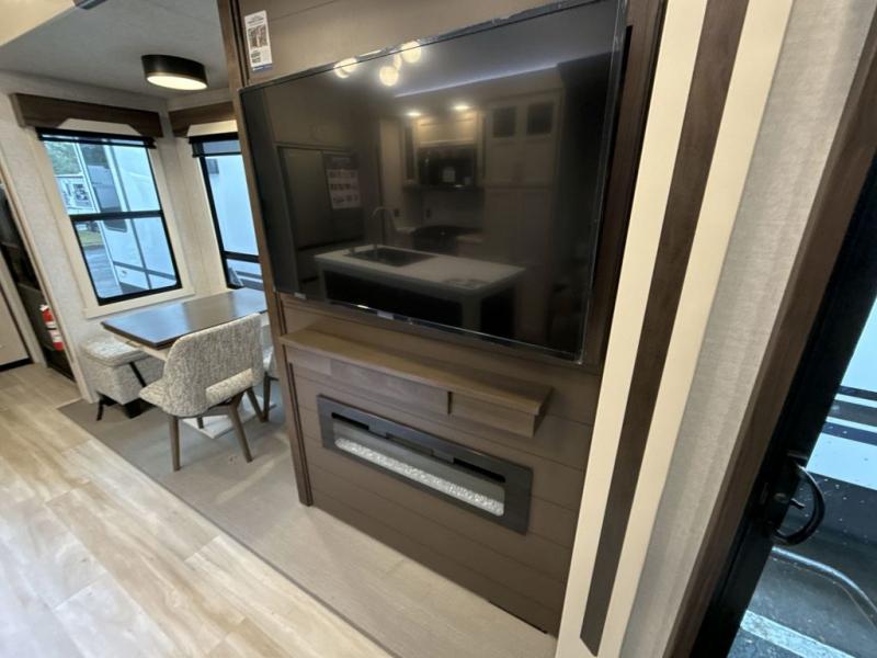 A front and rear loft plus master bedroom offer three different sleeping spaces that you and your family or guests will enjoy. The front master offers a king bed slide, plus two dressers and a wardrobe for clothing. There is also a 32" TV as well. The main combined living and kitchen area features a large L-shaped sectional sofa opposite a swivel mount Smart TV and fireplace mounted on the exterior door that hides a Murphy pantry. The kitchen is fully equipped for all of your cooking needs with a 30" stainless steel microwave, a 12V 18 cu. ft. refrigerator, and an island with fold-down breakfast counter. There is also a free standing dinette with an extension and an ottoman.