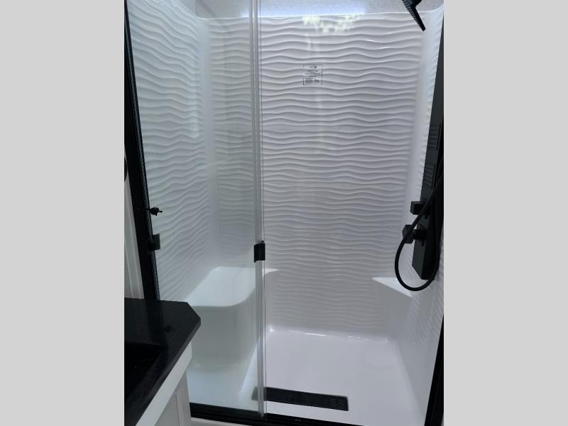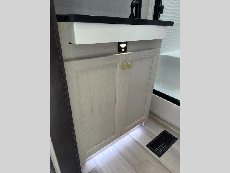 Each time you visit your favorite camping destination, you'll be so grateful to find the Forest River Cedar Creek Cottage destination trailer waiting for you! The exterior has ABS removable underbelly panels, a decorative front cap with a molded picket fence, an electric awning with LED night lighting, and a full, walk-on roof for added durability. The dual-pane patio door will allow you to see the beautiful outside scenery from the comfort of indoors, and the 8' 5" wide body will give your crew plenty of space to stretch out and relax. There are also vinyl floor coverings inside, along with solid surface countertops with stainless steel apron sinks, USB ports in the kitchen and bedroom, plus a spacious shower with a seat and sliding glass doors for added luxury.