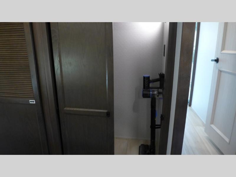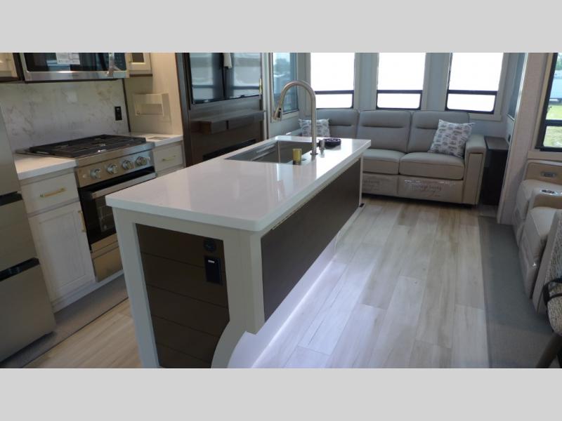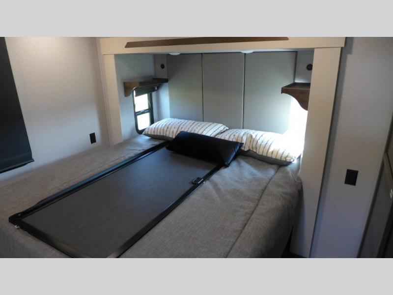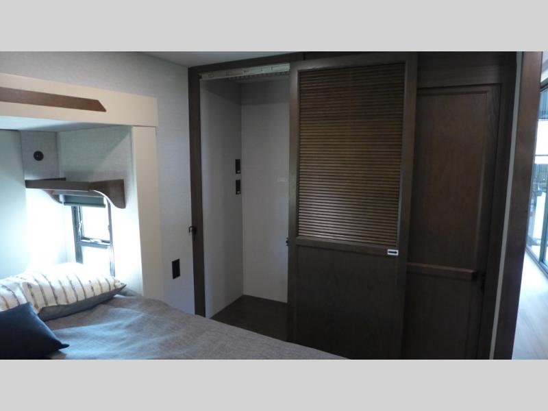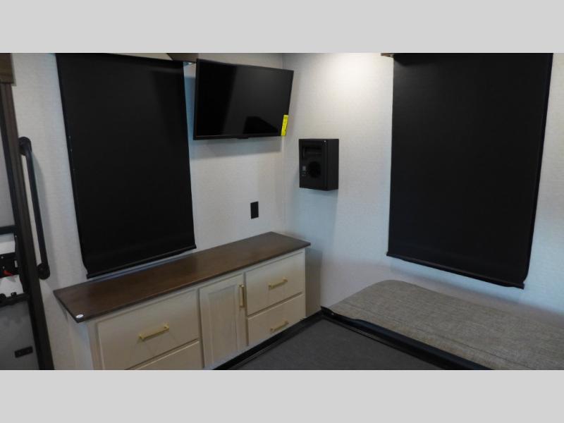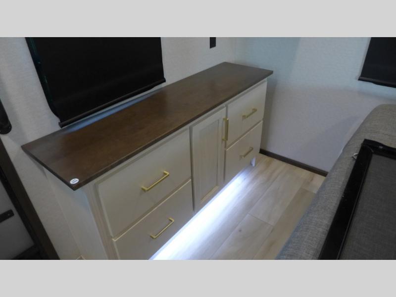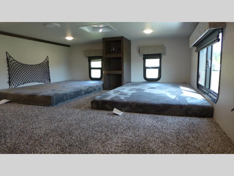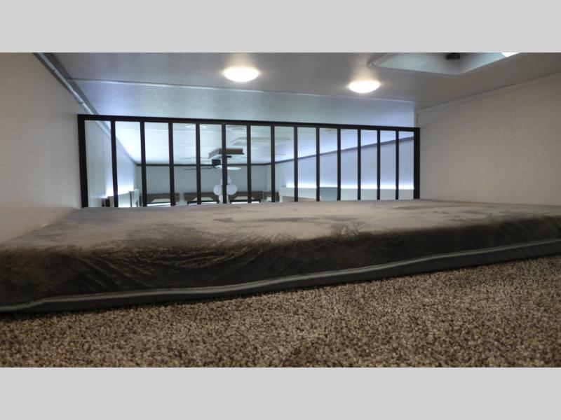 The star feature of this Cedar Creek Cottage destination trailer is the huge loft area. Take the stairs up to the loft to see the three bunk mats and wardrobe. There is also a railing that prevents anyone from falling off the edge. The rear private bedroom offers you a king bed slide for the most comfort, and there is also a dresser that you can use to store clothing in. The full bathroom comes with a 30" x 48" fiberglass shower with seat, a large, and a linen closet. You will also have a fully equipped kitchen featuring a pantry, a 20 cu. ft. stainless 12-volt refrigerator, 30” stainless over-the-range microwave, and a beautiful island with sink and storage.