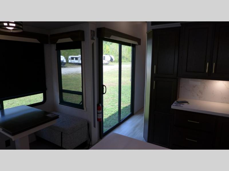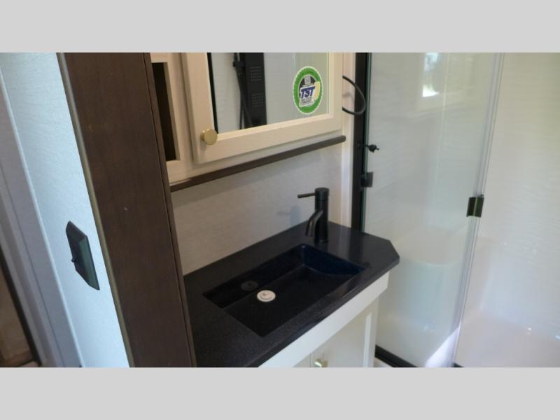 Each time you visit your favorite camping destination, you'll be so grateful to find the Forest River Cedar Creek Cottage destination trailer waiting for you! The exterior has ABS removable underbelly panels, a decorative front cap with a molded picket fence, an electric awning with LED night lighting strip, and a full, walk-on roof for added durability. The dual-pane patio door will allow you to see the beautiful outside scenery from the comfort of indoors, and the 8' 5" wide body will give your crew plenty of space to stretch out and relax. There are also vinyl floor coverings inside, along with solid surface countertops with stainless steel apron sinks, USB ports in the kitchen and bedroom, plus a spacious shower with a seat and sliding glass doors for added luxury.