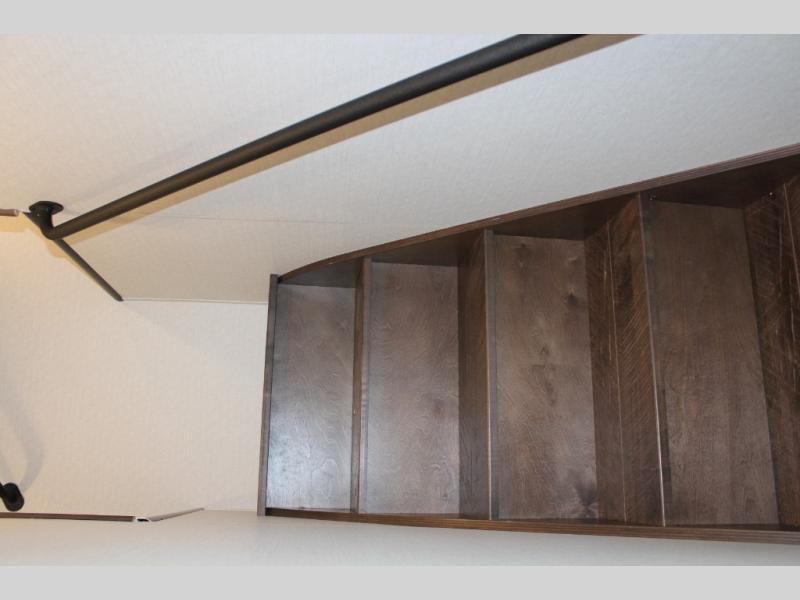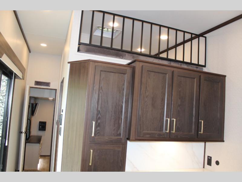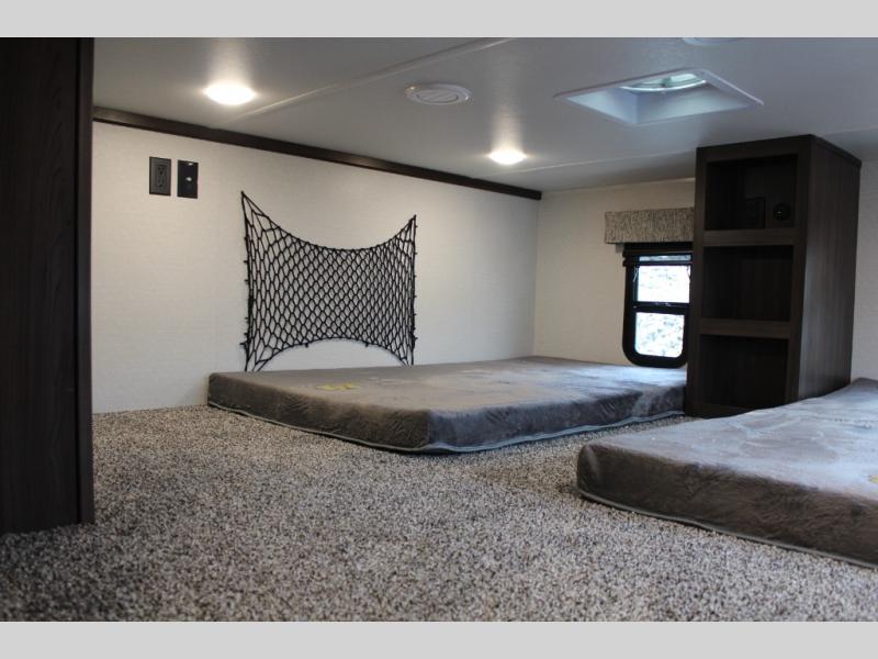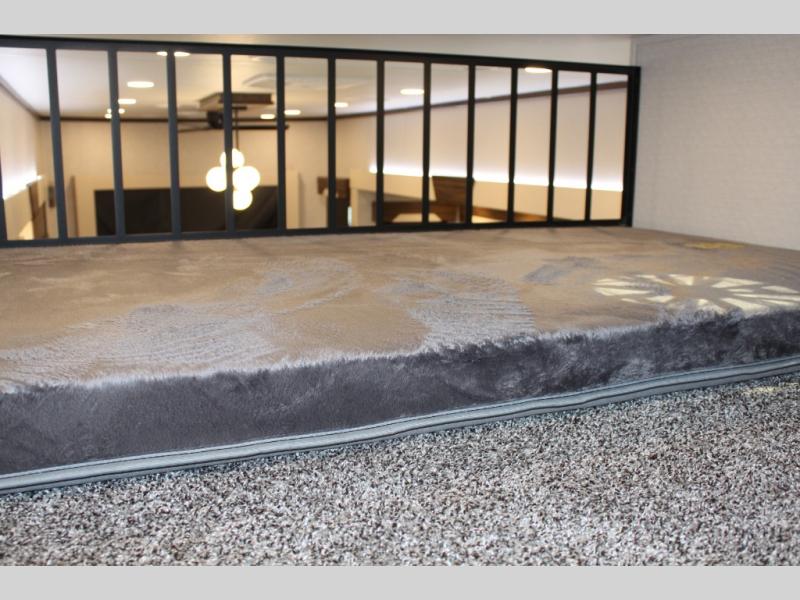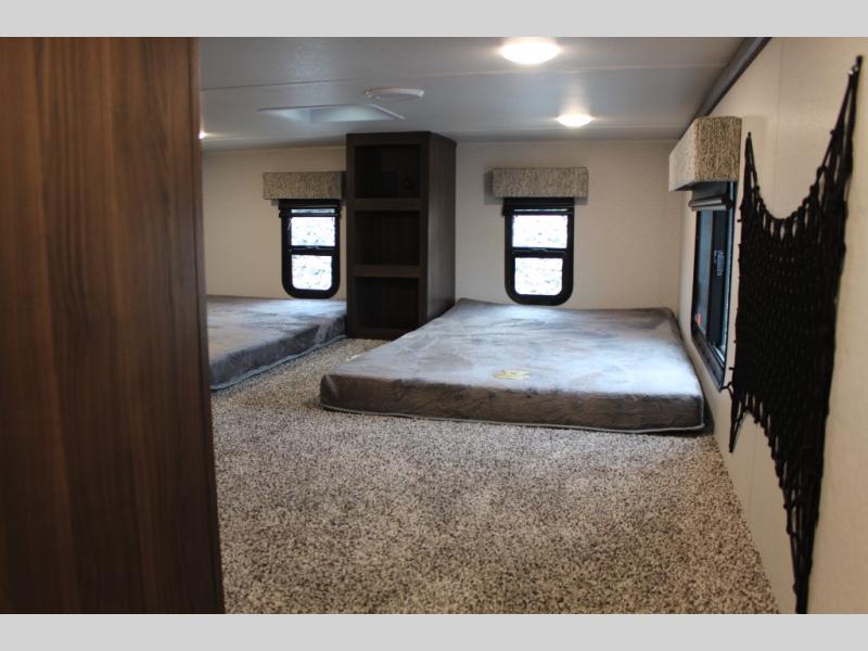 The star feature of this Cedar Creek Cottage destination trailer is the huge loft area. Take the stairs up to the loft to see the three bunk mats and wardrobe. There is also a railing that helps prevent anyone from falling off the edge. The rear private bedroom offers you a king bed slide for the most comfort, and there is also a dresser that you can use to store clothing in. The full bathroom comes with a 30" x 48" fiberglass shower with seat, a large, and a linen closet. You will also have a fully equipped kitchen featuring a pantry, 18 cu. ft. 12-volt refrigerator, 30” stainless over-the-range microwave, and a beautiful island with a sink and fold-down breakfast counter.