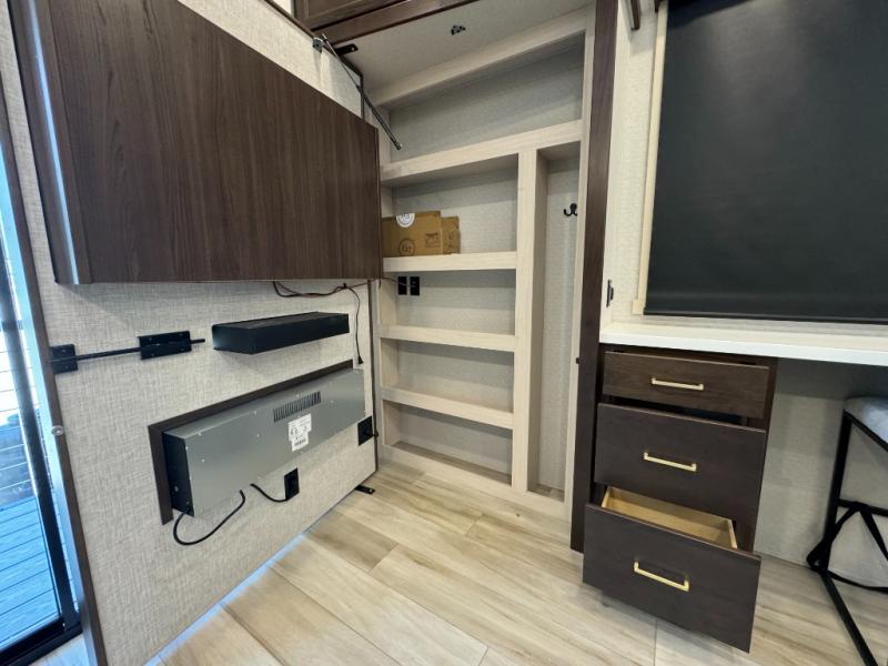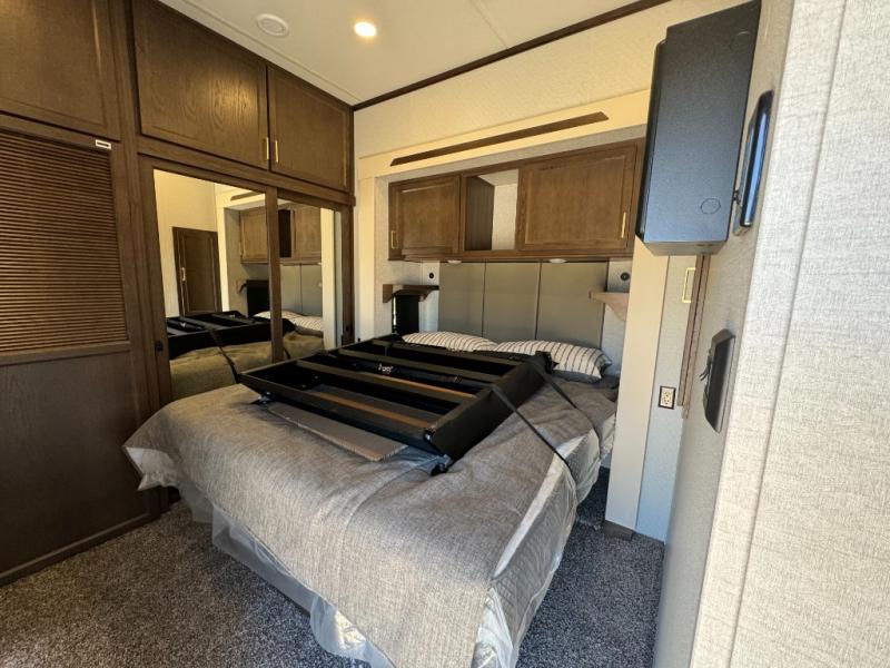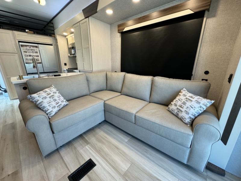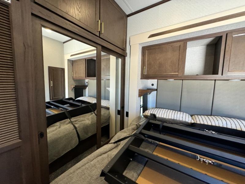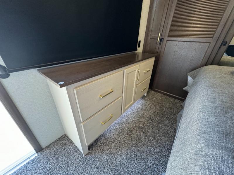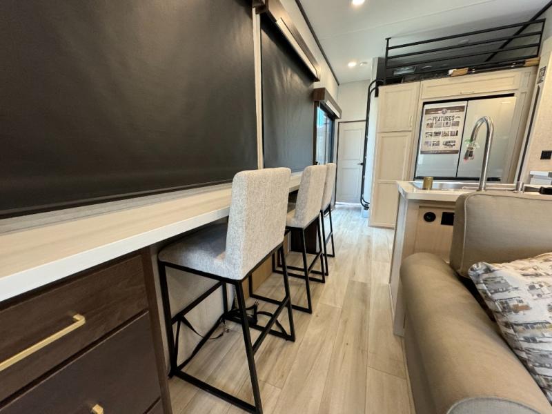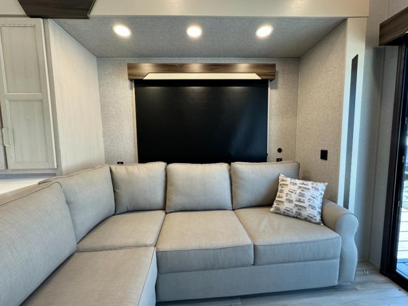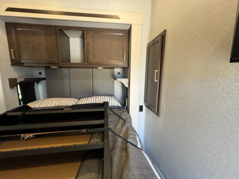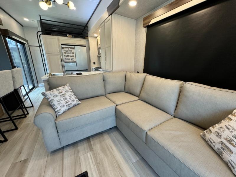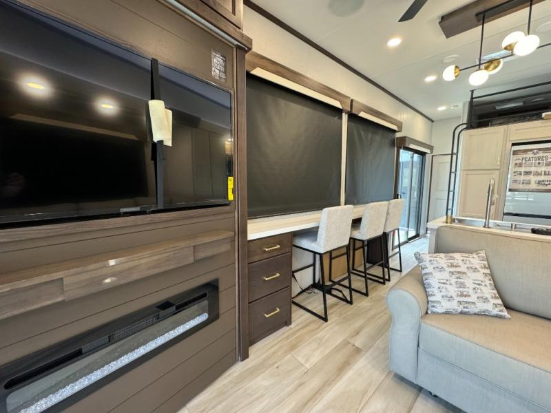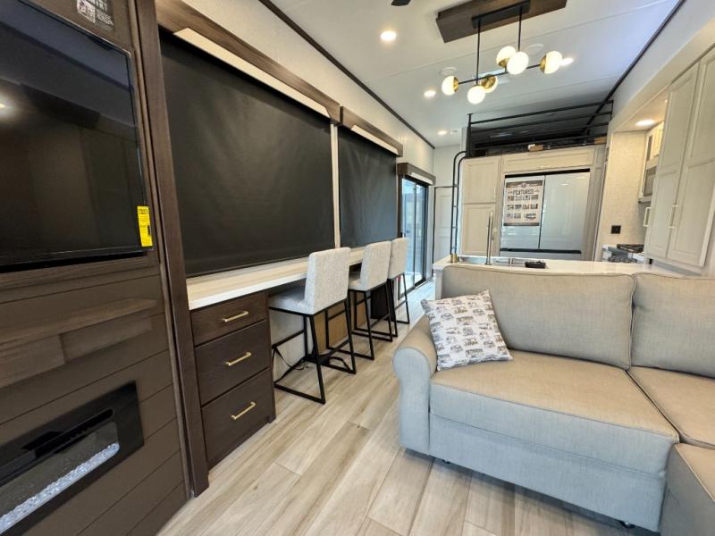 If you need more sleeping or storage space, this destination trailer is the one for you! There is a front covered porch with sliding glass doors that enters in to the front living area. Here, you'll enjoy relaxing on the sectional hide-a-bed sofa across from the entertainment center and fireplace. The spacious bar top with two seats will provide a place to dine, and the middle kitchen is any chef's dream with its two pantries, spacious 20 cu. ft. 12V refrigerator, and plenty of counter space! When you're ready for your own space, you can retreat to the rear bedroom where you'll find a king bed slide out, a wardrobe, a dresser, drawers, and even washer and dryer prep. The comfort doesn't stop there! There is also a loft above the full bath that includes a ladder and a mattress, so you can use this space for more sleeping or storage space!