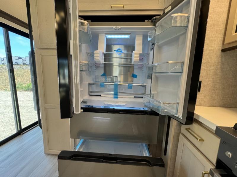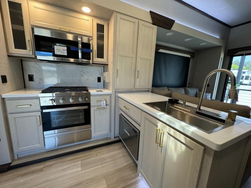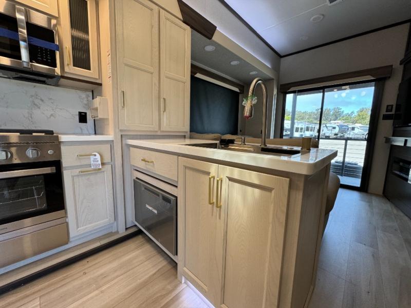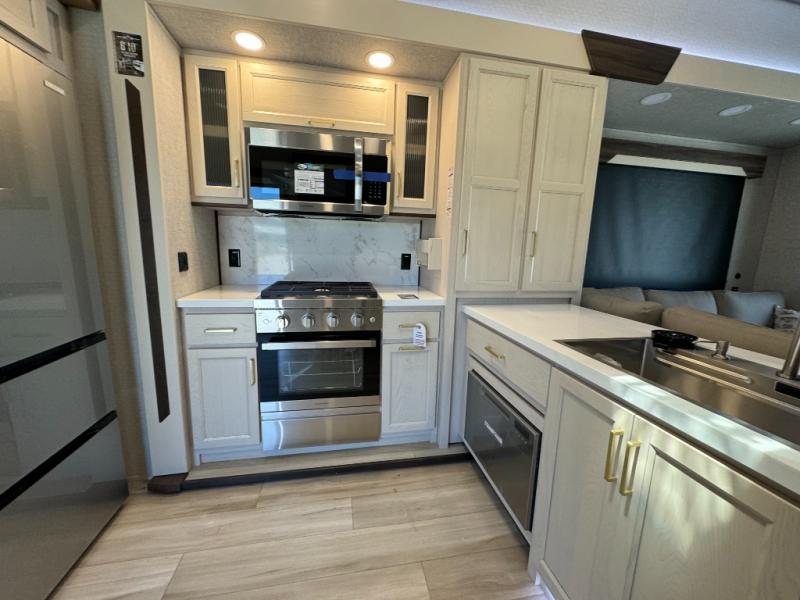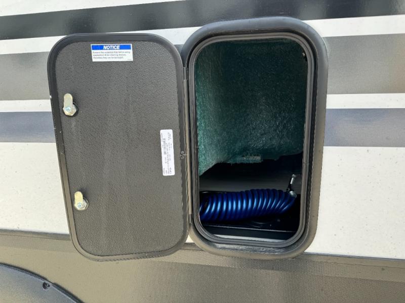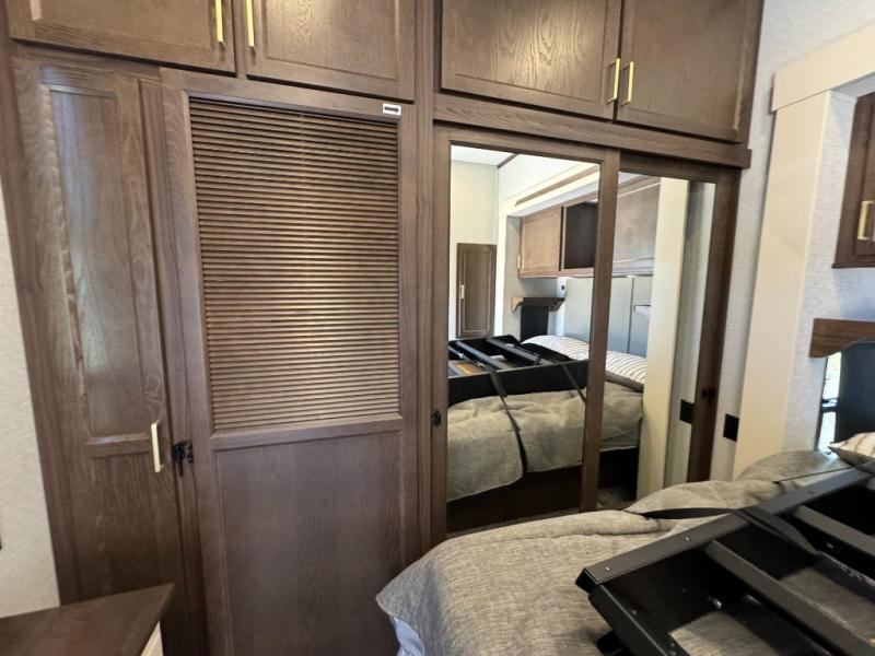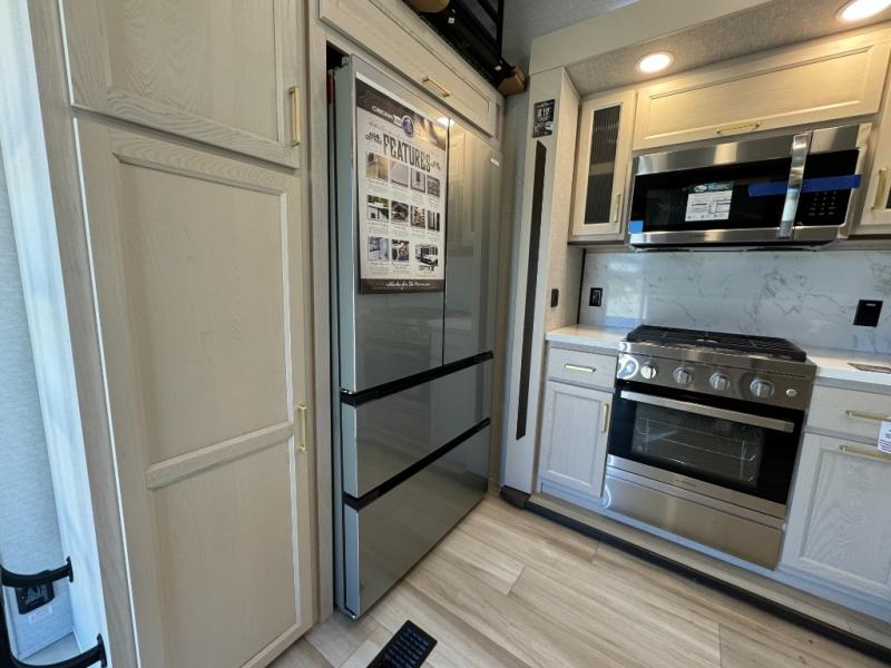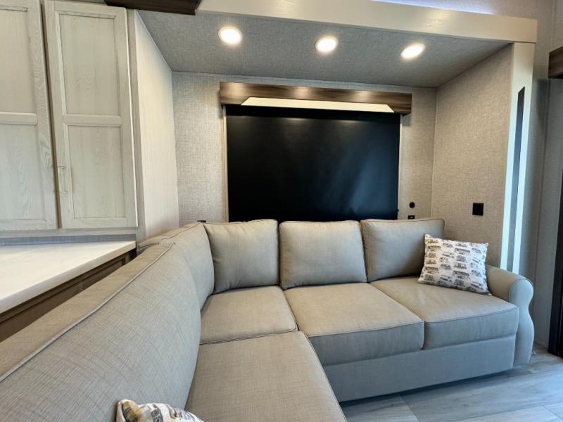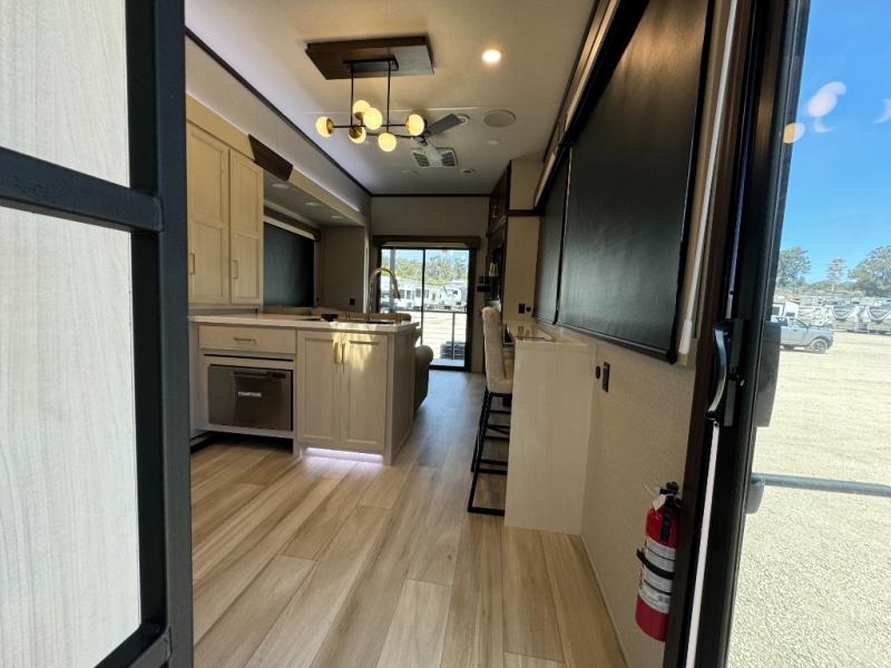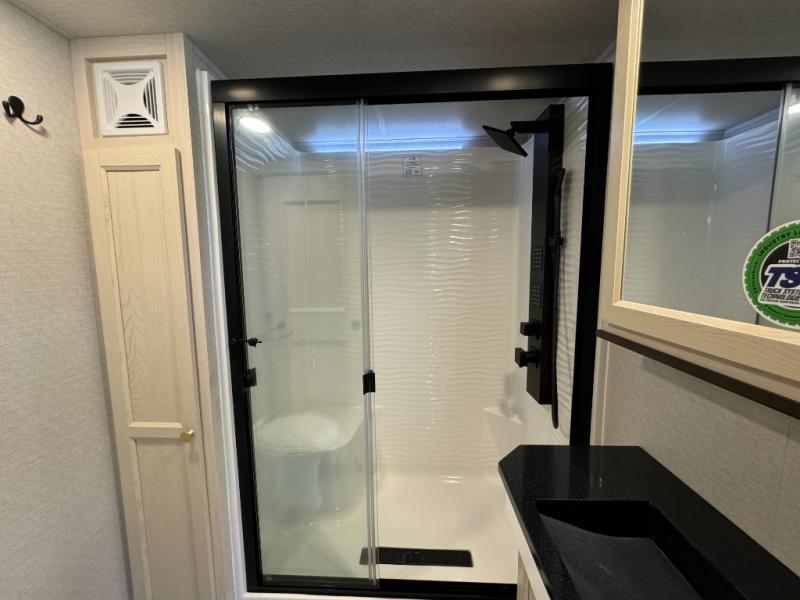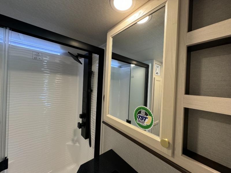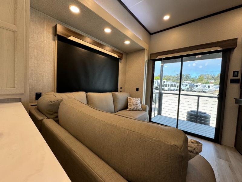 If you need more sleeping or storage space, this destination trailer is the one for you! There is a front covered porch with sliding glass doors that enters in to the front living area. Here, you'll enjoy relaxing on the sectional hide-a-bed sofa across from the entertainment center and fireplace. The spacious bar top with two seats will provide a place to dine, and the middle kitchen is any chef's dream with its two pantries, spacious 20 cu. ft. 12V refrigerator, and plenty of counter space! When you're ready for your own space, you can retreat to the rear bedroom where you'll find a king bed slide out, a wardrobe, a dresser, drawers, and even washer and dryer prep. The comfort doesn't stop there! There is also a loft above the full bath that includes a ladder and a mattress, so you can use this space for more sleeping or storage space!