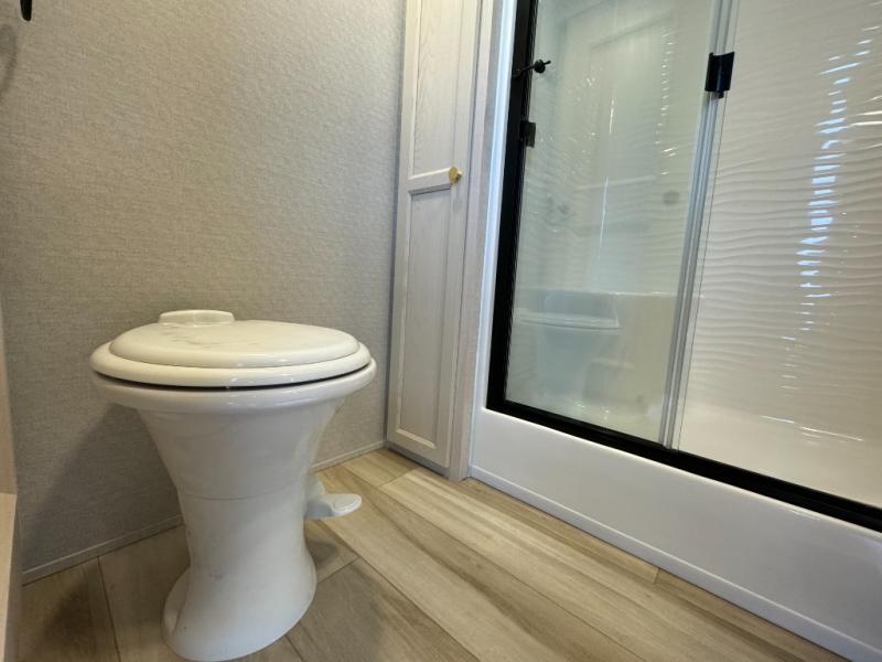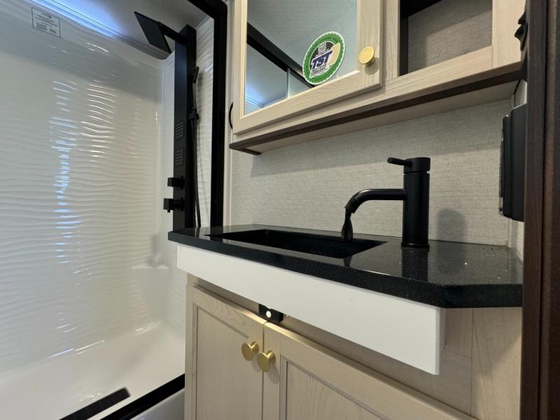 Each time you visit your favorite camping destination, you'll be so grateful to find the Forest River Cedar Creek Cottage destination trailer waiting for you! The exterior has ABS removable underbelly panels, a decorative front cap with a molded picket fence, an electric awning with LED night lighting, and a full, walk-on roof for added durability. The dual-pane patio door will allow you to see the beautiful outside scenery from the comfort of indoors, and the 8' 5" wide body will give your crew plenty of space to stretch out and relax. There are also vinyl floor coverings inside, along with solid surface countertops with stainless steel apron sinks, USB ports in the kitchen and bedroom, plus a spacious shower with a seat and sliding glass doors for added luxury.