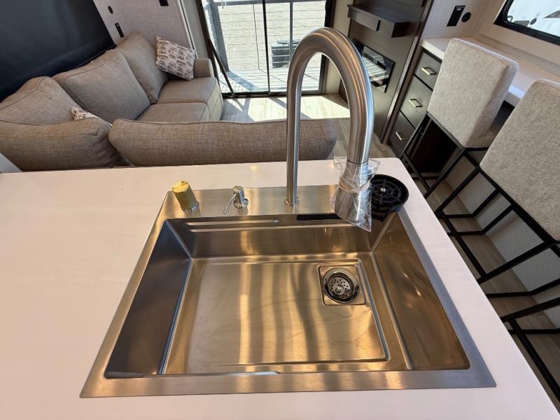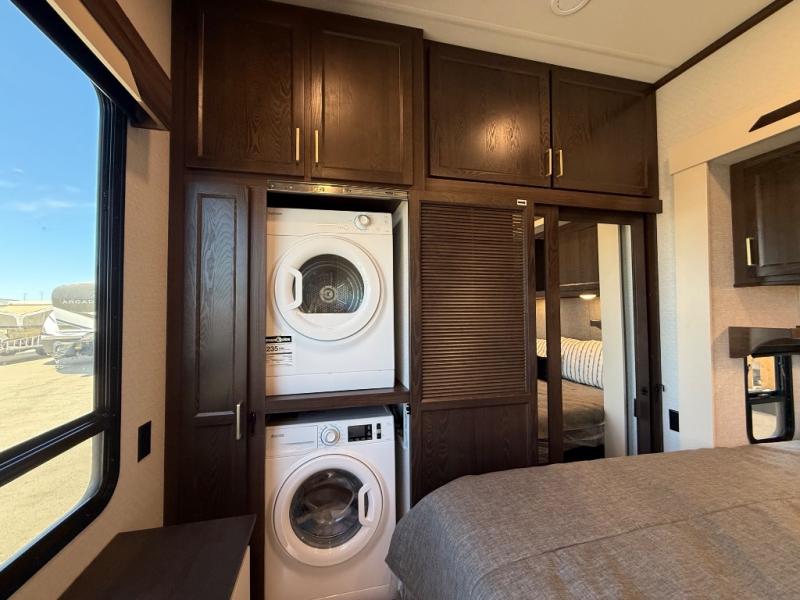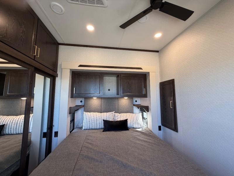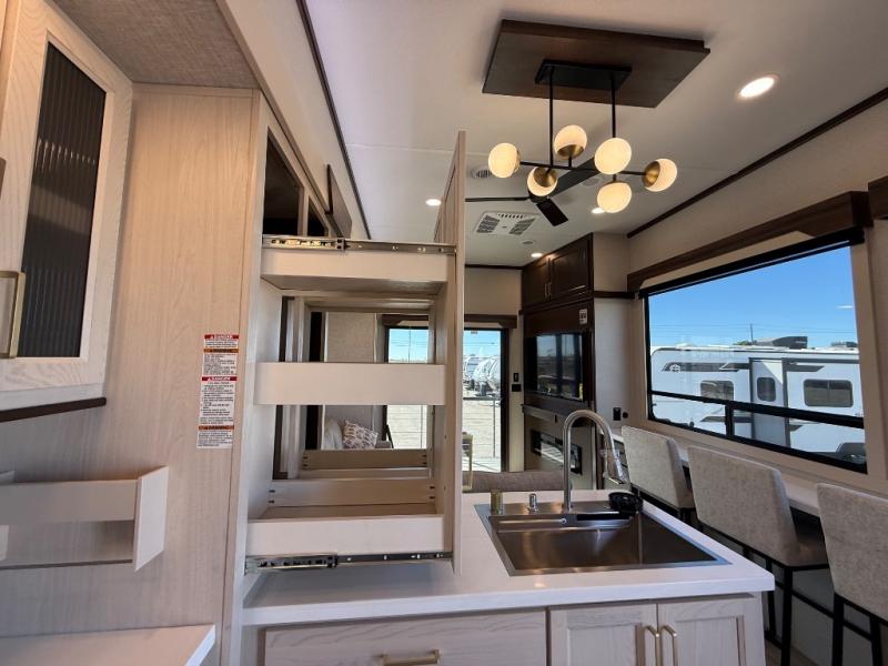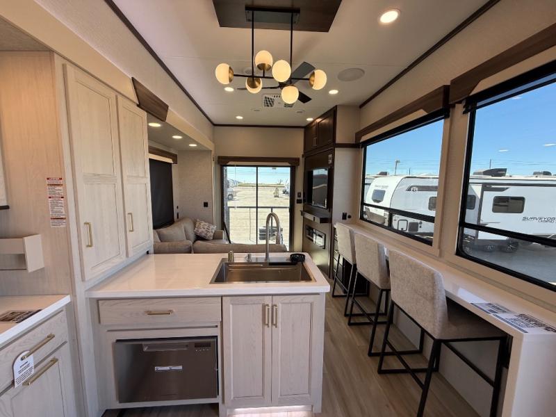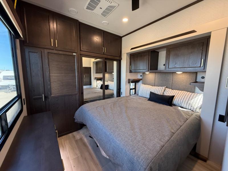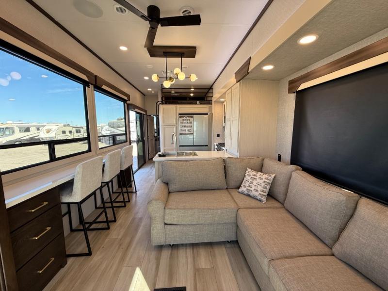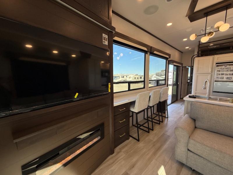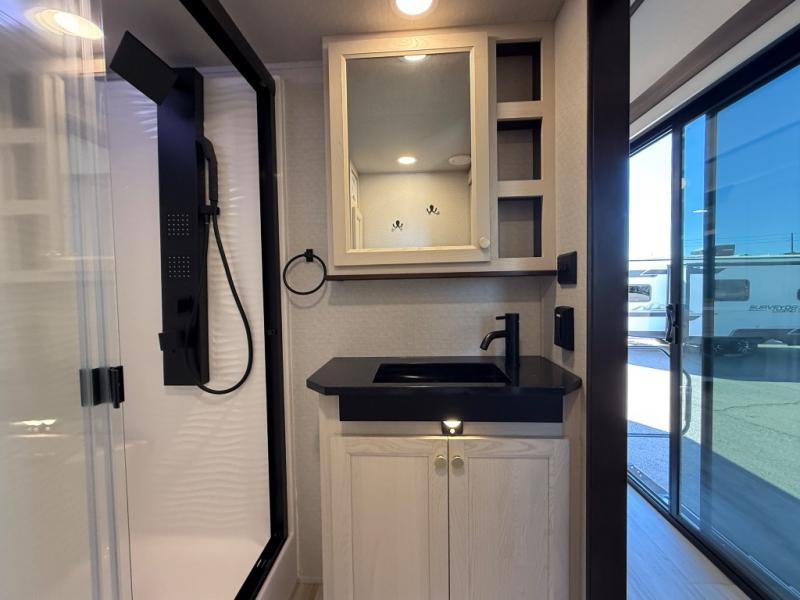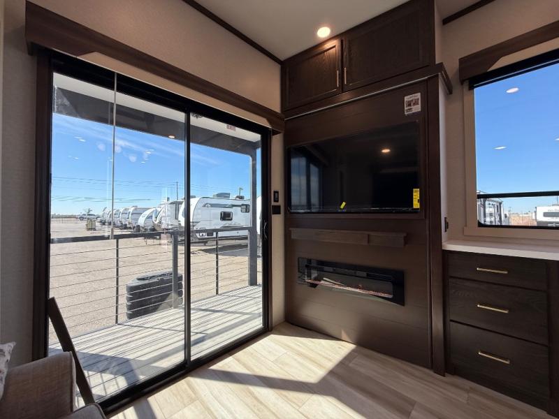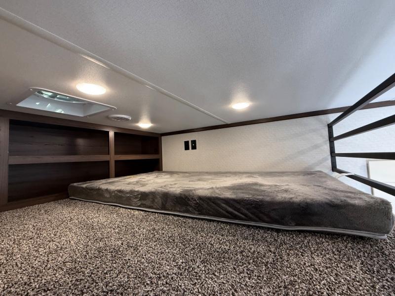 If you need more sleeping or storage space, this destination trailer is the one for you! There is a front covered porch with sliding glass doors that enters in to the front living area. Here, you'll enjoy relaxing on the sectional hide-a-bed sofa across from the entertainment center and fireplace. The spacious bar top with three seats will provide a place to dine, and the middle kitchen is any chef's dream with its two pantries, spacious 18 cu. ft. 12V refrigerator, and plenty of counter space! When you're ready for your own space, you can retreat to the rear bedroom where you'll find a king bed slide out, a wardrobe, a dresser, drawers, and even washer and dryer prep. The comfort doesn't stop there! There is also a loft above the full bath that includes a ladder and a mattress, so you can use this space for more sleeping or storage space!