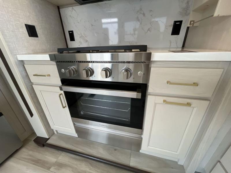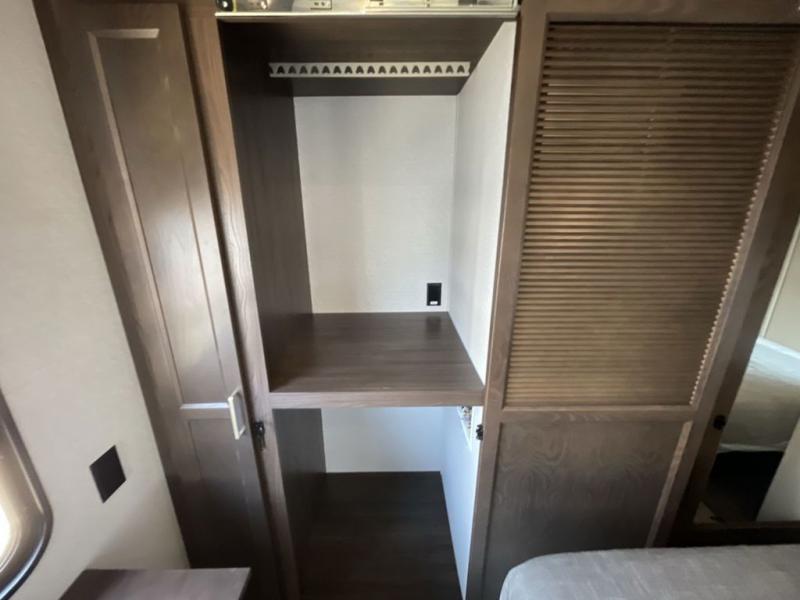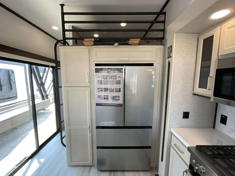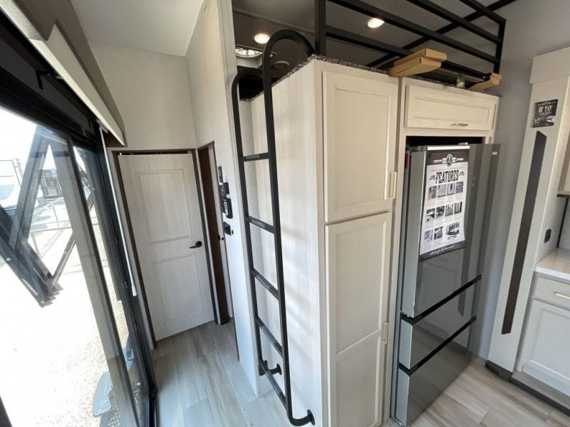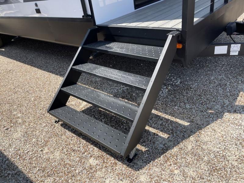 If you need more sleeping or storage space, this destination trailer is the one for you! There is a front covered porch with sliding glass doors that enters in to the front living area. Here, you'll enjoy relaxing on the sectional hide-a-bed sofa across from the entertainment center and fireplace. The spacious bar top with two seats will provide a place to dine, and the middle kitchen is any chef's dream with its two pantries, spacious 20 cu. ft. 12V refrigerator, and plenty of counter space! When you're ready for your own space, you can retreat to the rear bedroom where you'll find a king bed slide out, a wardrobe, a dresser, drawers, and even washer and dryer prep. The comfort doesn't stop there! There is also a loft above the full bath that includes a ladder and a mattress, so you can use this space for more sleeping or storage space!