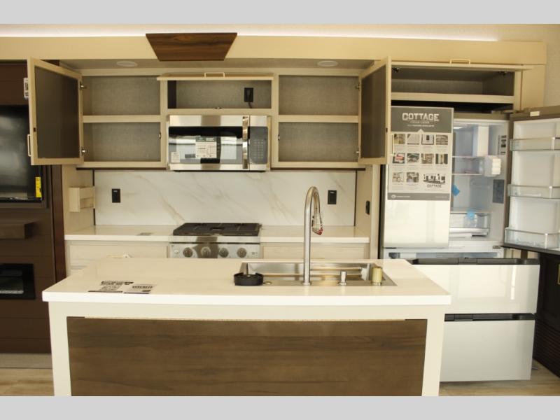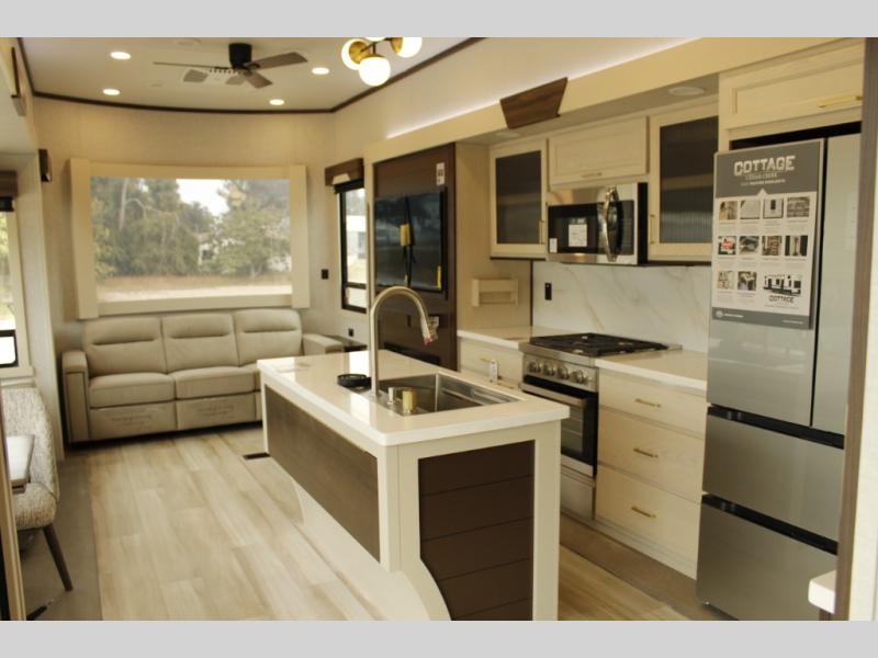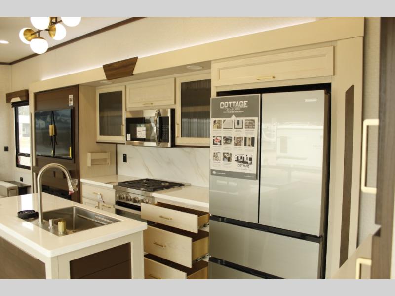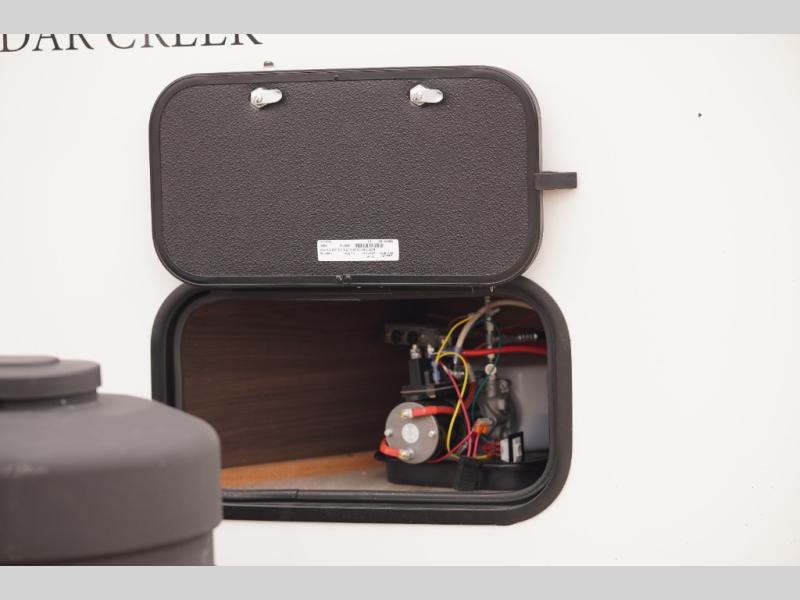 With any Cedar Creek Cottage destination trailer by Forest River, you can enjoy extended stays with residential features at the location of your choice! Each model is built with 3M bonded sidewalls that grow stronger with age and are resistant to UV, heat, oil, moisture, and more. There is also an AlphaPly TPO roof membrane, detachable entry steps, and new waterproof and bug proof Vixenite slide room floor panels for added durability. Head inside where you'll find residential dovetail, self-closing drawers, flush floor slides in the kitchen and living area, a residential style headboard and luxurious bedding decor, and extra storage for linens in the bedroom and bath. Each model is also pre-wired for satellite to the roof, and you can stay connected with the new Cradle Point WiFi/5G antenna and Day 1 connectivity.