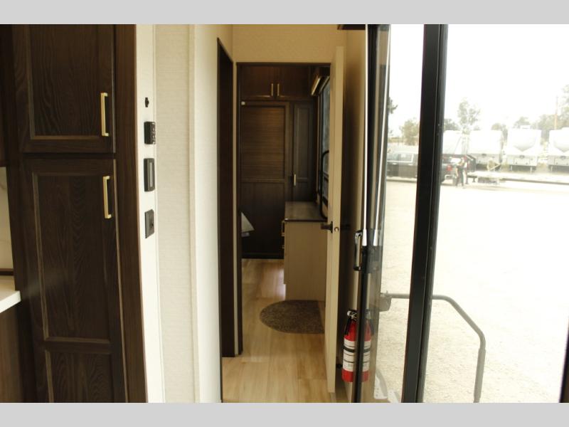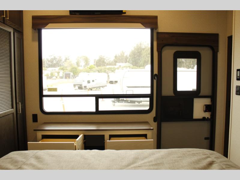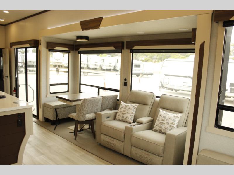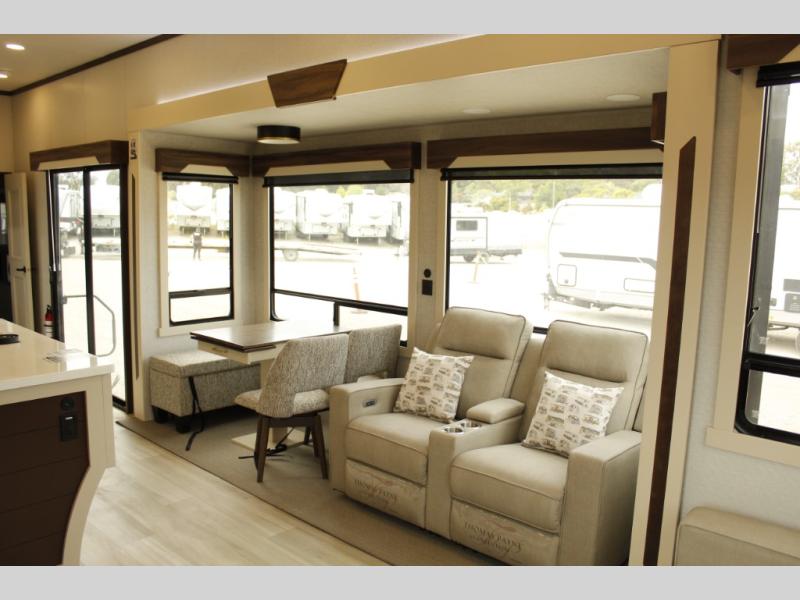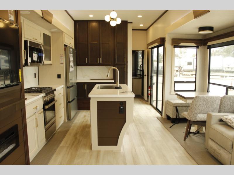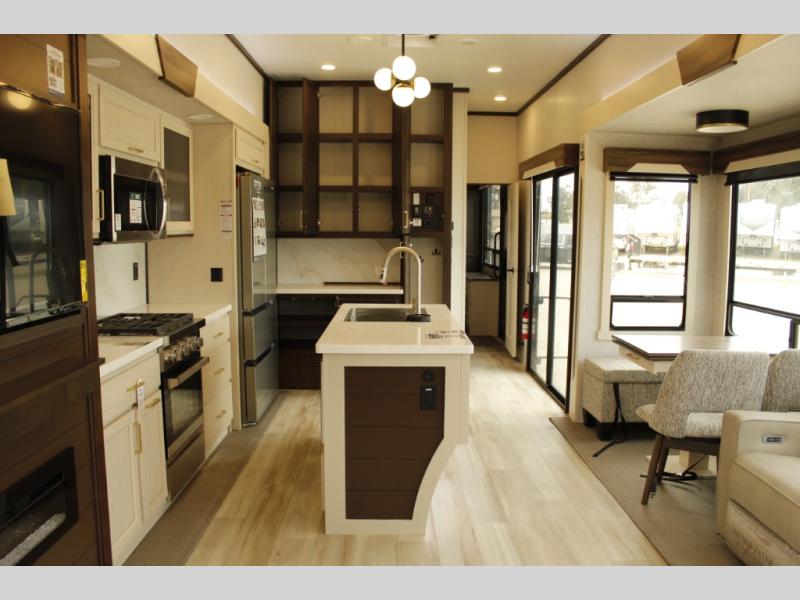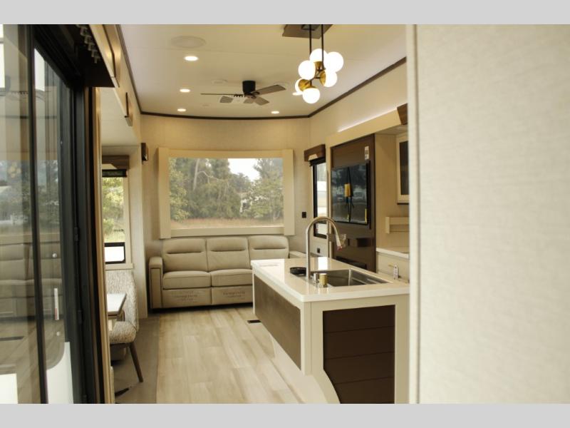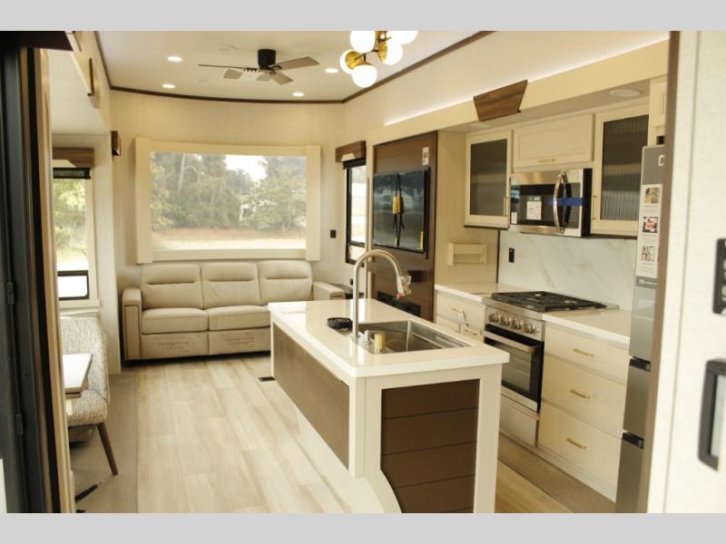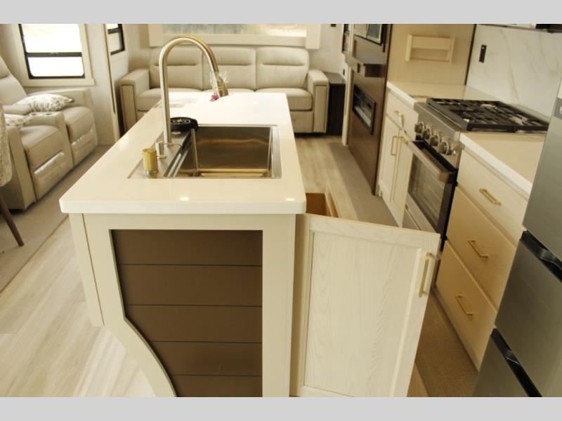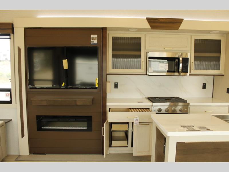 You're sure to feel right at home in this triple slide out destination trailer for four happy campers. The front private bedroom includes a king bed slide out, a large front wardrobe, and a dresser to keep your clothes organized. The full bath includes a shower skylight, extra storage for linens, and a Create-A-Breeze fan to keep air moving. The combined middle kitchen and living area will be a favorite place to visit together with its kitchen island and fold-down breakfast counter, free-standing table with an extension and an ottoman, and power theater seating. There is also a Murphy pantry behind the swivel mounted TV and fireplace for convenient storage, and a hide-a-bed sofa provides guests a place to sleep!